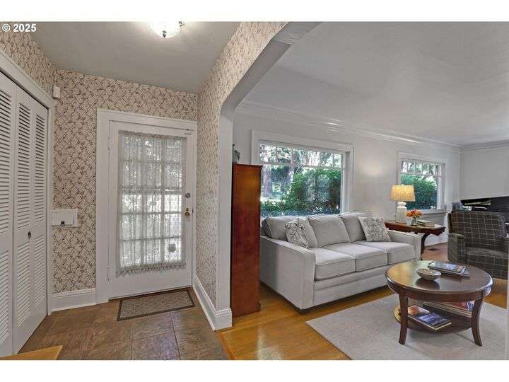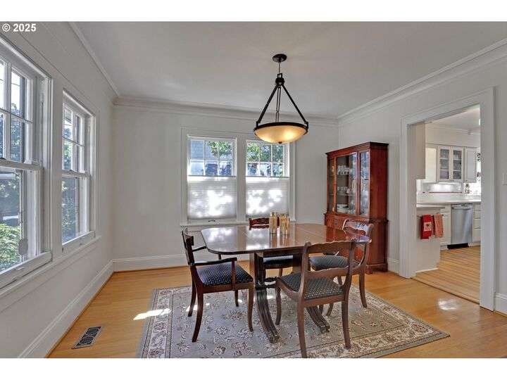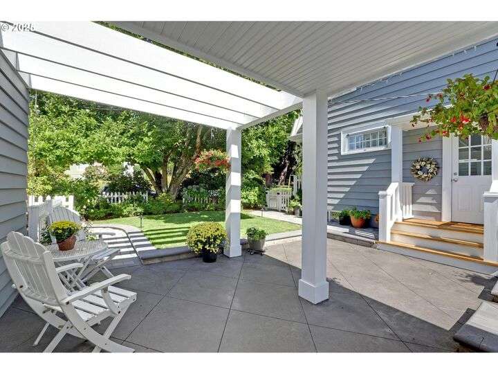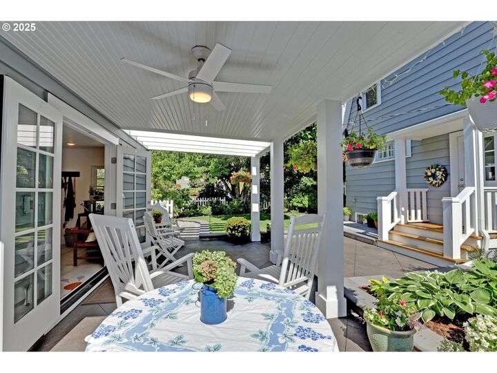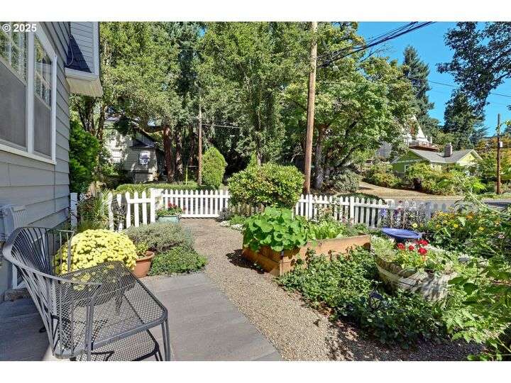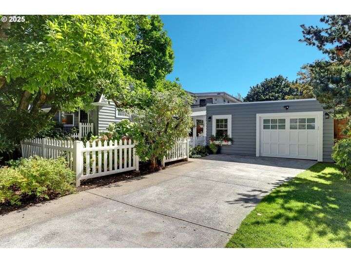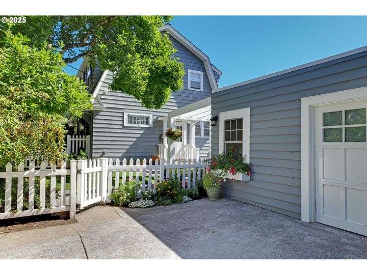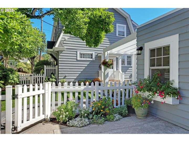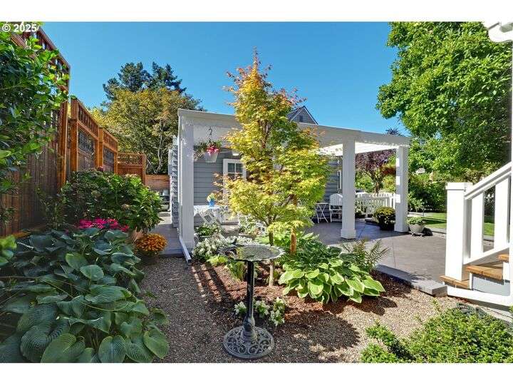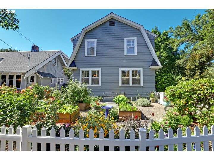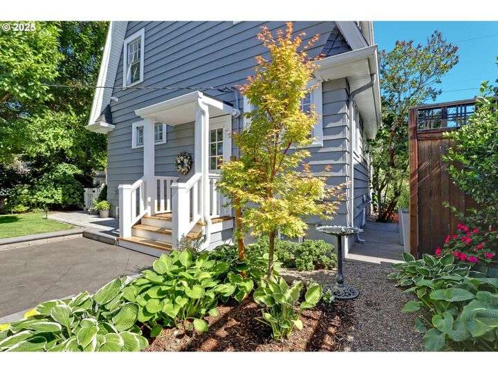 A storybook Colonial on an oversized corner lot in Beverly Cleary/Grant school neighborhood. This special home surrounded by lush gardens feels so good. Ideal floor plan with vintage features including arches, crown molding, and hardwood floors throughout the home. Extensive updates include seismic upgrade, wiring, plumbing, gas HVAC system, gas fireplace, and roof (2015). A newly (2024) renovated detached garage offers single car parking with EV charging and a unique hospitality/kitchenette/studio/garden room opening to the inviting covered patio for year-round entertaining. The east garden benefits from morning sunlight for growing vegetables and flowers. This desirable location is convenient to stores, restaurants, services, and parks. [Home Energy Score = 3. HES Report at https://rpt.greenbuildingregistry.com/hes/OR10241950]