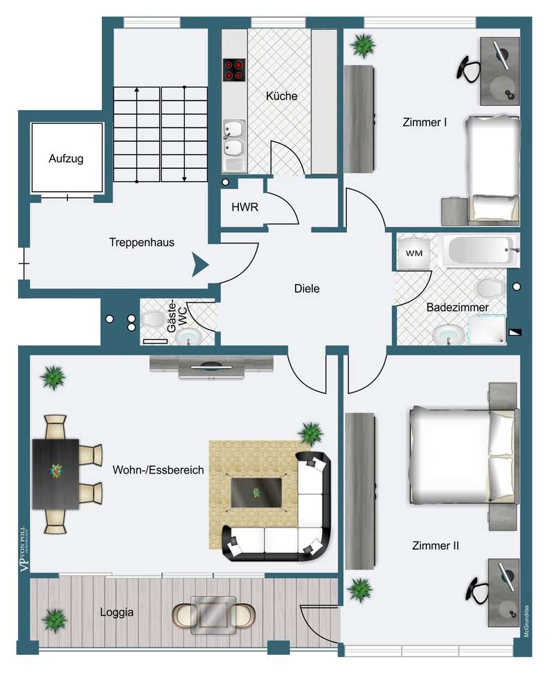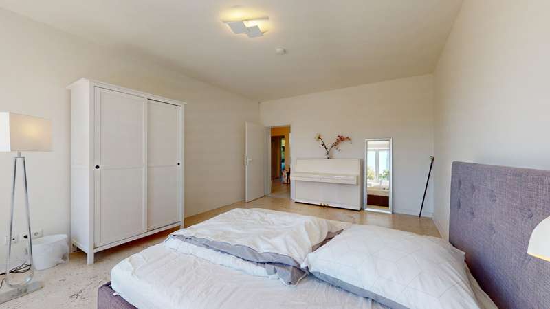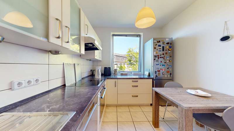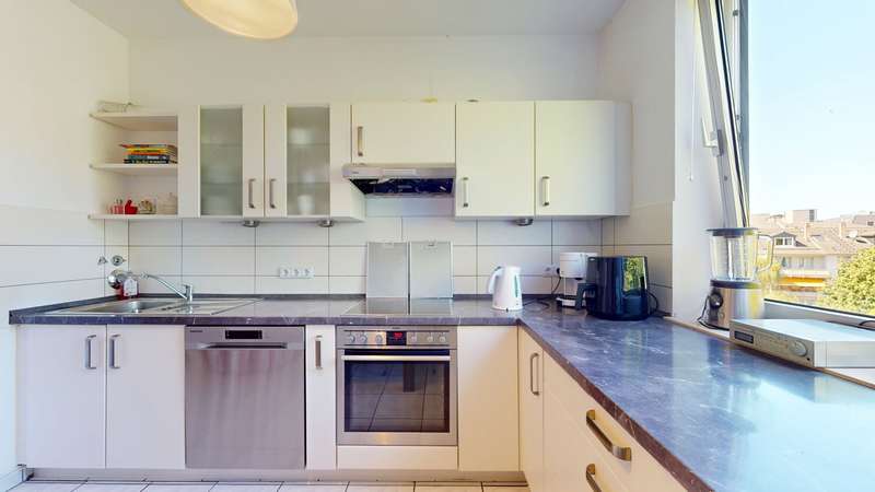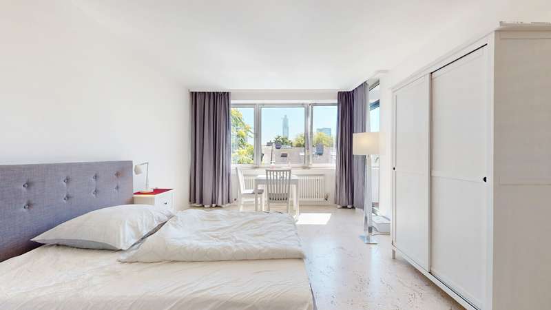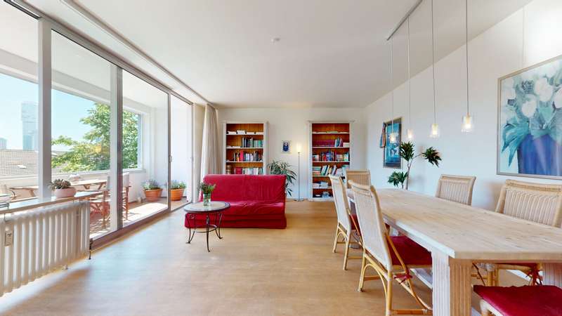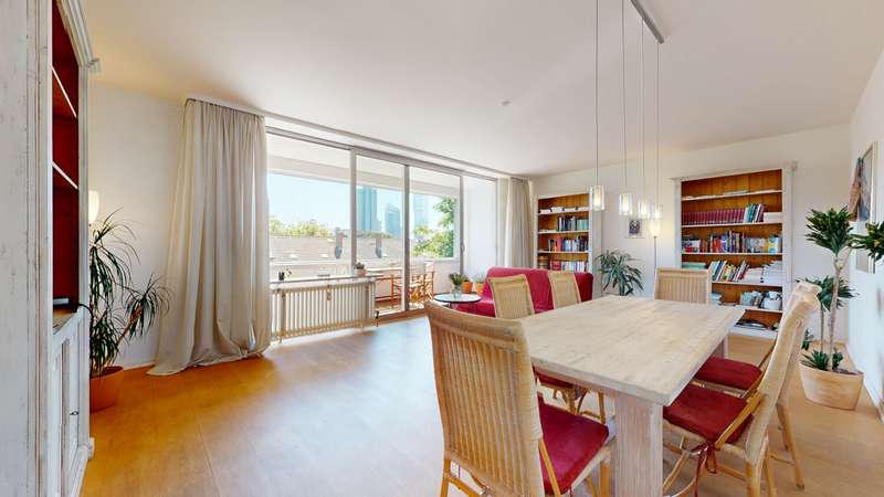 This light-flooded three-room apartment is located on the 5th floor of a well-kept apartment building and is easily accessible by elevator. The picturesque Palmengarten, Grüneburgpark and Frankfurt's lively city center are just a few minutes' walk away. The sought-after location in Westend boasts an excellent infrastructure with numerous shopping facilities, cozy restaurants, excellent public transport connections and green retreats in the immediate vicinity. The apartment has two well-designed bedrooms and a spacious living/dining area with an open-plan layout that invites you to linger. From here, you have direct access to the sunny loggia, which offers a magnificent view of the Frankfurt skyline. Large window fronts in all rooms create a bright, friendly living atmosphere and underline the pleasant feeling of space. Another highlight is the lovingly landscaped communal garden, which is available to all residents and invites them to relax in the greenery. Six parking spaces are jointly owned by the apartment owners. This apartment has the right to use one parking space.