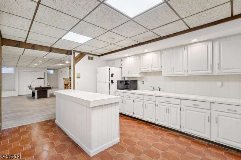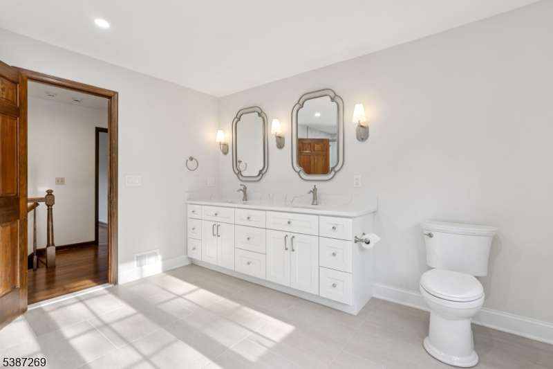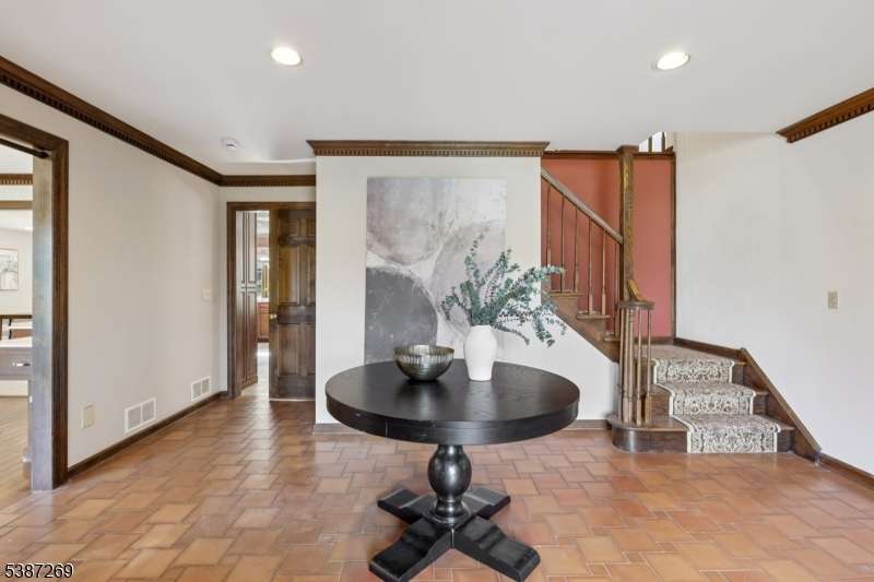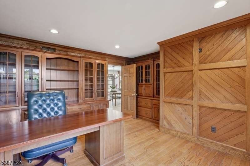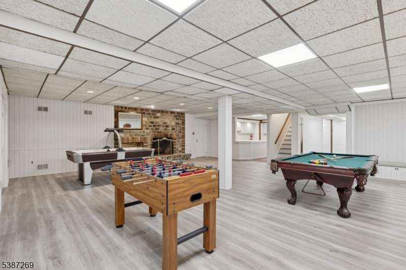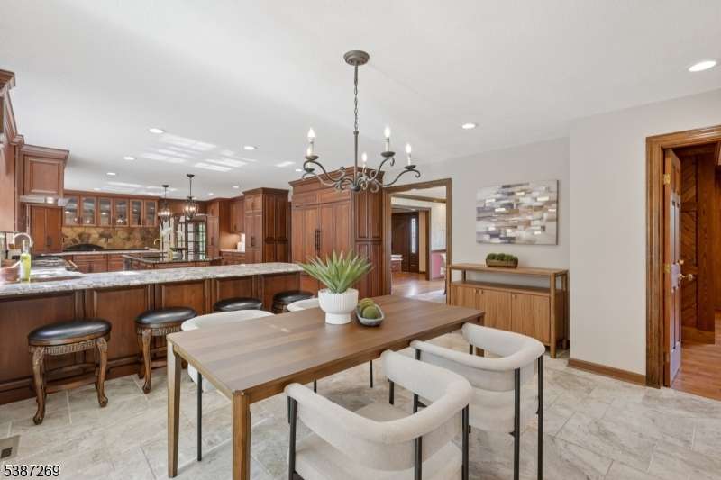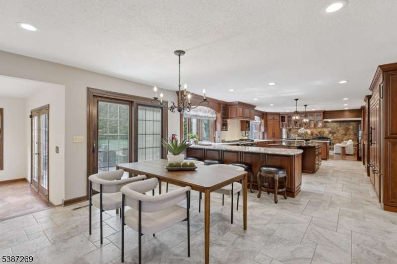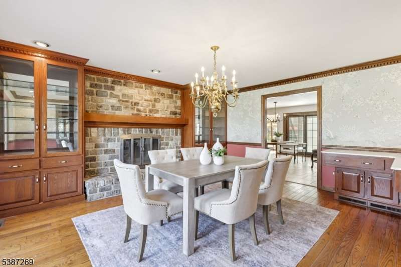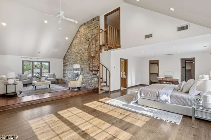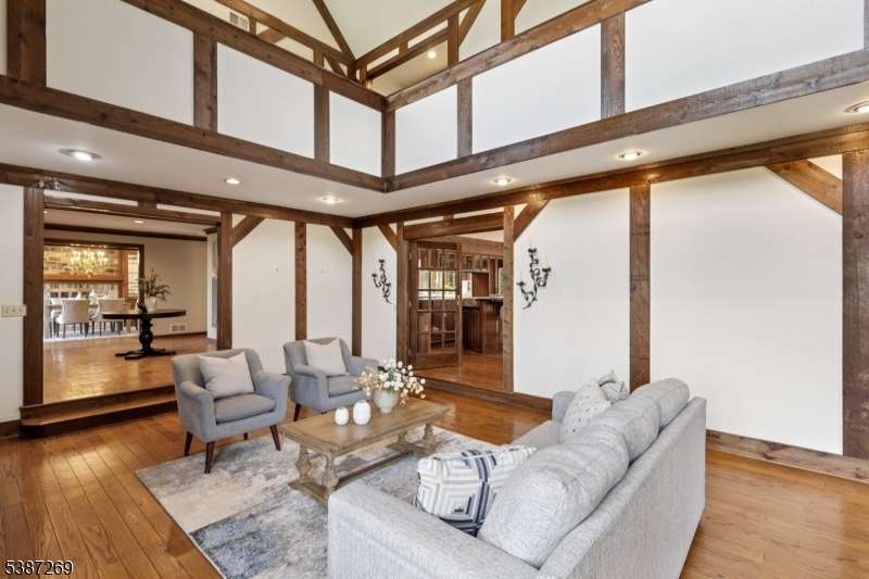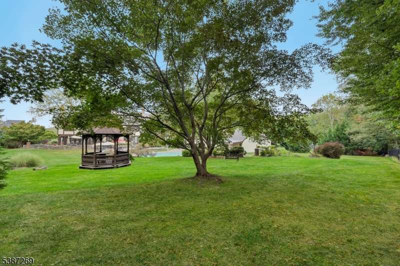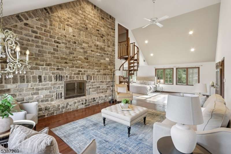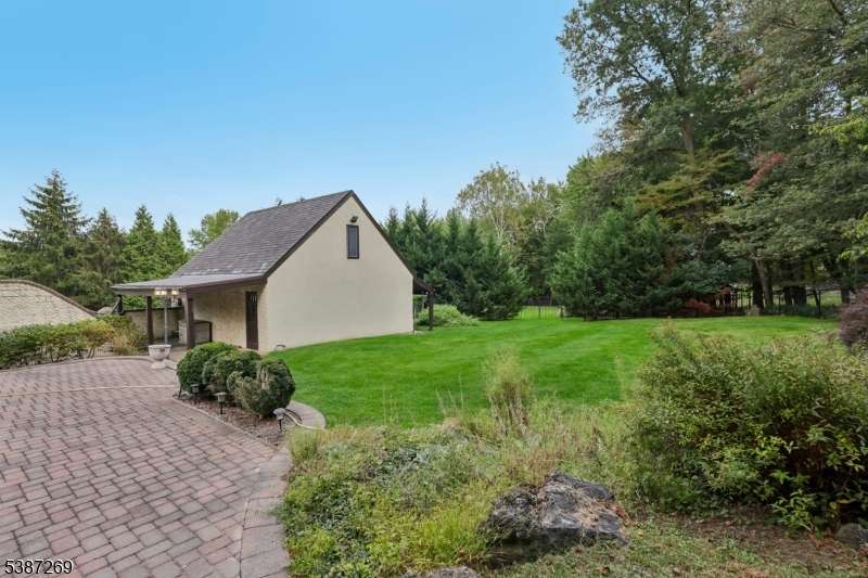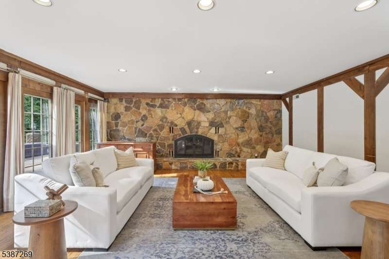 This exceptional 5-bedroom, 5.1-bath estate is a rare find, blending architectural interest with inspired design and functionality. Nestled on a quiet cul-de-sac in one of Scotch Plains' most desirable neighborhoods, it sits on 1.34 park-like acres with amenities for entertaining and everyday living. A striking stone exterior opens to expansive rooms, hardwood floors, five fireplaces, and a dramatic two-story living room with a spiral staircase to a wrap-around library. The chef's kitchen, renovated in 2019, features a 60" Lacanche range imported from France, dual Sub-Zero refrigerators, two dishwashers, and custom cherry cabinetry. The luxurious primary suite offers dual walk-in dressing closets, a spacious sitting area retreat with fireplace, and a private spiral staircase to a loft, creating a true spa-like escape. Multiple formal and informal living spaces make gathering easy. The third floor and finished lower level provide additional retreats, including two bedrooms, a full kitchen, wet bar, full bathroom, entertainment areas, game rooms, exercise room, and separate garage entrance. Outdoors, enjoy a heated in-ground pool and spa, three patios, a gazebo with lighting and integrated sound system, professional landscaping, and privacy on all sides. Two garages accommodate five cars, with the detached garage offering a workshop and additional storage.