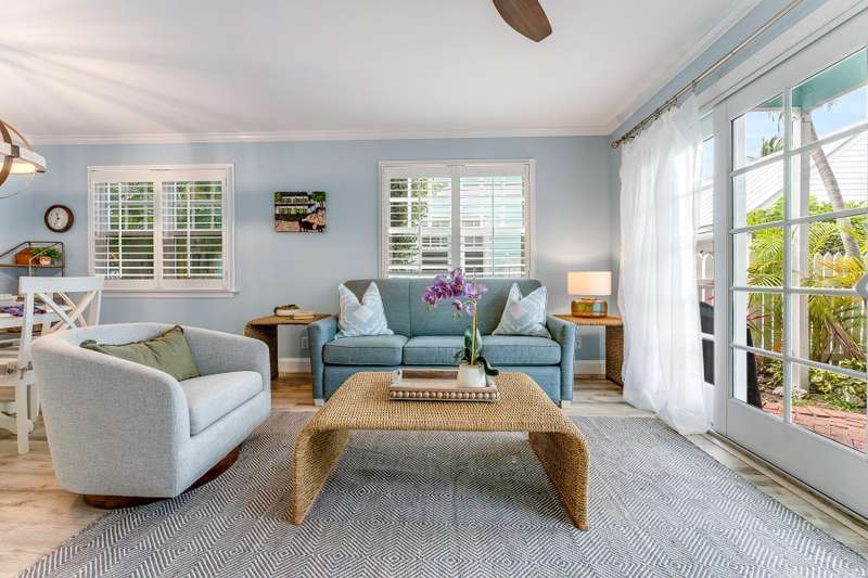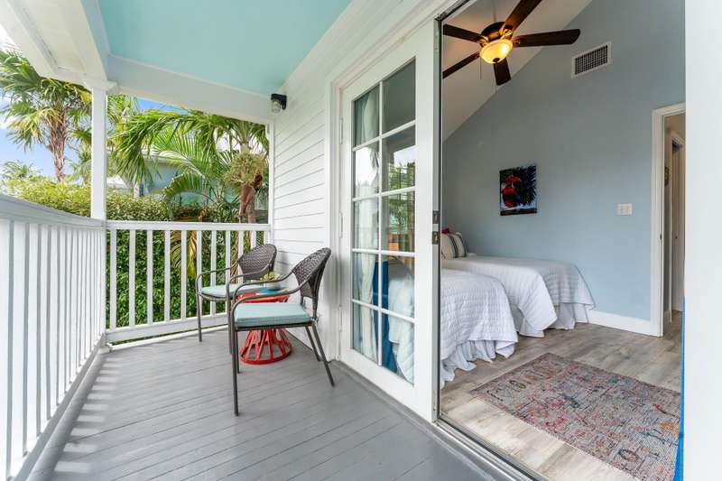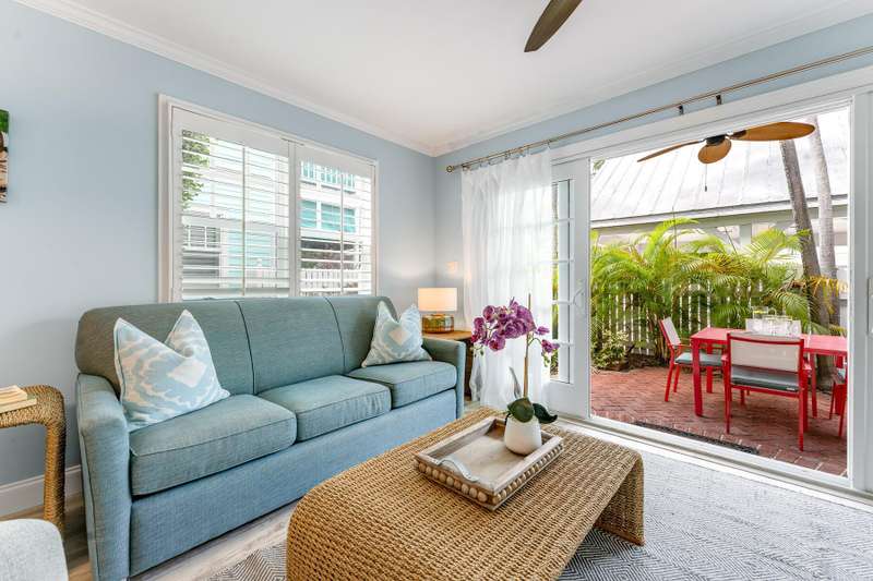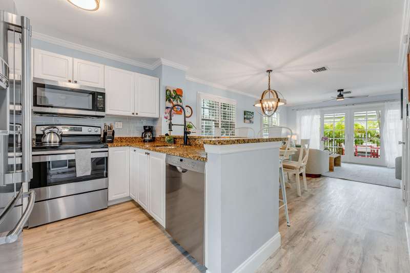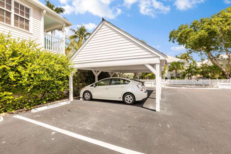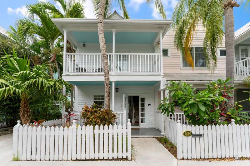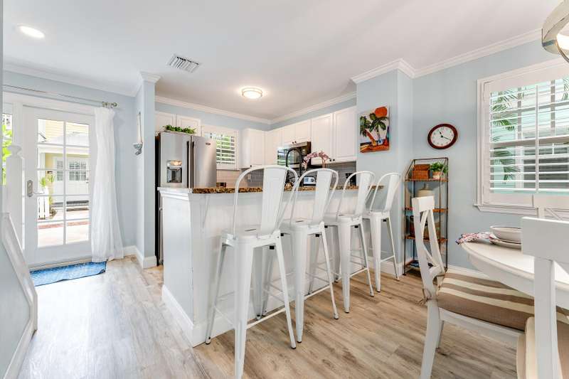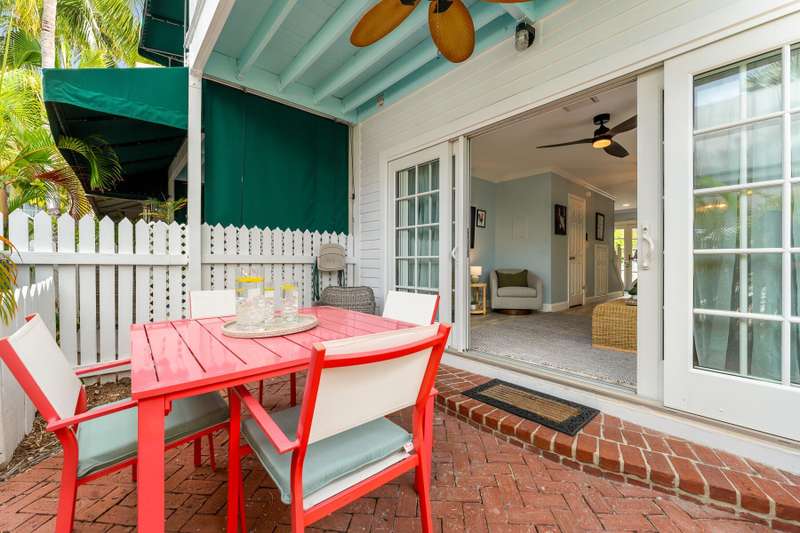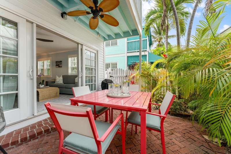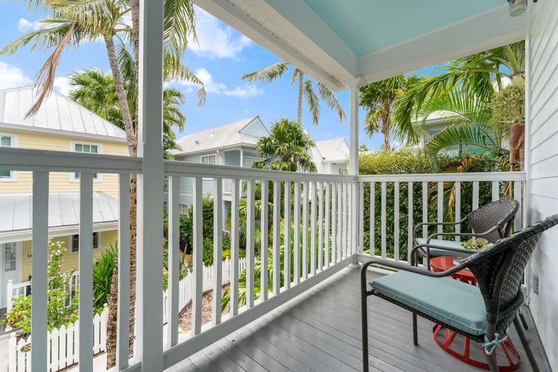 Charming townhouse situated on Porter Lane in Presidents Walk community of the Truman Annex. This bright and sunny end unit is in excellent condition and offers many renovations throughout. Enjoy an updated kitchen with stainless appliances, subway tile backsplash and granite countertops. Engineered wood-look LVT flooring is not only very attractive but also extremely durable. Impact doors and windows throughout are finished in plantation shutters and offer peace of mind, soundproofing and efficiency. Enjoy an open concept floor plan and a wall of sliding glass that opens to a charming brick patio. Upstairs features two bedrooms each with covered balconies. A large shared bathroom has been fully renovated with double sinks and large capacity washer and dryer. Lastly enjoy the ease of a deeded off street parking spot right outside the unit.
