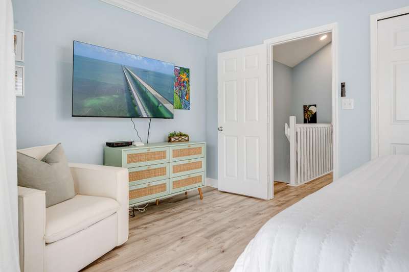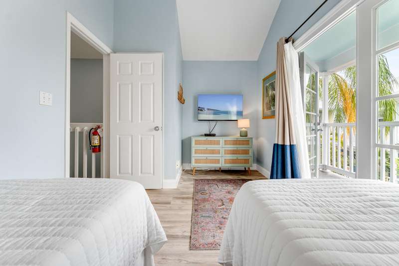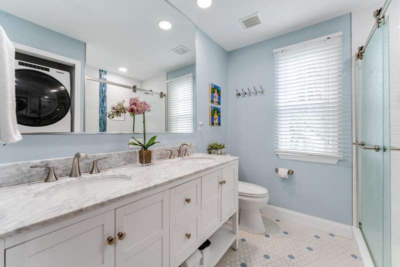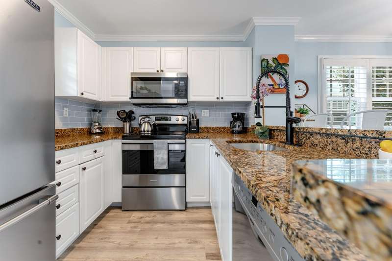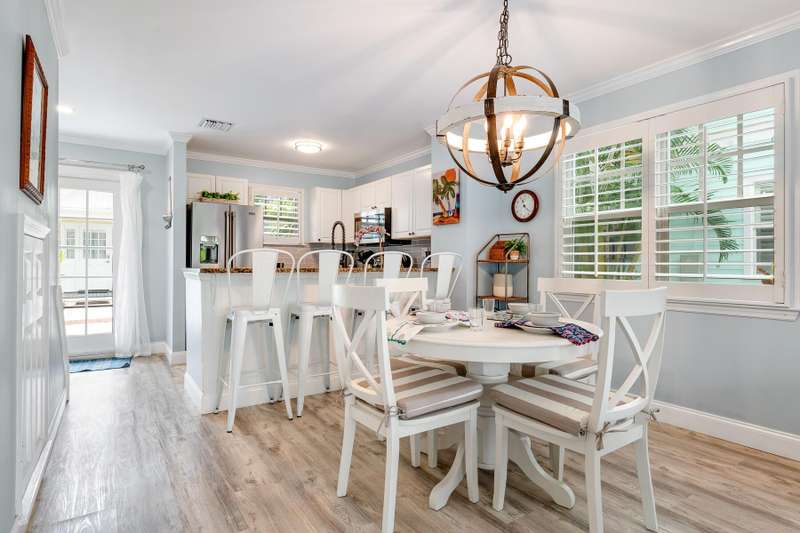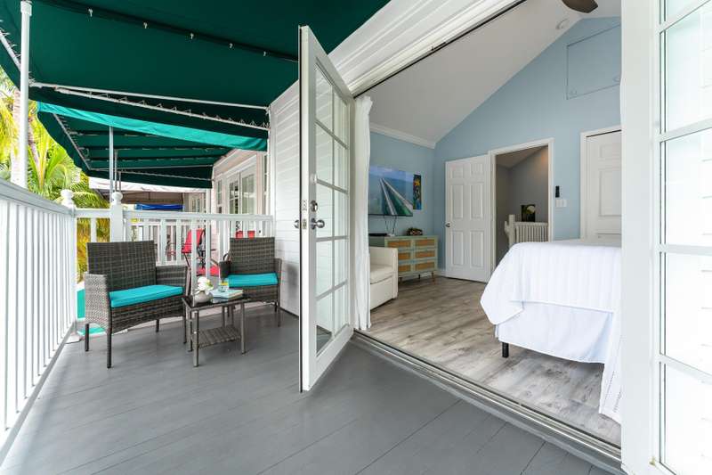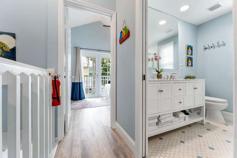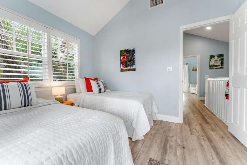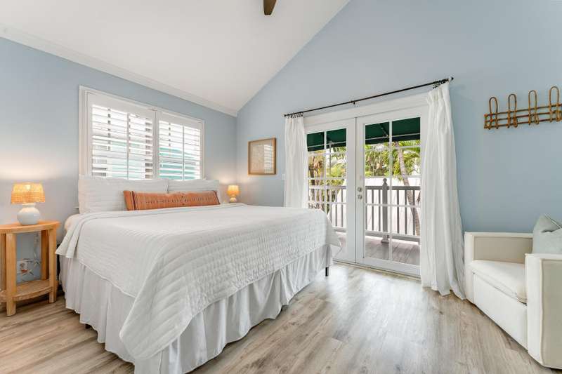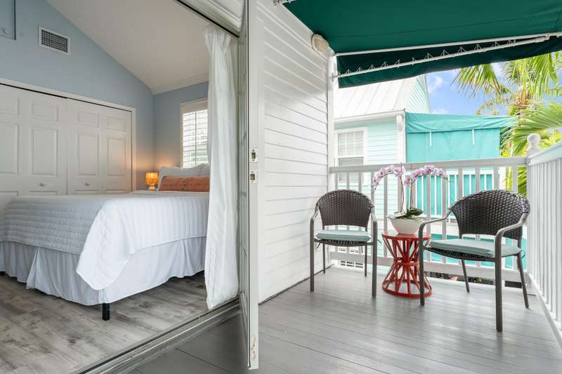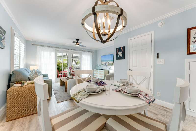 Charming townhouse situated on Porter Lane in Presidents Walk community of the Truman Annex. This bright and sunny end unit is in excellent condition and offers many renovations throughout. Enjoy an updated kitchen with stainless appliances, subway tile backsplash and granite countertops. Engineered wood-look LVT flooring is not only very attractive but also extremely durable. Impact doors and windows throughout are finished in plantation shutters and offer peace of mind, soundproofing and efficiency. Enjoy an open concept floor plan and a wall of sliding glass that opens to a charming brick patio. Upstairs features two bedrooms each with covered balconies. A large shared bathroom has been fully renovated with double sinks and large capacity washer and dryer. Lastly enjoy the ease of a deeded off street parking spot right outside the unit.