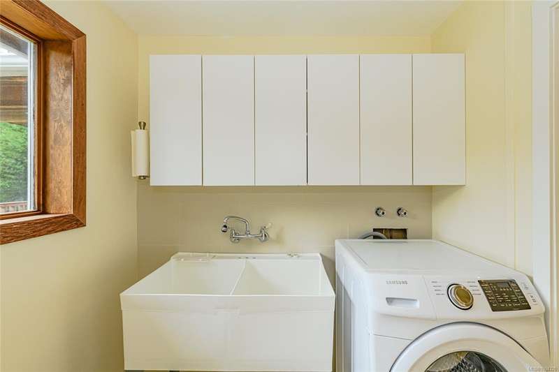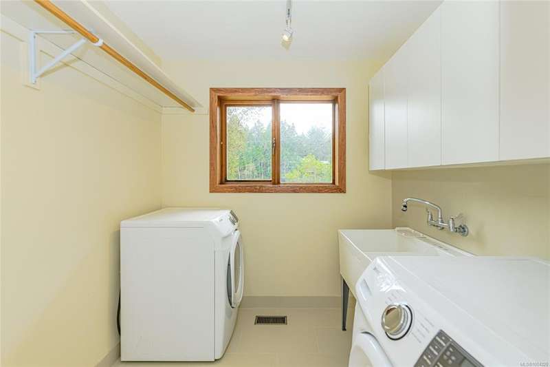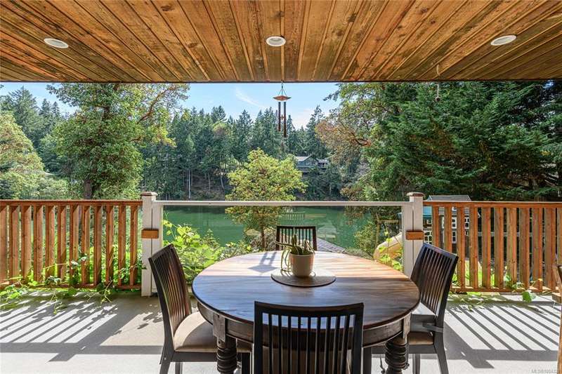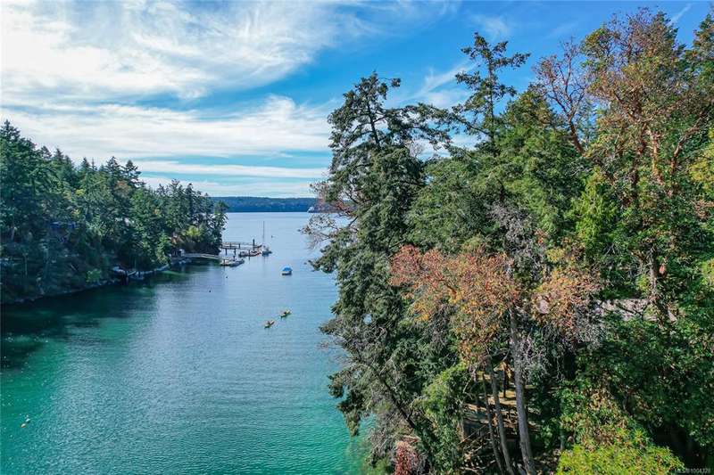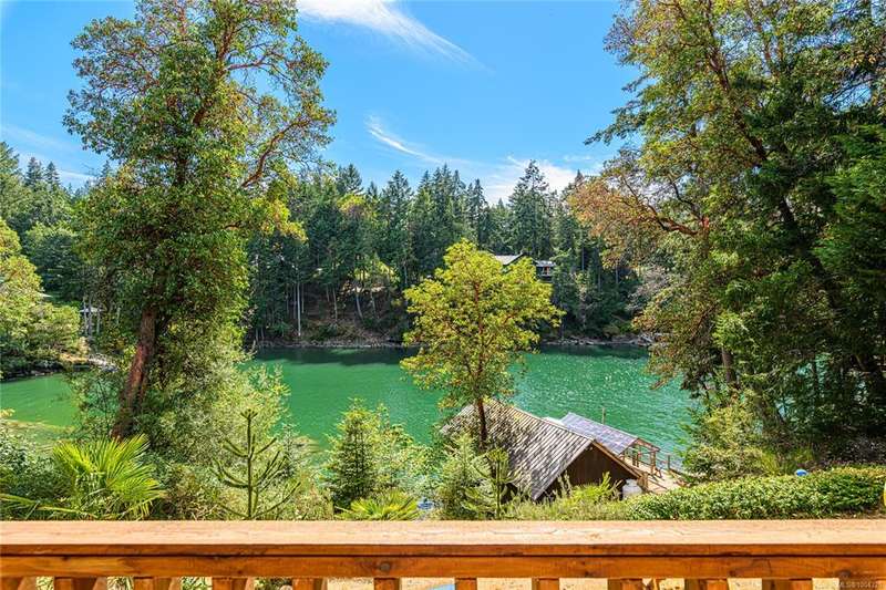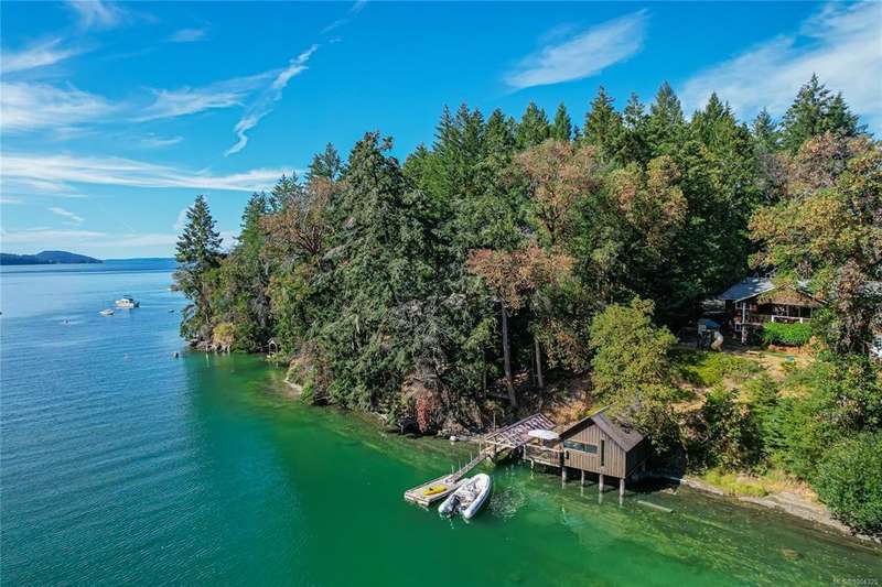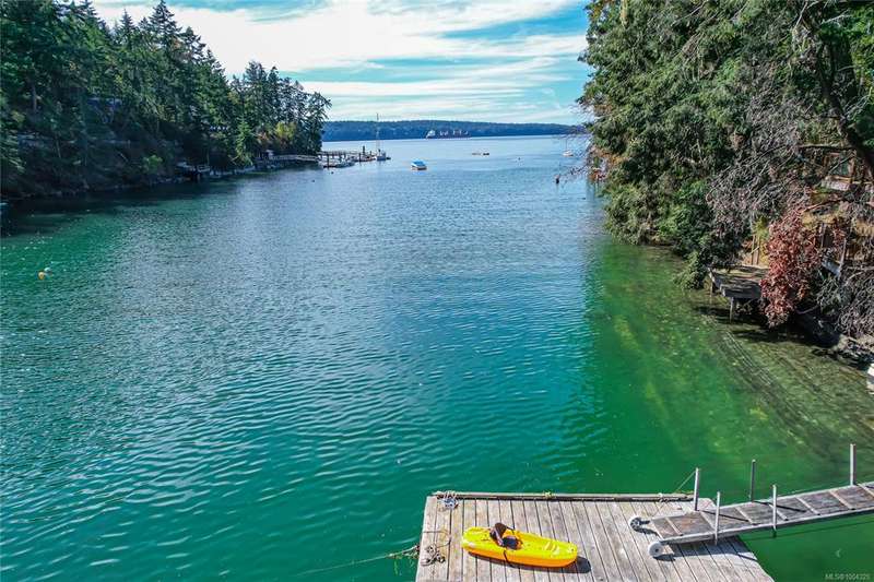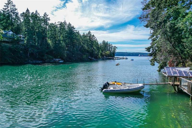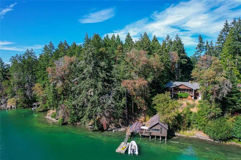 Calling all water enthusiasts! This well-built, upgraded 4 bedroom plus office, 3 bathroom waterfront home on a southwest-facing property with 100+ feet of frontage on the tranquil Southey Bay is in move-in condition. One can live entirely on the main level with 2 bedrooms, an office, 2 bathrooms, an open-plan brand new kitchen, and dining room with a covered deck overlooking the bay. Spread out with guests on the walk-out lower level with a family room, bedroom, bathroom as well as storage. Attached is a 2-car garage wired for EV charging, a small detached workshop, and a garden storage shed. Most unique and exciting is the 1960's boat house perched directly above the emerald green water with an adjacent boat launch sized for boats up to 20 feet. At high tide, Southey Bay appears like a sheltered lagoon, spectacular for swimming, watching island bird and marine life, boating, paddling, and kayaking. Truly one of the most usable waterfront properties on the market.