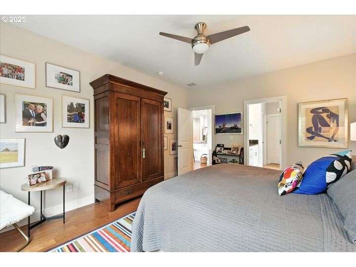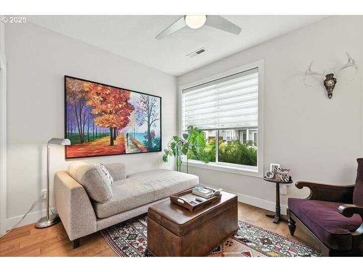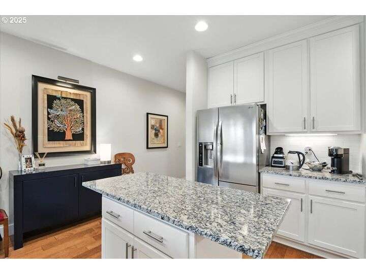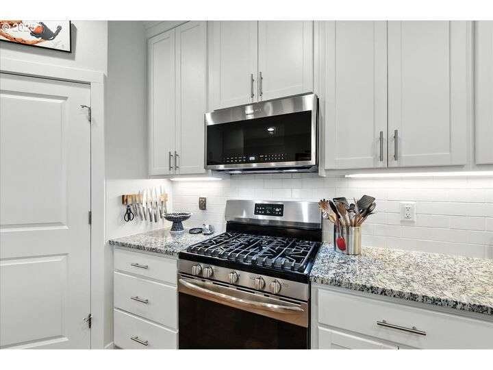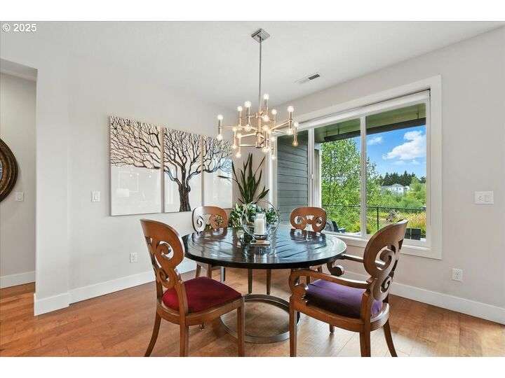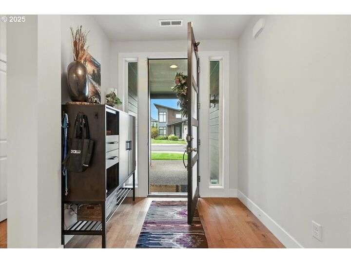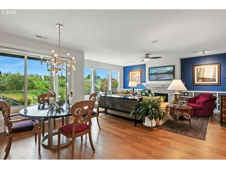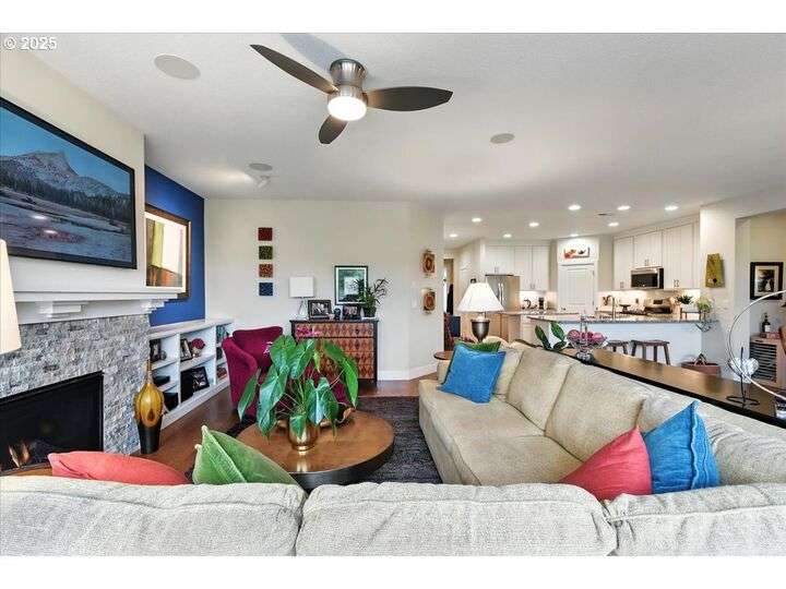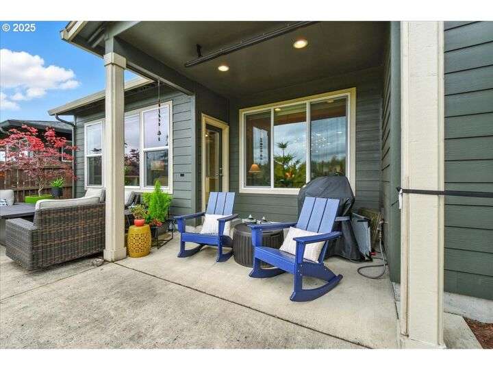 Modern design and effortless living come together in this stunning single-level home with amazing greenspace views. Soaring 9’ ceilings and engineered hardwoods set the stage for a spacious great room with a cozy gas fireplace, built-ins, and a surround sound system. The kitchen shines with dual islands, soft-close custom cabinetry, a pantry, and stainless steel appliances—perfect for both daily living and entertaining. The private primary suite offers a true retreat with a walk-in closet and spa-inspired ensuite featuring granite and tile finishes. Step outside to a covered patio with tranquil greenspace views, and enjoy low-maintenance living with a fenced yard, front sprinklers, xeriscaped backyard, and HOA-covered front yard mowing. The garage features built-in cabinets and is EV-ready with Level 2 charging. Conveniently located near shopping and amenities, this home perfectly blends convenience and sophistication.