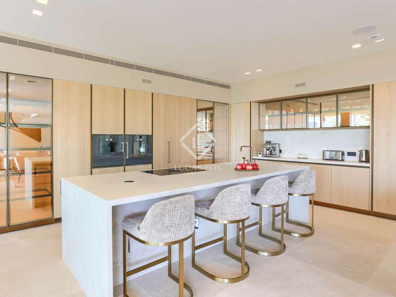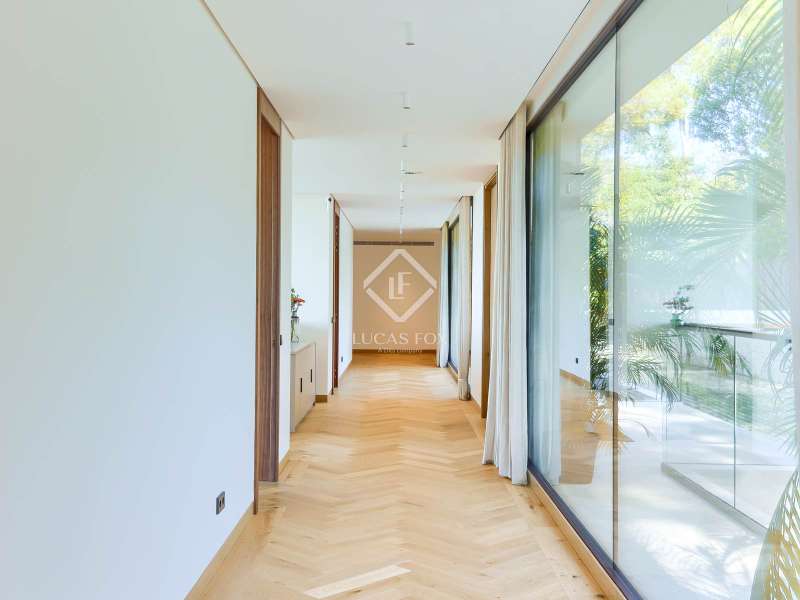 This newly built modern villa is unlike any other in Portals Nous, one of the most prestigious locations in the southwest of Mallorca. Set on a generous landscaped plot, the property offers a rare combination of privacy, architectural elegance, and contemporary Mediterranean style, creating a residence of true distinction. From the outset, this home sets itself apart. Designed by a prestigious architectural team, it embodies modern sophistication with open-plan interiors, floor-to-ceiling windows, and seamless transitions between the living spaces and the outdoors. The villa’s unique double-access design underscores its exclusivity: a discreet rear entrance leads directly to the bedroom level, while the impressive lower-level entrance reveals a standout feature – an expansive garage with exceptional capacity, complemented by a fully equipped gym, private spa, and wine cellar. Across its three levels, the villa offers seven bedrooms and eight bathrooms, each designed for comfort and independence. The primary suite crowns the upper floor with panoramic sea and mountain views, walk-in wardrobes, and a spa-style bathroom with freestanding bathtub. Additional suites on each floor ensure maximum privacy for family and guests, with one opening onto its own terrace and two located on the lower level – ideal for extended stays or visitors. The outdoor areas have been designed as extensions of the living space, centred around a striking saltwater infinity pool surrounded by landscaped gardens, sunbathing terraces, and dining areas. A covered terrace with a fully equipped summer kitchen provides the perfect setting for entertaining year-round in complete seclusion. Every detail has been carefully considered, from the lift connecting all floors to the underfloor heating, air conditioning, and premium finishes. The result is a unique property that combines scale, elegance, and privacy, offering not just a home but an unparalleled lifestyle in one of Mallorca’s most coveted addresses.