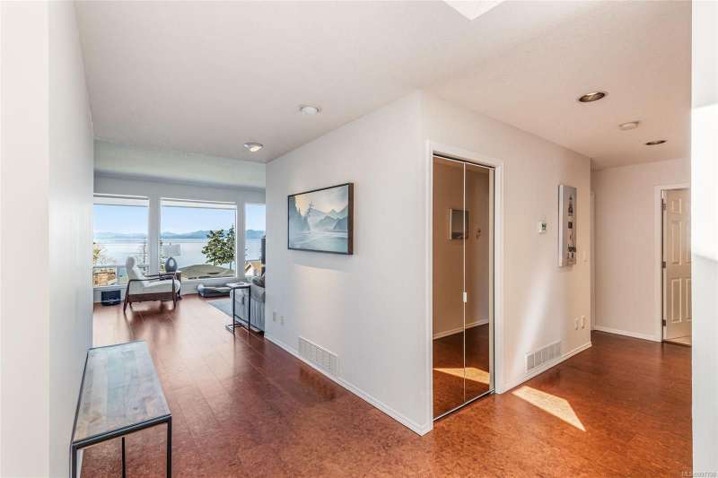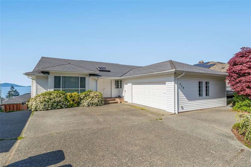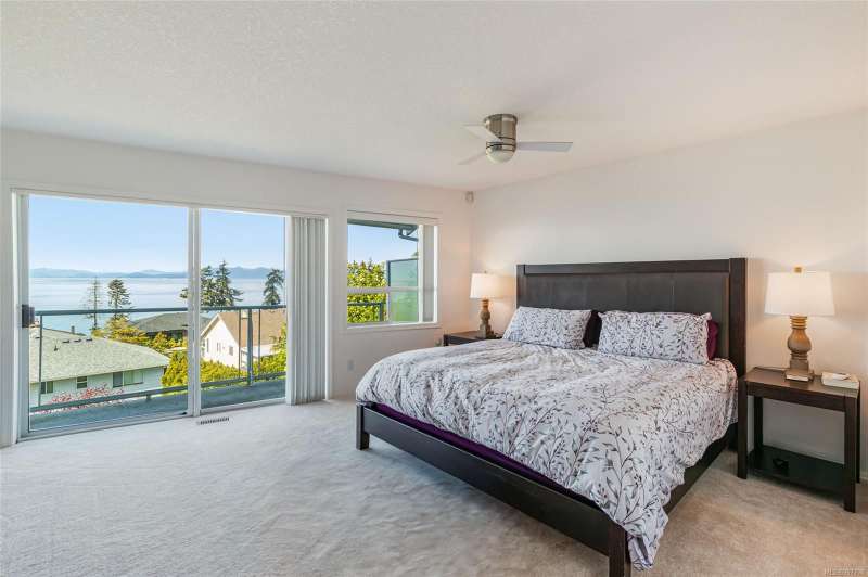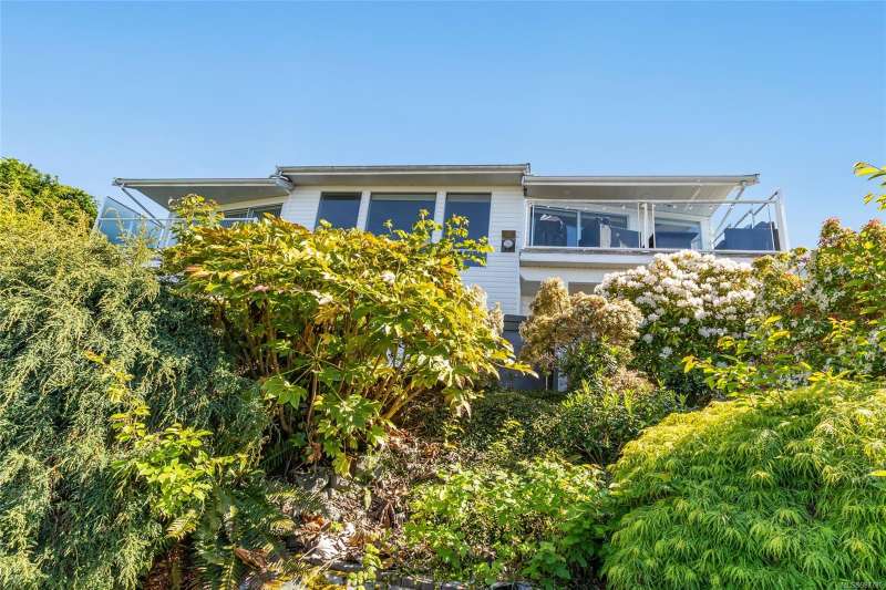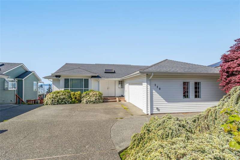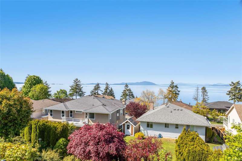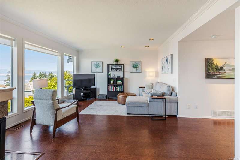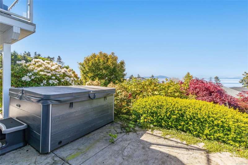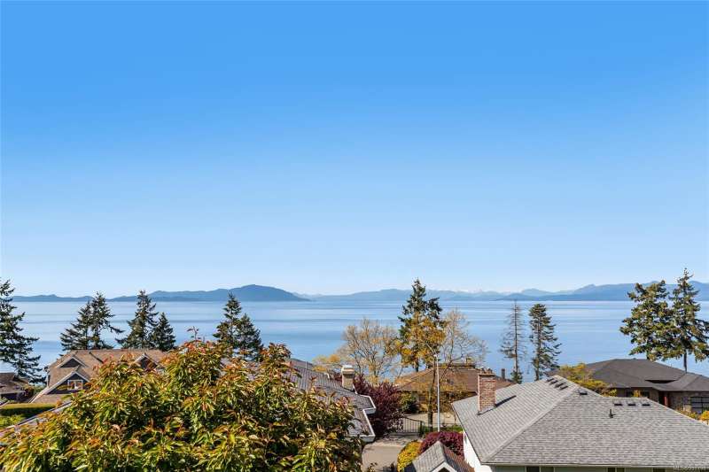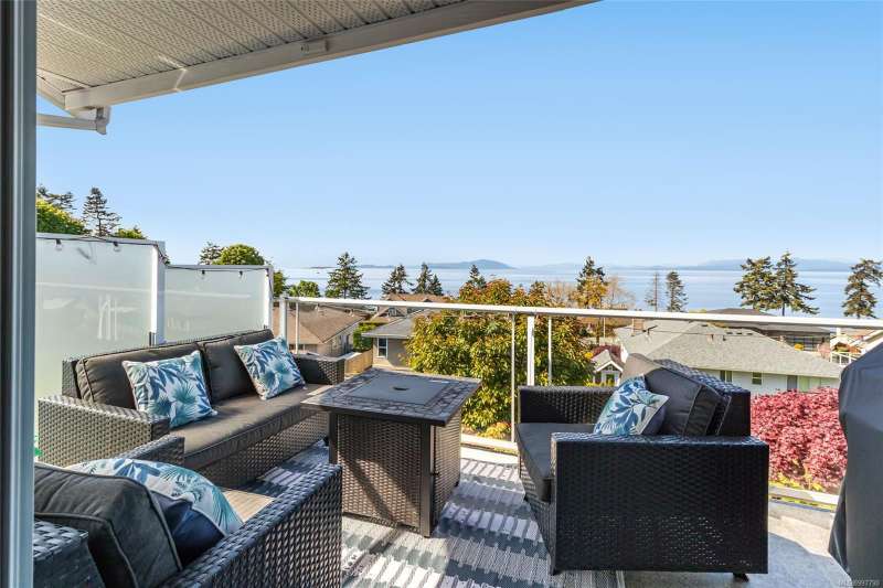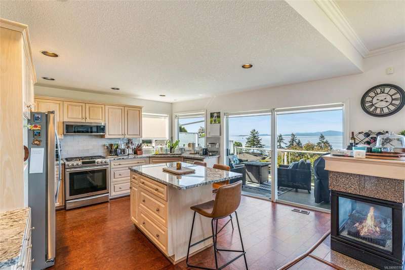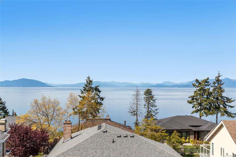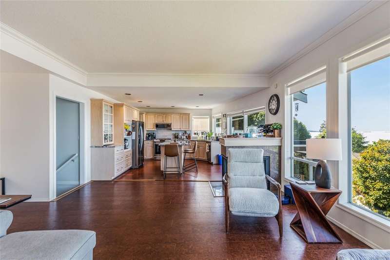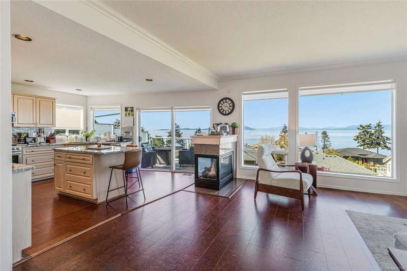 This exceptional family residence offers sweeping ocean views, thoughtfully designed. Expansive windows, two generous decks, and a walk-out patio with a hot tub. The main level showcases an open-concept layout, connecting the elegant kitchen and welcoming living area, which are anchored by a striking three-sided gas fireplace. The kitchen features classic oak cabinetry, granite countertops, and premium stainless-steel appliances. The spacious primary bedroom includes a private ocean-view deck and a well-appointed 4-piece ensuite. Upgrades over the years includes a new heat pump, furnace, electrical panel, updated plumbing, renovated bathrooms, and a refreshed lower-level family room. Adding further value is the 840 sq ft two-bedroom plus den suite, complete with a modern kitchen, full bathroom with in-suite laundry, and a private covered patio with panoramic water views—ideal for multi-generational living or as a desirable rental opportunity.