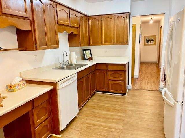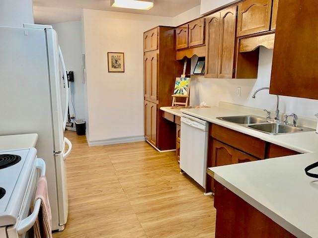 "Evergreen Village" this spacious 2-bed, 2-bath unit offers comfort and convenience in a prime location—steps from shopping, transit, and dining. A welcoming hallway leads to an open living room and dining area, while the functional kitchen features white appliances. The primary bedroom boasts a 2-piece ensuite, with a second bedroom just off the living space. Enjoy in-suite laundry with storage, abundant natural light from North & East-facing windows, and a generous East-facing balcony. Laminate flooring, updated toilets, and fresh paint throughout. This 55+ community (only one partner needs to be 55 yes you can have your children here ) features top-tier amenities: an indoor pool, hot tub, workshop, R/V parking, and included heat & hot water. A fantastic commuting location—act fast!