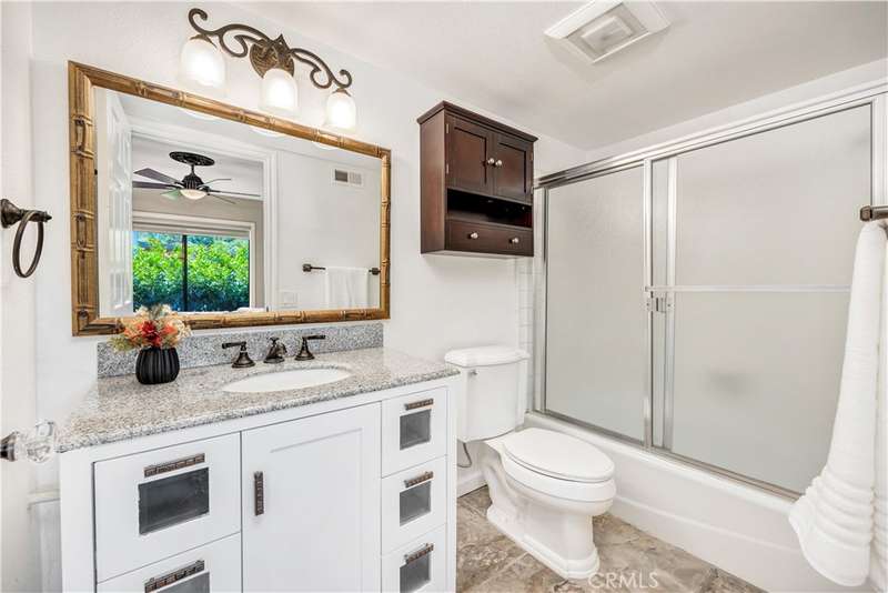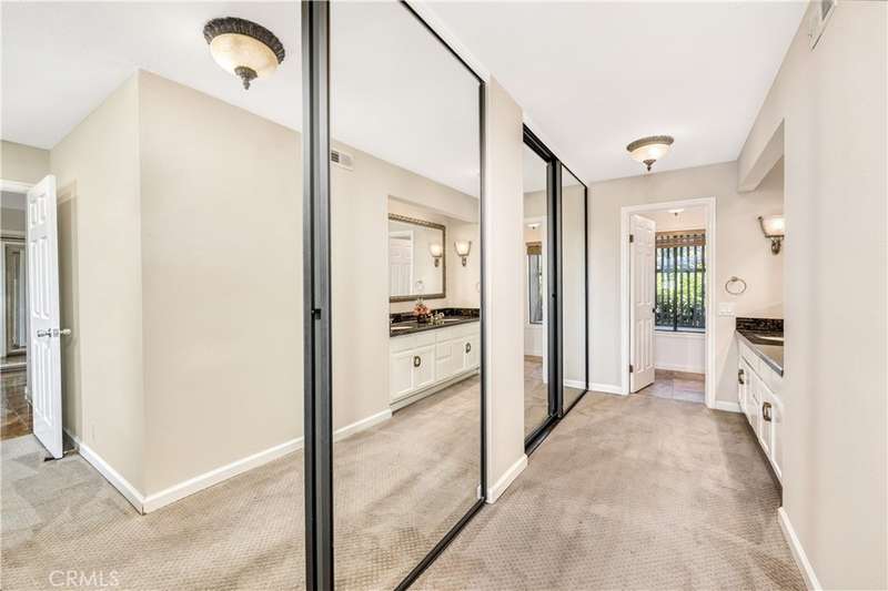 The primary bedroom is very spacious and bright with a cathedral ceiling. The amazing views from the oversized window turn this space into a wonderful personal retreat. The primary bathroom has a large window which brings in an ample amount of natural light creating a comfortable and bright space. This bathroom is outfitted with double vanities and a walk-in shower and contains an abundant amount of closet space. The second bedroom has an ensuite bathroom with a single vanity and a tub and shower combo. Multiple built-in closets throughout the unit provide an ample amount of storage space. In addition, the condo includes a two-car detached garage with a shelving system for additional storage. No Mello Roos!
