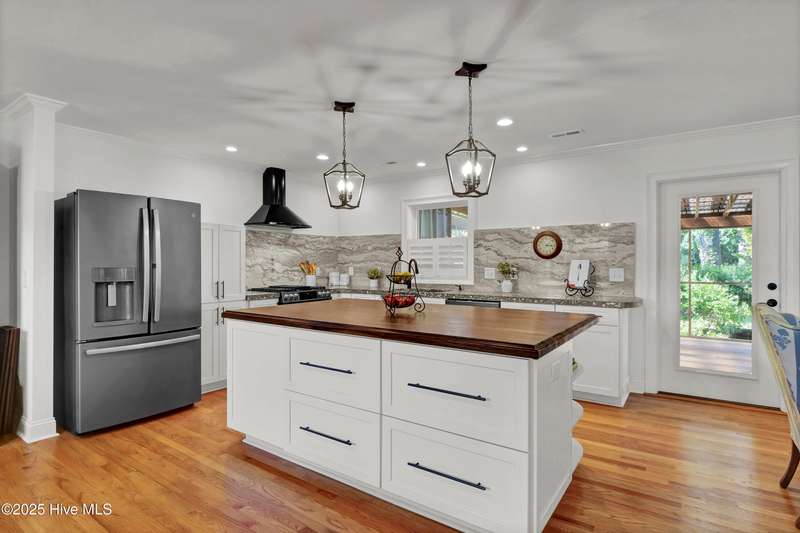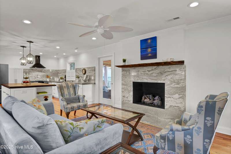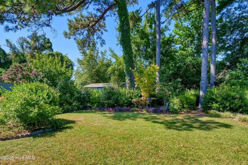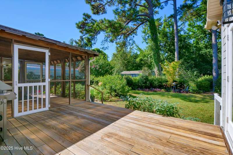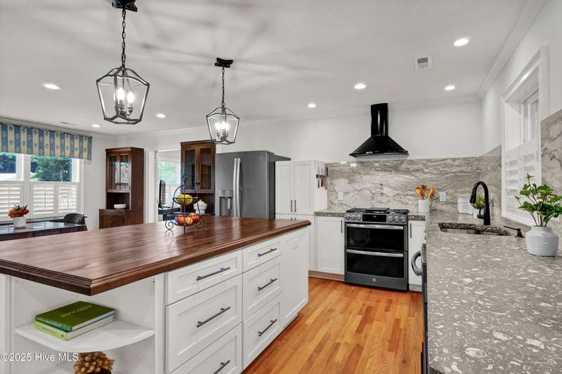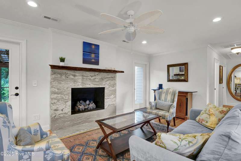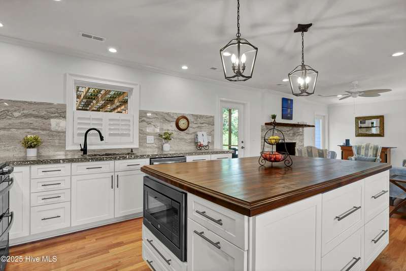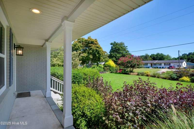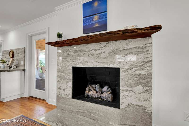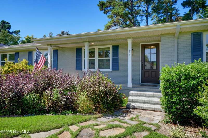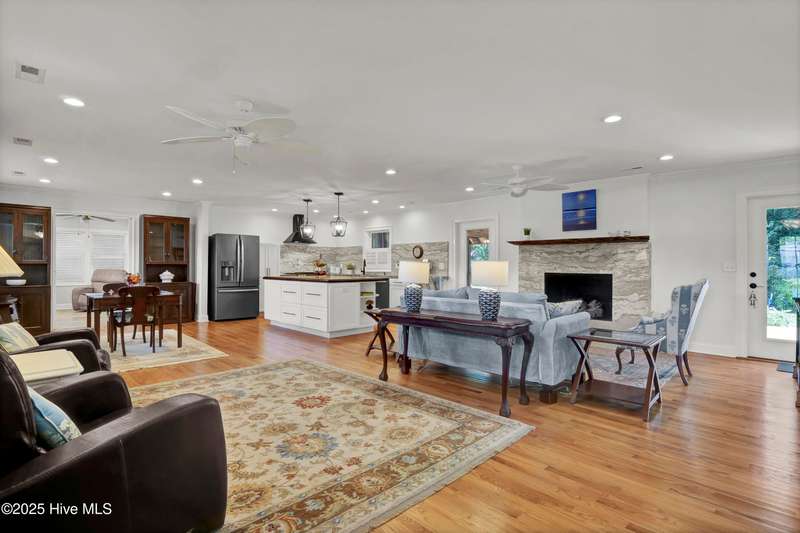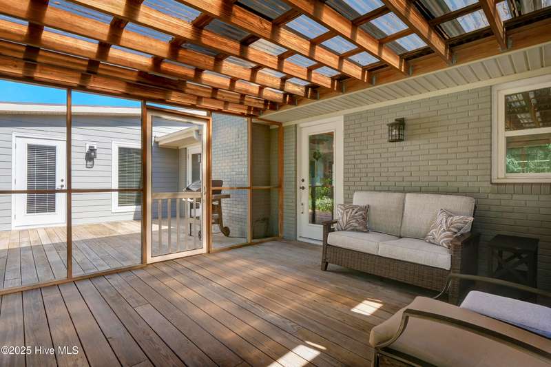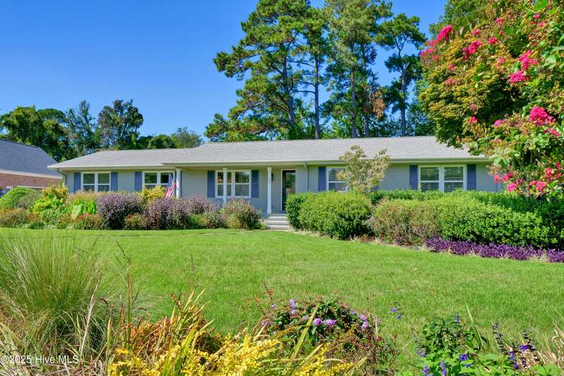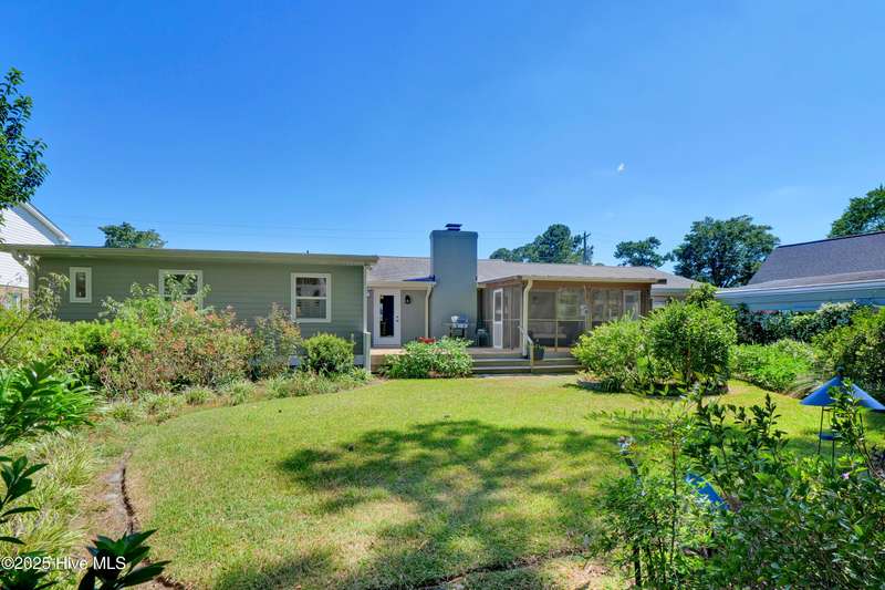 A timeless design extensively renovated down to the studs in 2018. This home is in a prime location with an open concept featuring roomy L-shape kitchen with formed concrete counter top with oyster shell inlay, granite backsplash and large island with Black Walnut top and extensive cabinet space below. The open living room is anchored by a gas log fireplace with granite surround and live-edge Black Walnut mantle. Back doors on either side of the fireplace lead to screened and open decks overlooking the backyard. A private owner's suite was built as part of the renovation and features a slanted vaulted ceiling, exterior door for deck access and an ensuite bathroom with walk-in shower, raised vanity with stone top, two windows and a heated tile floor. A spacious walk-in closet with pocket door, extensive built-in shelving, hanging racks and central dressing island with multi drawers complete the space. Additional interior features include two guest bedrooms, hall bath, den/office and a laundry room with utility sink, ideal for a pet room as well. The renovation included new roof, new electrical service, new plumbing, new HVAC, New Rinnai water heater and much more. The large lot is beautifully landscaped with flowering plants and there is a private well for irrigation. This home is ideally located close to numerous restaurants, shops, grocery stores and Wrightsville Beach. Items that do not convey: square living room mirror, oval hall mirror, mirrored hat rack in laundry, all window valances, rods and draperies and all yard art and feeders.