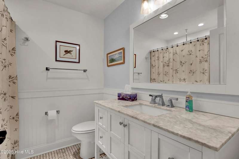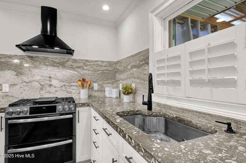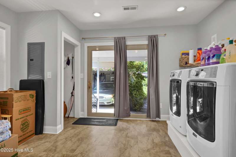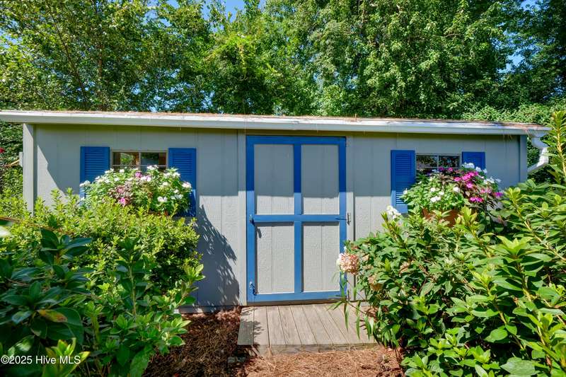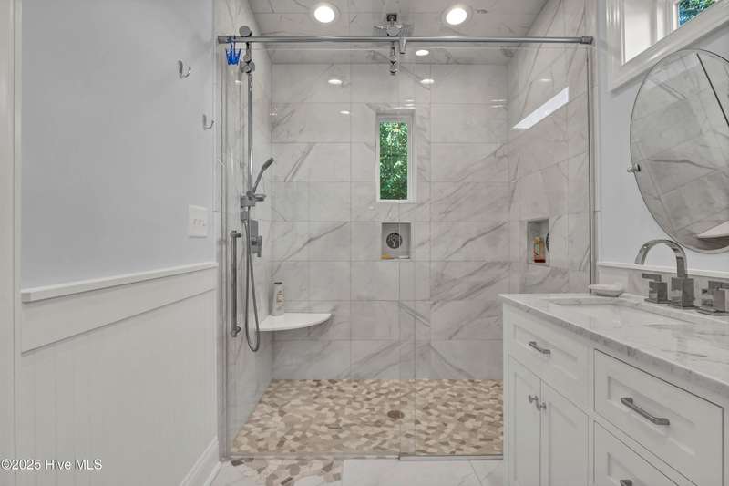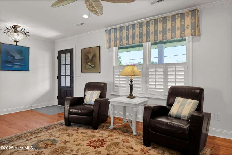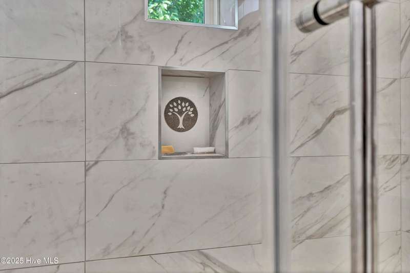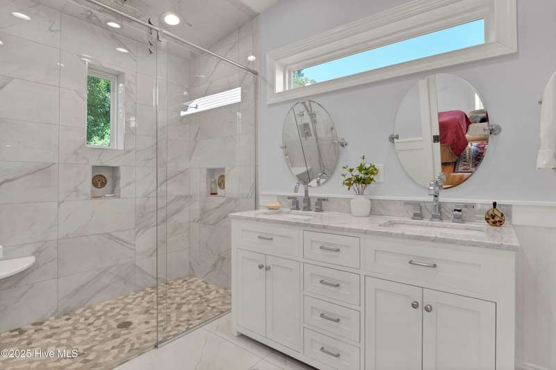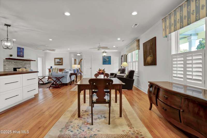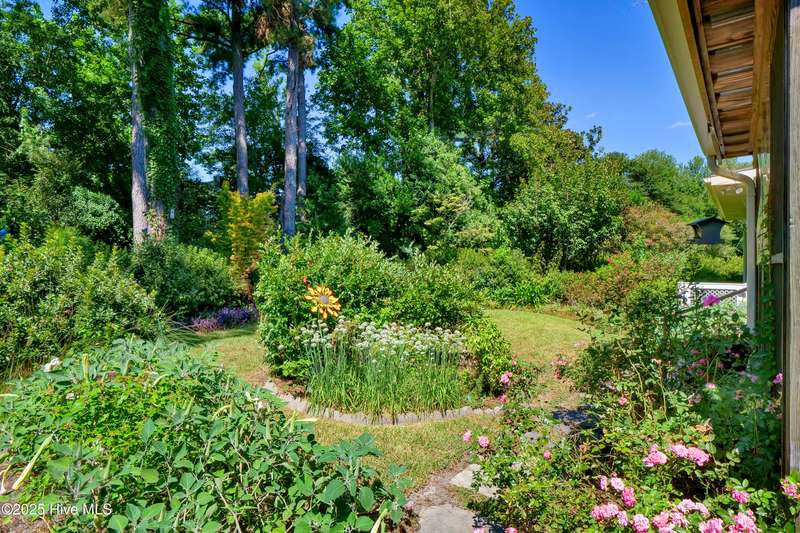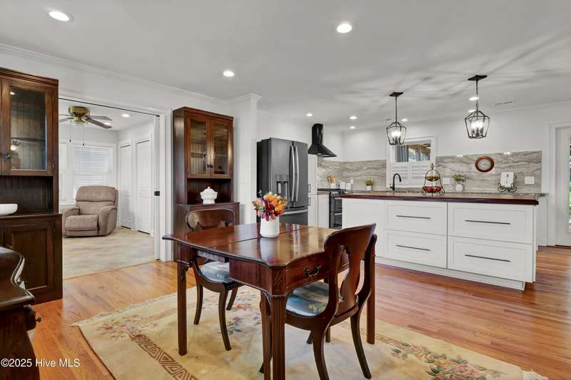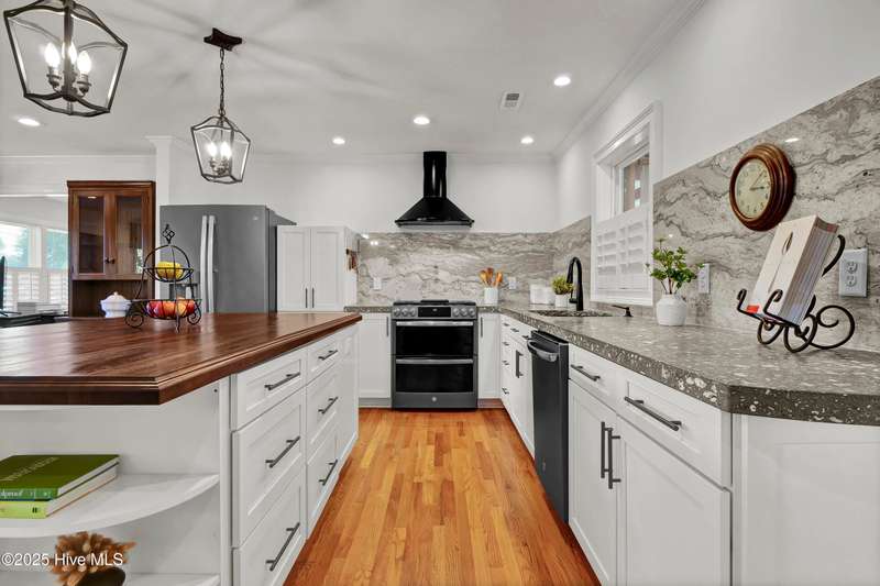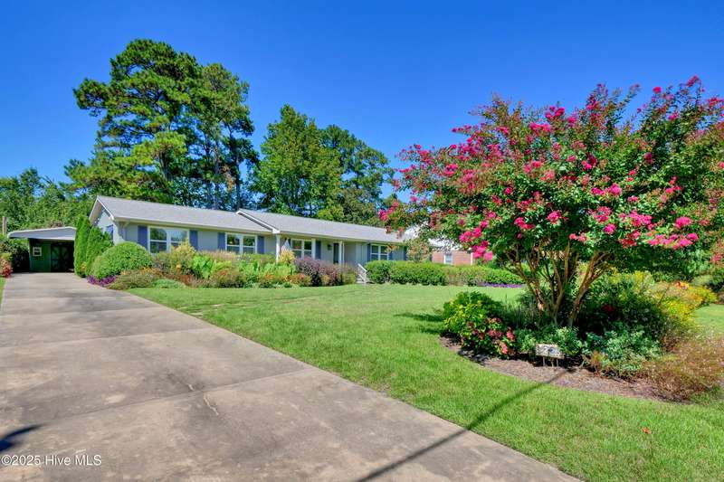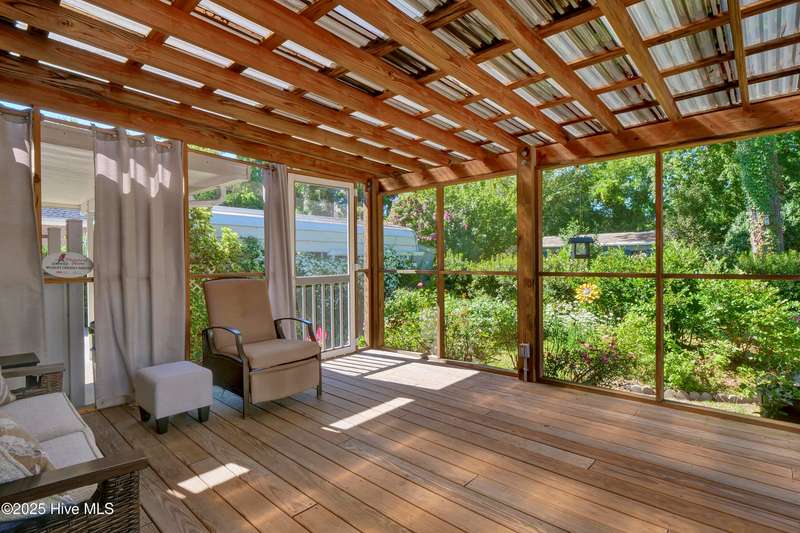 A timeless design extensively renovated down to the studs in 2018. This home is in a prime location with an open concept featuring roomy L-shape kitchen with formed concrete counter top with oyster shell inlay, granite backsplash and large island with Black Walnut top and extensive cabinet space below. The open living room is anchored by a gas log fireplace with granite surround and live-edge Black Walnut mantle. Back doors on either side of the fireplace lead to screened and open decks overlooking the backyard. A private owner's suite was built as part of the renovation and features a slanted vaulted ceiling, exterior door for deck access and an ensuite bathroom with walk-in shower, raised vanity with stone top, two windows and a heated tile floor. A spacious walk-in closet with pocket door, extensive built-in shelving, hanging racks and central dressing island with multi drawers complete the space. Additional interior features include two guest bedrooms, hall bath, den/office and a laundry room with utility sink, ideal for a pet room as well. The renovation included new roof, new electrical service, new plumbing, new HVAC, New Rinnai water heater and much more. The large lot is beautifully landscaped with flowering plants and there is a private well for irrigation. This home is ideally located close to numerous restaurants, shops, grocery stores and Wrightsville Beach. Items that do not convey: square living room mirror, oval hall mirror, mirrored hat rack in laundry, all window valances, rods and draperies and all yard art and feeders.
