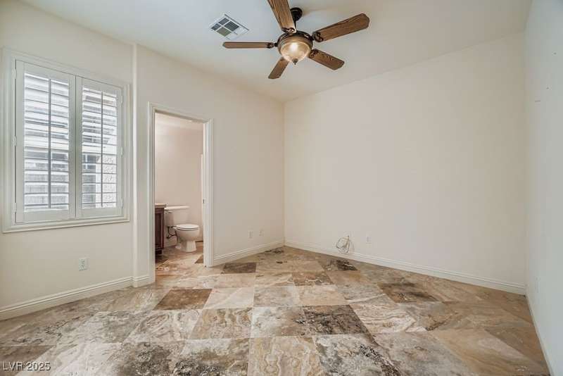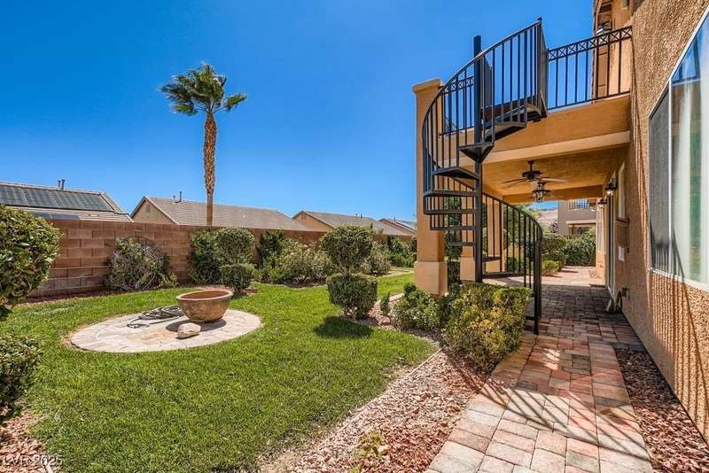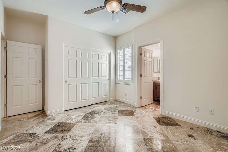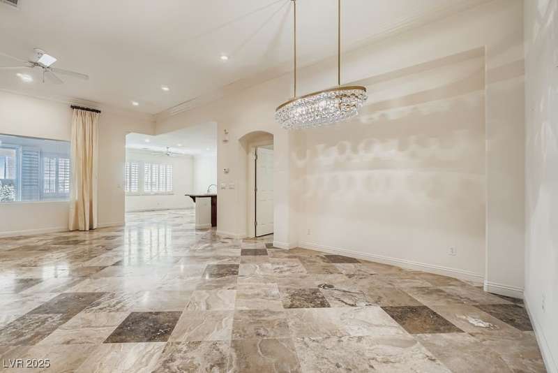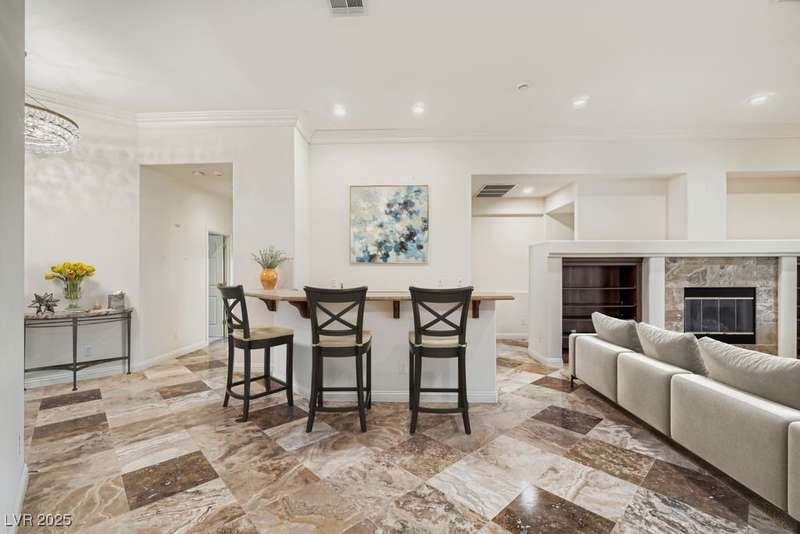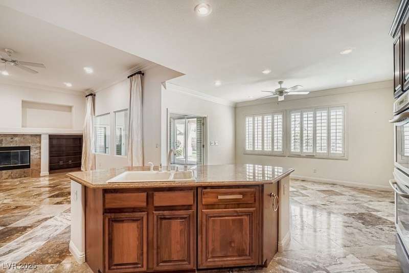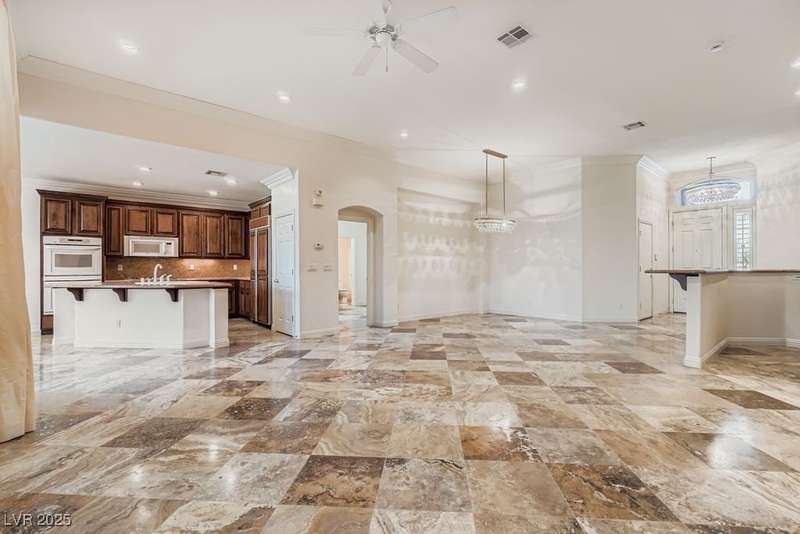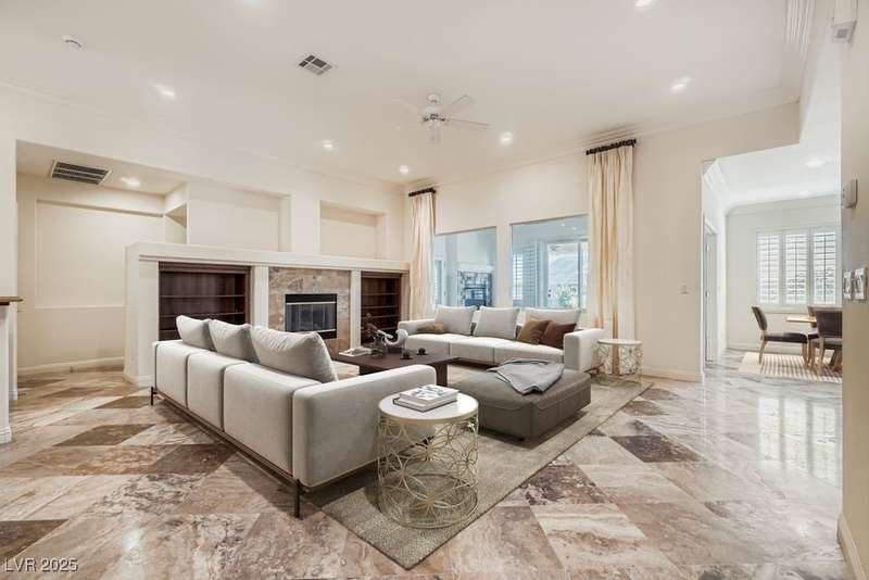 Pride of ownership shines in this rare one-story inside the gated community Canyons at Stetson Ranch, adjacent to Summerlin South and Bishop Gorman. This 4-bed, 3-bath residence with a 3-car garage offers a spacious and elegant layout designed for both entertaining and everyday living. Soaring 11-foot ceilings, crown molding, with a welcoming wet bar & dining room. The great room features a cozy fireplace, custom built-ins, plantation shutters, and windows framing the enclosed sunroom. Chef’s kitchen—boasting upgraded walnut cabinetry, granite counters and backsplash, double ovens, 5-burner cooktop, and a custom-built-in panel refrigerator. The split floor plan provides privacy with the 4th bedroom ensuite tucked on its own wing. Flooring includes classic travertine throughout the main spaces with carpet in bedrooms. Outdoors, enjoy a paver driveway and walkway, covered patio, and mature, lush landscaping that provides cool afternoon shade. All this with HOA dues of only $48/month