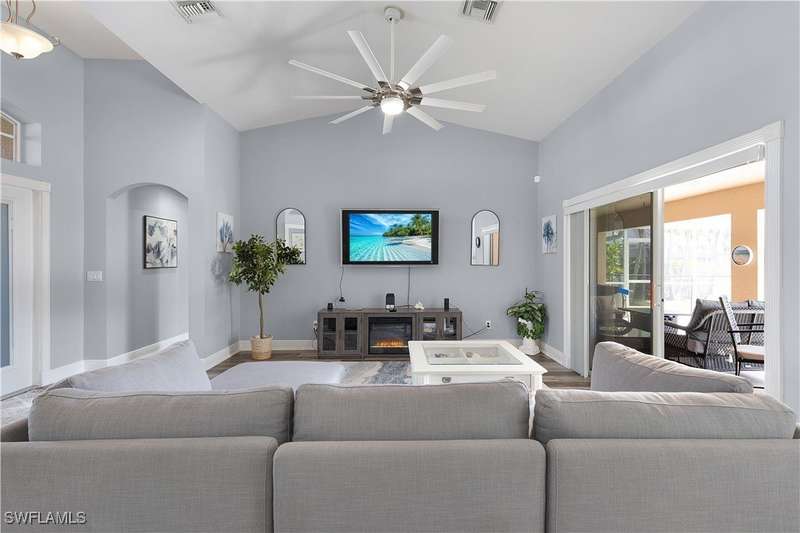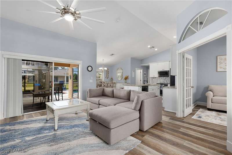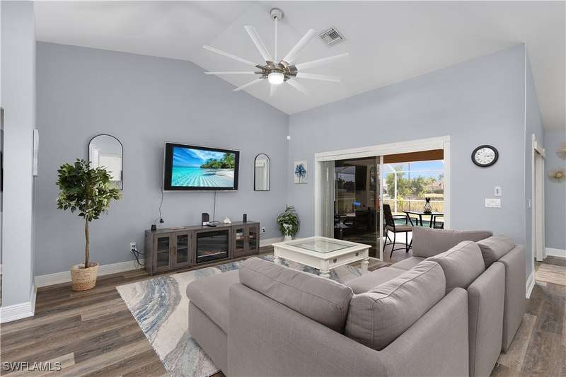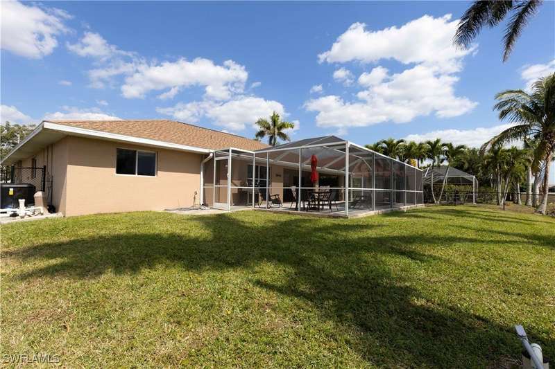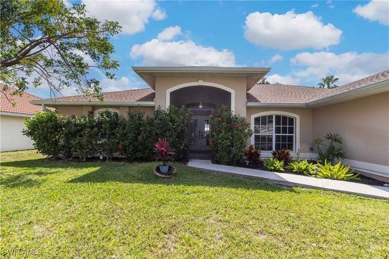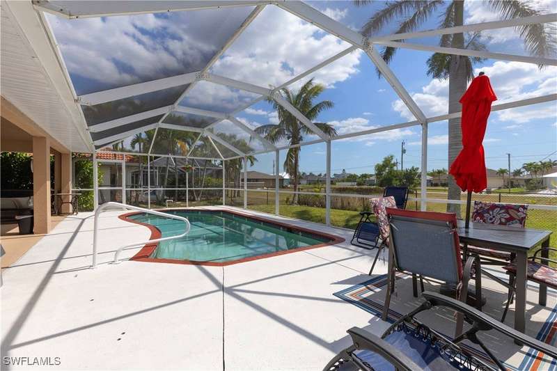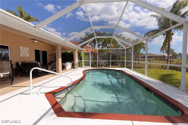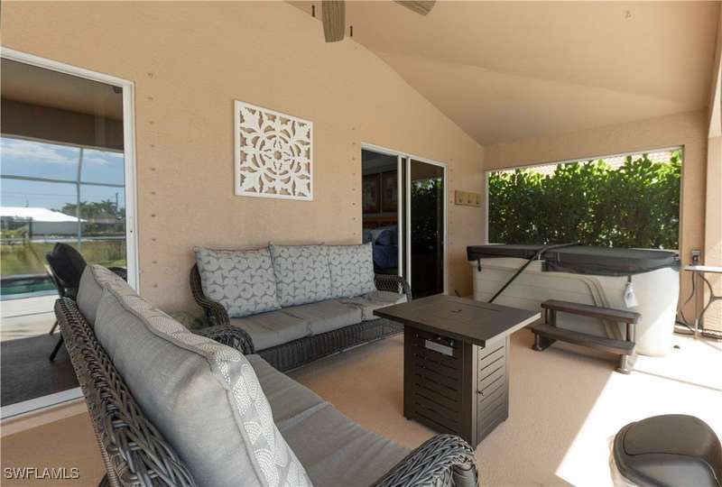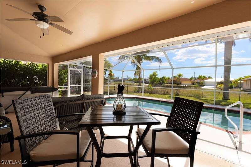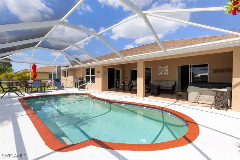 Fully furnished and move-in ready, this 3-bedroom plus den, 2-bathroom pool home is an ideal opportunity for a second home, seasonal retreat, or vacation rental in one of SW Cape Coral's most desirable neighborhoods. Surrounded by upscale homes and just minutes from Cape Harbour, Tarpon Point, downtown Cape Coral, and a short drive to local beaches, this property offers the perfect blend of convenience and Florida lifestyle. The well-maintained interior features an open-concept layout with an updated kitchen, stainless steel appliances, spacious island, and modern finishes throughout. A generous primary suite provides privacy and comfort, while the versatile den offers space for a home office, nursery, or extra guests. The guest bath provides direct access to the pool area-ideal for indoor-outdoor entertaining. Outside, enjoy a fenced backyard with a screened-in, heated pool, hot tub, and tropical ambiance. With a 2023 roof, all assessments paid, low insurance costs, and no rental restrictions, this turnkey home is ready for immediate enjoyment or income potential.