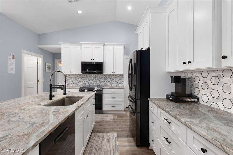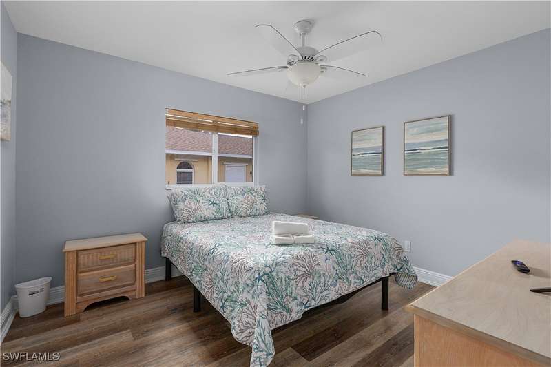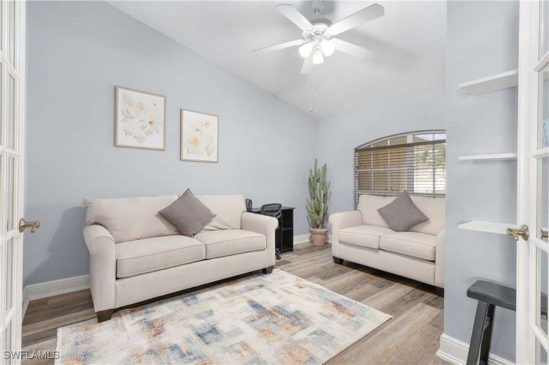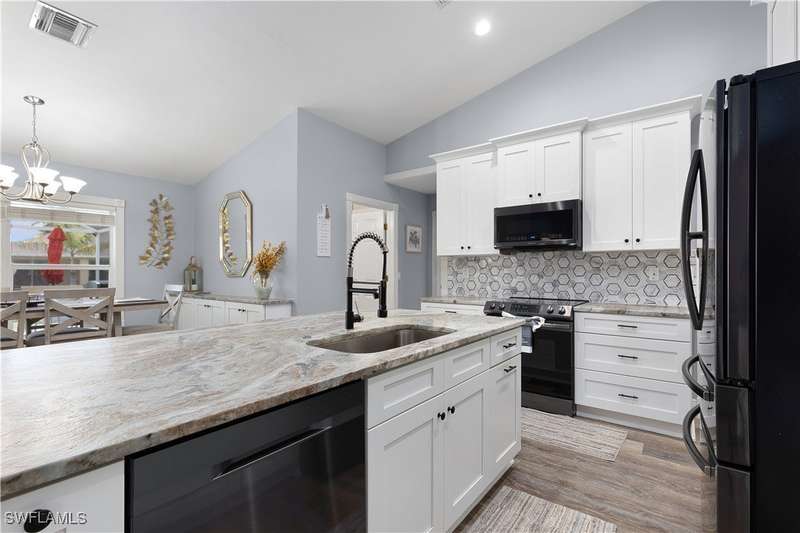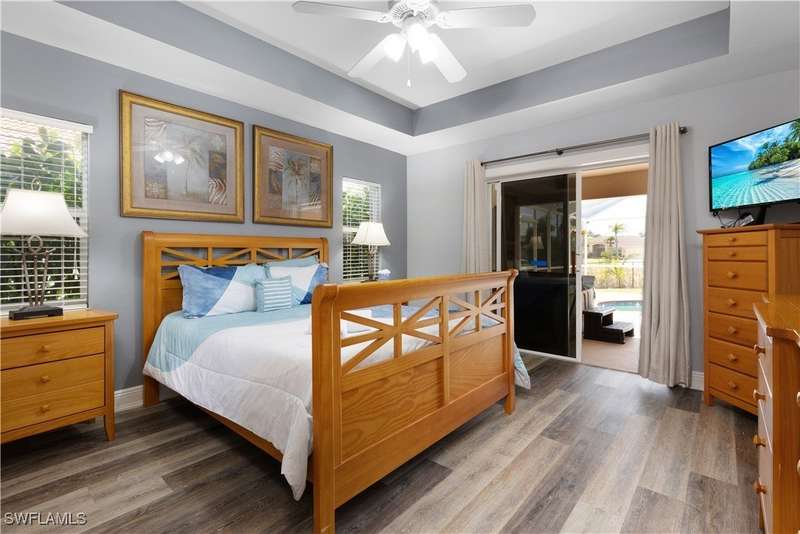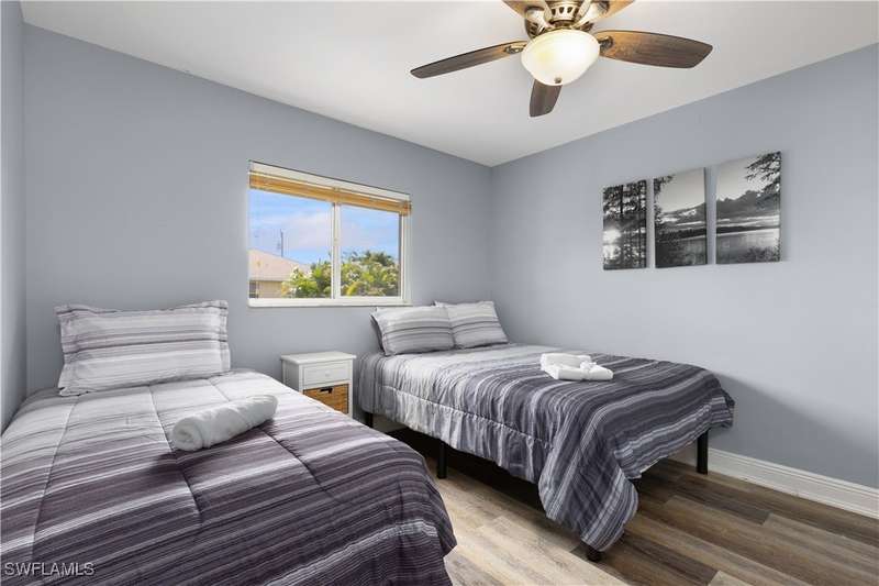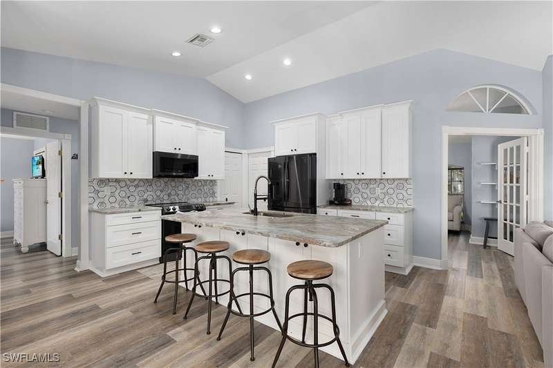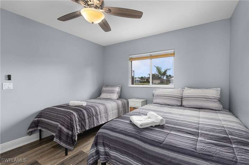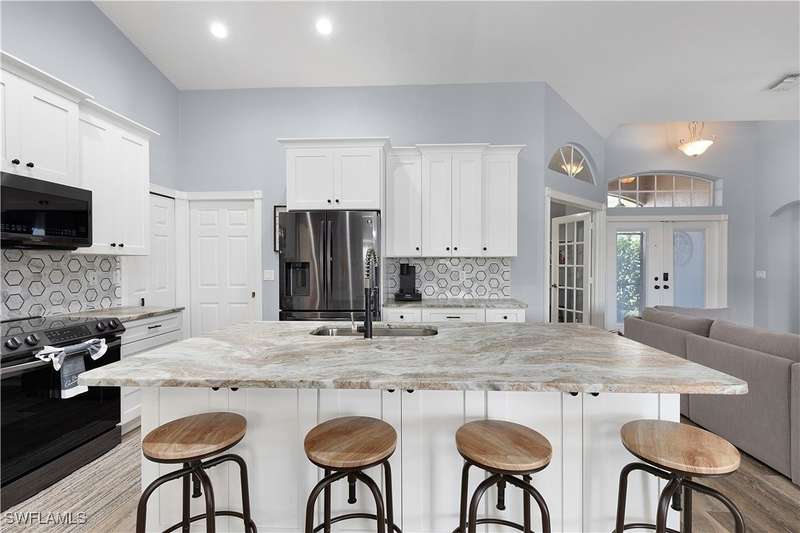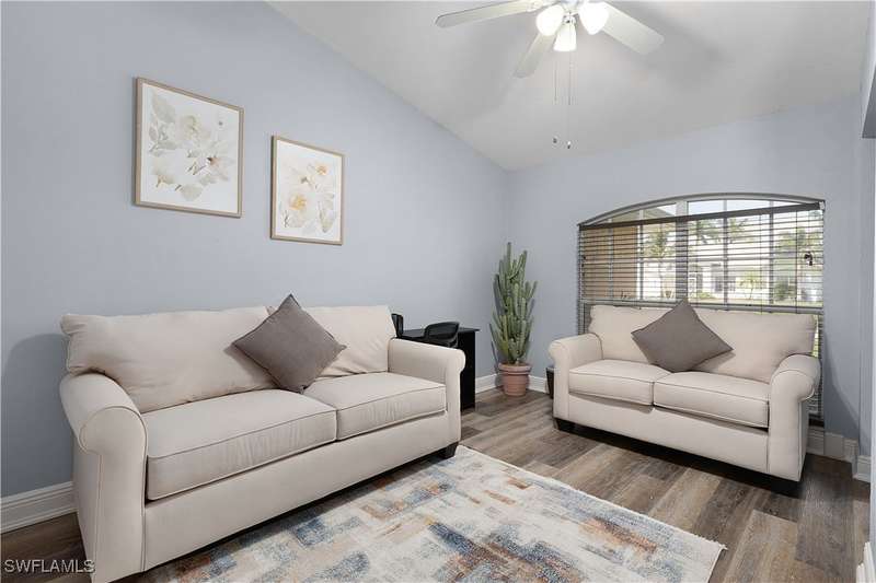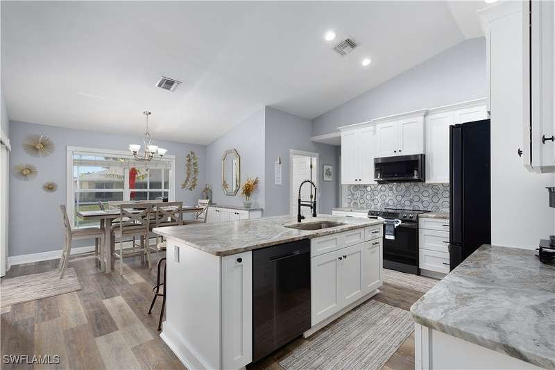 Fully furnished and move-in ready, this 3-bedroom plus den, 2-bathroom pool home is an ideal opportunity for a second home, seasonal retreat, or vacation rental in one of SW Cape Coral's most desirable neighborhoods. Surrounded by upscale homes and just minutes from Cape Harbour, Tarpon Point, downtown Cape Coral, and a short drive to local beaches, this property offers the perfect blend of convenience and Florida lifestyle. The well-maintained interior features an open-concept layout with an updated kitchen, stainless steel appliances, spacious island, and modern finishes throughout. A generous primary suite provides privacy and comfort, while the versatile den offers space for a home office, nursery, or extra guests. The guest bath provides direct access to the pool area-ideal for indoor-outdoor entertaining. Outside, enjoy a fenced backyard with a screened-in, heated pool, hot tub, and tropical ambiance. With a 2023 roof, all assessments paid, low insurance costs, and no rental restrictions, this turnkey home is ready for immediate enjoyment or income potential.