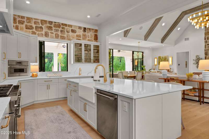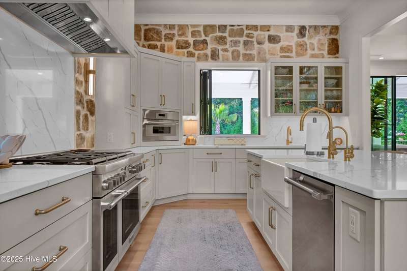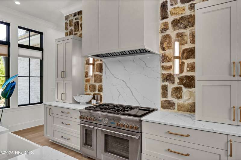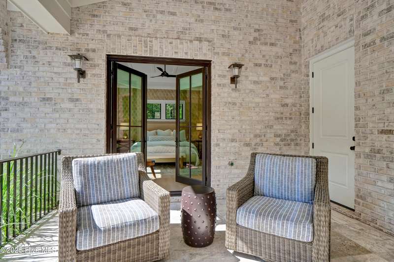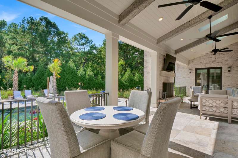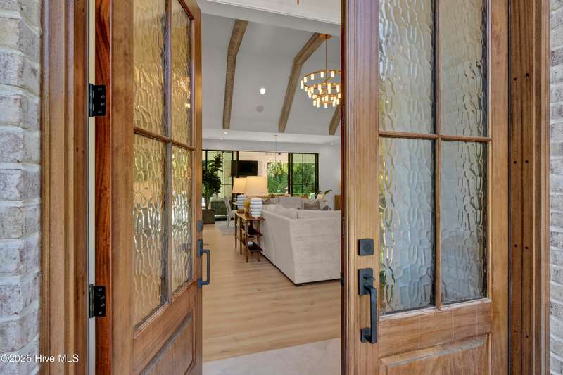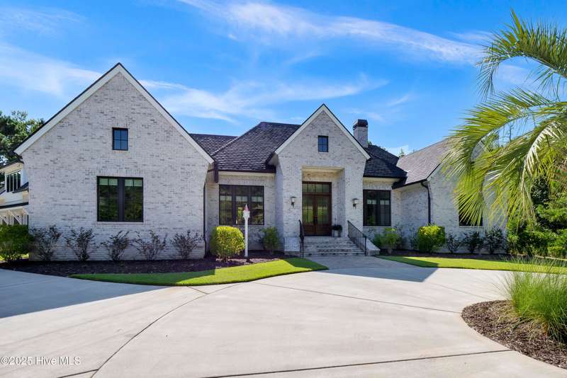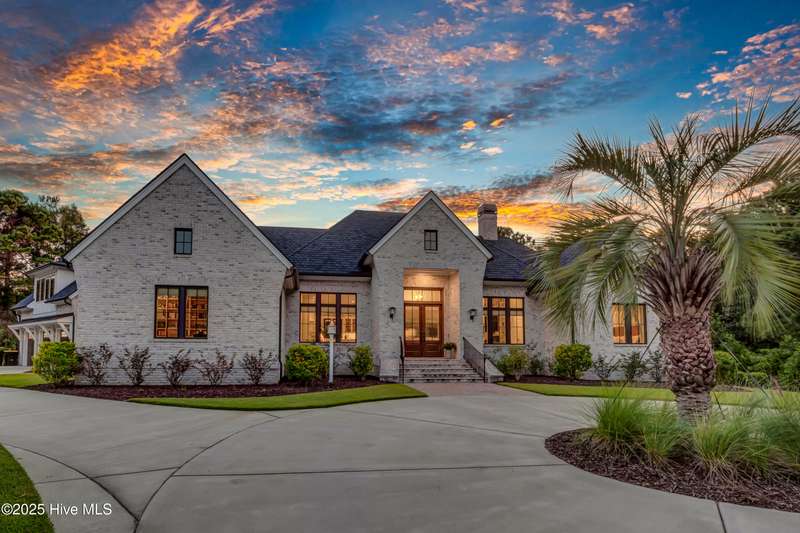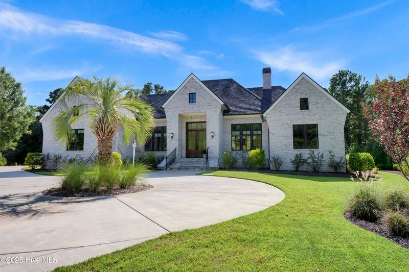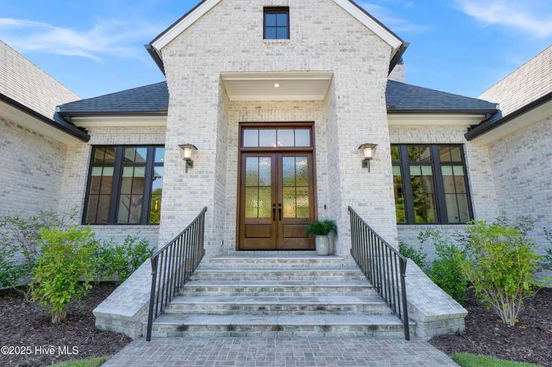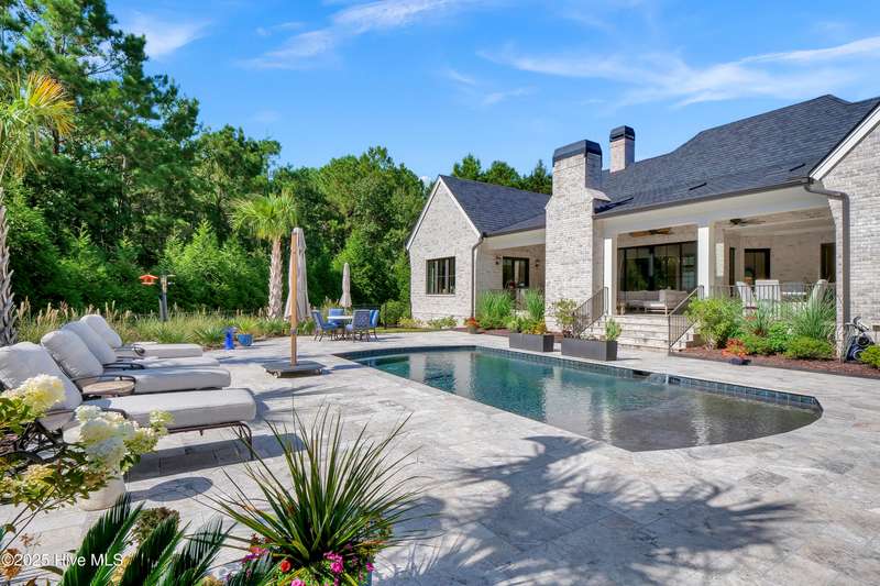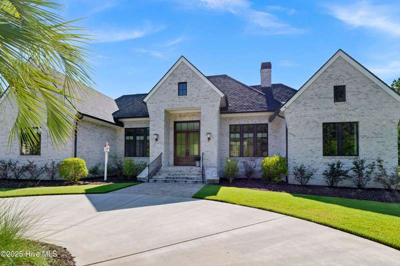 Combine a one of a kind location in the heart of Landfall with a quality built, nearly new, modern French country design with impeccable features and you will arrive at the secluded address of 1800 Newington Court.A quiet cul-de-sac with only 5 houses on the street and surrounded by over 300 acres of wooded conservation preserve, this thoughtfully designed, custom built residence by Mac Braxton of RMB Designs was completed in 2024 and features over 4500 square feet; including 3800 on the first floor alone. Few houses will stun you like this one! The low maintenance oversized Riviera all brick exterior and black clad Marvin windows give the home a stately presence with a circular driveway and lush tropical landscaping. As you enter the front door you will be amazed by the open great room with vaulted beamed ceiling; the chef's kitchen with huge quartz island and handsome stone accent wall in the kitchen and opposite fireplace wall. Custom cabinets from Hollingsworth and Thermador stainless appliances including a hybrid natural gas and induction cooktop, double ovens and multiple beverage drawers are the dream of every cook!The first floor features engineered hardwood flooring throughout including the 3 first floor bedrooms. The 2 guest bedrooms each have private ensuite baths on the far right side of the house and the 21x16 vaulted and beamed ceiling primary suite on the opposite side to provide everyone with privacy. Each bedroom has walk-in closets and custom designed shelving systems. There is additional 700 sq ft upstairs in a 29x21 bonus room with full bath over the 3 car garage. The garage also has a work shop and includes a half bath that opens to the backyard for easy pool access. On the first floor, the primary suite and one of the guest suites has access to the heart and soul of the home...over 700 sq ft of covered open air porch with vaulted ceilings and skylights; double sliding glass doors to allow seamless indoor-outdoor living and an outdoor pass thru window from the main kitchen. All overlooking the fenced, private backyard oasis complete with heated gunite saltwater pool. Silver travertine extends from the porch around the pool decking leading to a secluded area for a firepit. You will be the envy of the neighborhood with the perfect spot for elegant entertaining and peaceful relaxation. A wood burning fireplace with a gas starter will extend the seasons and welcome cool fall evenings for catching your favorite football team. Watching the Masters from here might just be heaven on earth! With frontage on Landfall's Pete Dye designed golf course (par4, 5th hole) and surrounded by conservation acreage, this home offers both privacy and views. Enjoy the sidewalk that extends from the cul-de-sac and joins with miles of nature trails to enjoy Landfall's flora and fauna. Please contact Vance Young for a complete list of features including whole house generator, 2 tankless gas fired Rinai water heaters, spray foam insulation in exterior walls and roof and a large walk-in attic. Seller cannot close before 1/13/26.