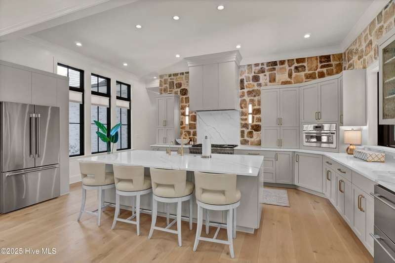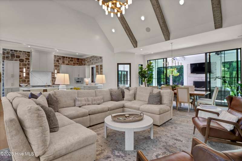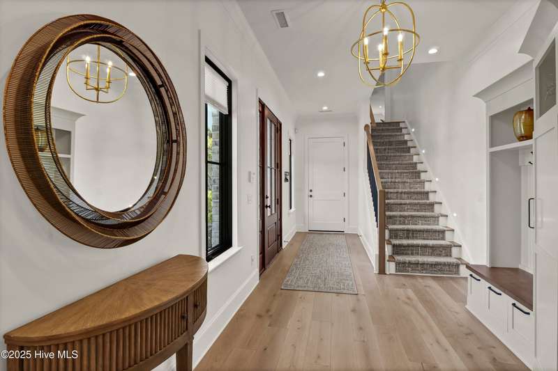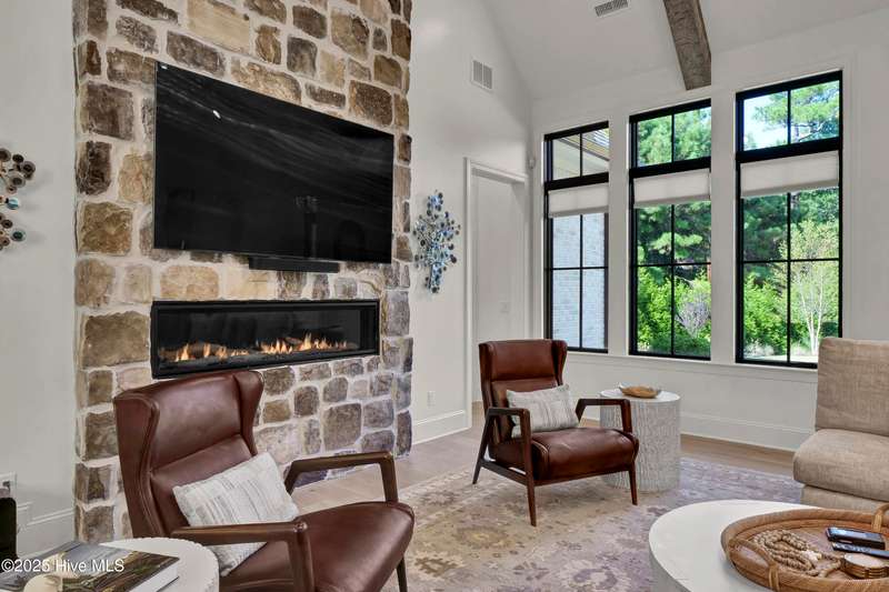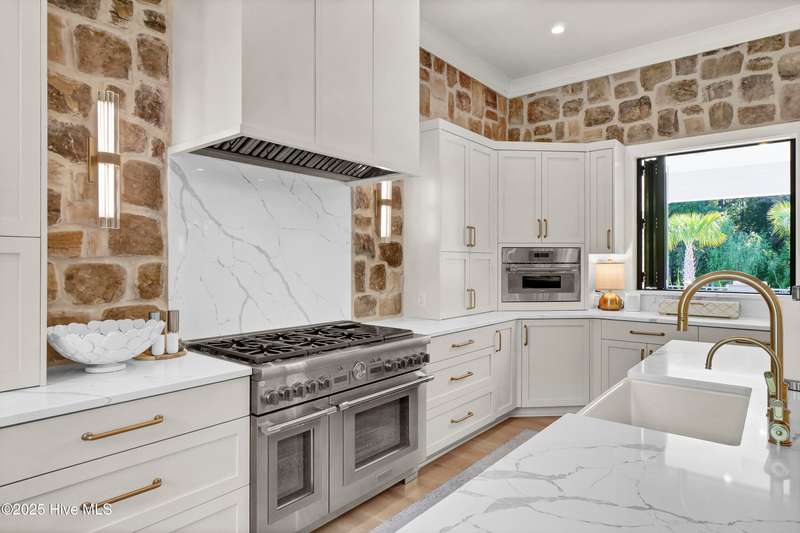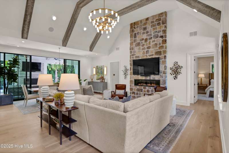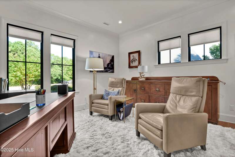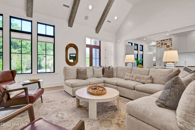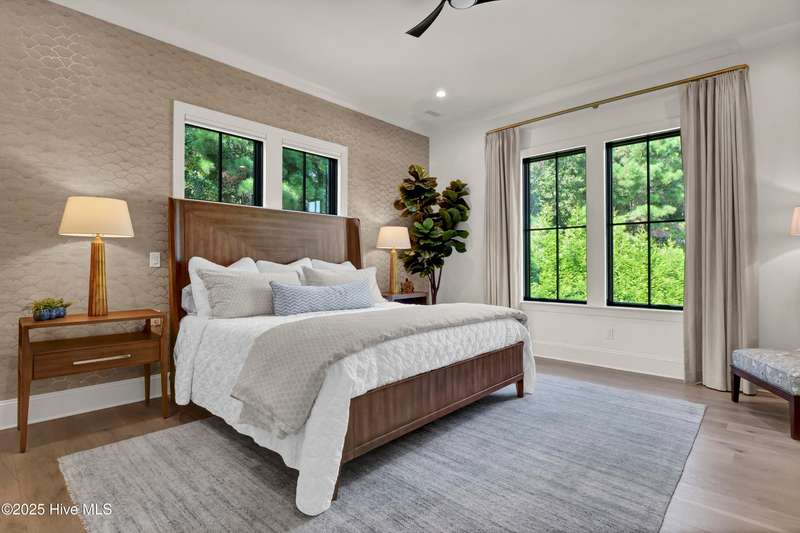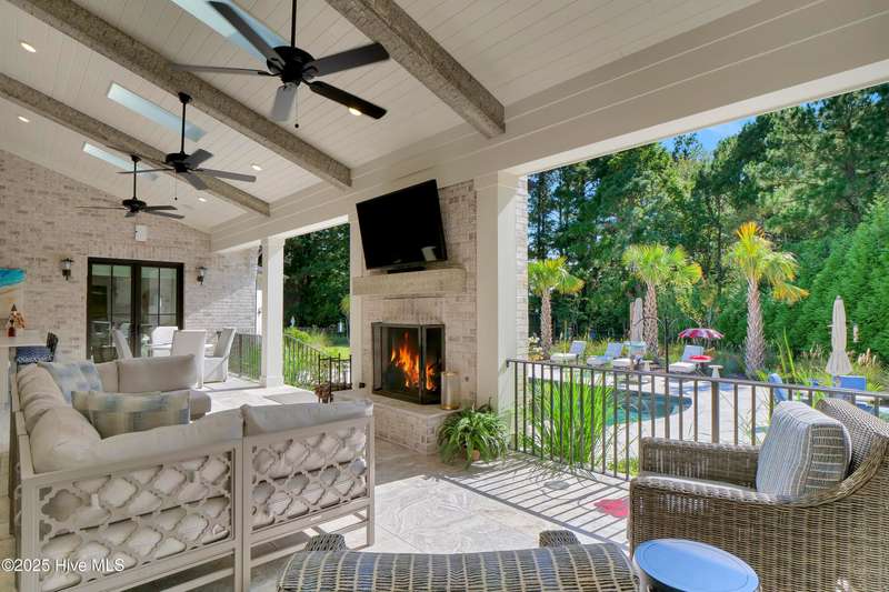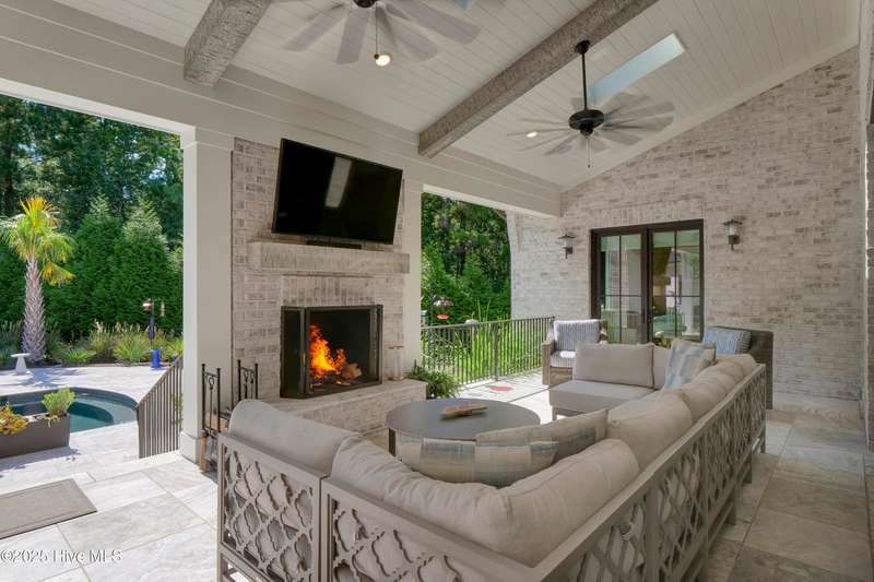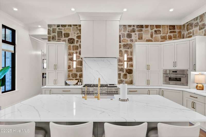 Combine a one of a kind location in the heart of Landfall with a quality built, nearly new, modern French country design with impeccable features and you will arrive at the secluded address of 1800 Newington Court.A quiet cul-de-sac with only 5 houses on the street and surrounded by over 300 acres of wooded conservation preserve, this thoughtfully designed, custom built residence by Mac Braxton of RMB Designs was completed in 2024 and features over 4500 square feet; including 3800 on the first floor alone. Few houses will stun you like this one! The low maintenance oversized Riviera all brick exterior and black clad Marvin windows give the home a stately presence with a circular driveway and lush tropical landscaping. As you enter the front door you will be amazed by the open great room with vaulted beamed ceiling; the chef's kitchen with huge quartz island and handsome stone accent wall in the kitchen and opposite fireplace wall. Custom cabinets from Hollingsworth and Thermador stainless appliances including a hybrid natural gas and induction cooktop, double ovens and multiple beverage drawers are the dream of every cook!The first floor features engineered hardwood flooring throughout including the 3 first floor bedrooms. The 2 guest bedrooms each have private ensuite baths on the far right side of the house and the 21x16 vaulted and beamed ceiling primary suite on the opposite side to provide everyone with privacy. Each bedroom has walk-in closets and custom designed shelving systems. There is additional 700 sq ft upstairs in a 29x21 bonus room with full bath over the 3 car garage. The garage also has a work shop and includes a half bath that opens to the backyard for easy pool access. On the first floor, the primary suite and one of the guest suites has access to the heart and soul of the home...over 700 sq ft of covered open air porch with vaulted ceilings and skylights; double sliding glass doors to allow seamless indoor-outdoor living and an outdoor pass thru window from the main kitchen. All overlooking the fenced, private backyard oasis complete with heated gunite saltwater pool. Silver travertine extends from the porch around the pool decking leading to a secluded area for a firepit. You will be the envy of the neighborhood with the perfect spot for elegant entertaining and peaceful relaxation. A wood burning fireplace with a gas starter will extend the seasons and welcome cool fall evenings for catching your favorite football team. Watching the Masters from here might just be heaven on earth! With frontage on Landfall's Pete Dye designed golf course (par4, 5th hole) and surrounded by conservation acreage, this home offers both privacy and views. Enjoy the sidewalk that extends from the cul-de-sac and joins with miles of nature trails to enjoy Landfall's flora and fauna. Please contact Vance Young for a complete list of features including whole house generator, 2 tankless gas fired Rinai water heaters, spray foam insulation in exterior walls and roof and a large walk-in attic. Seller cannot close before 1/13/26.