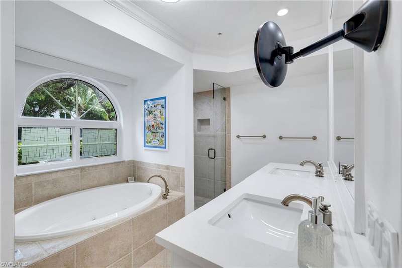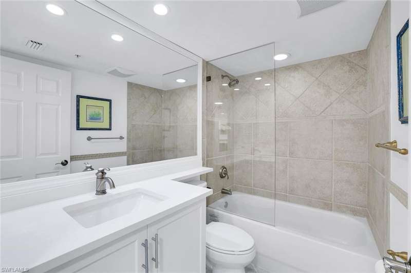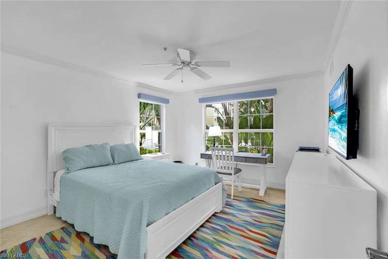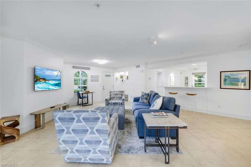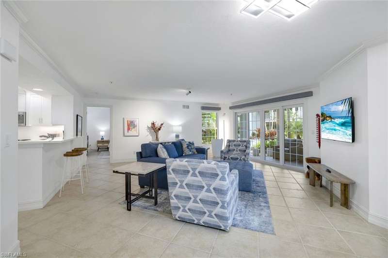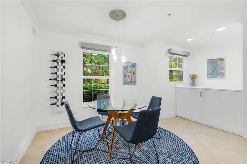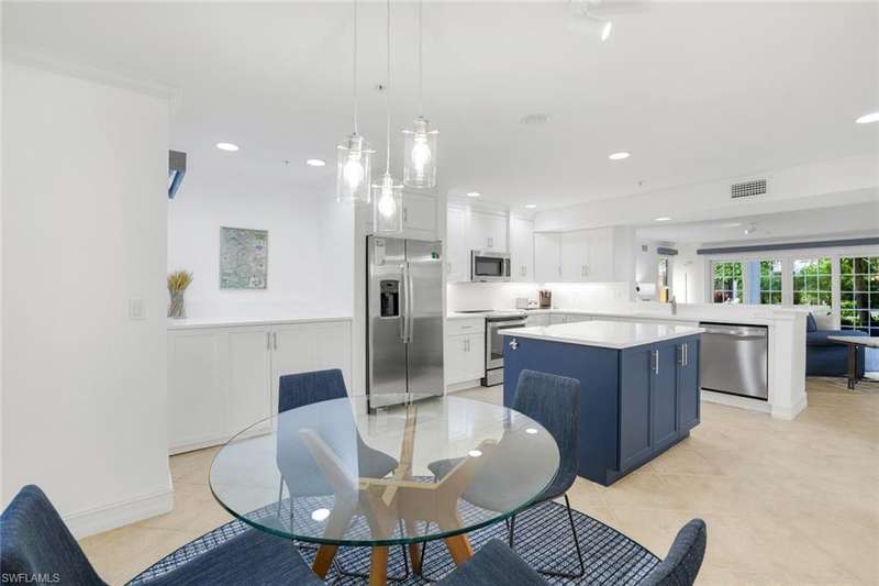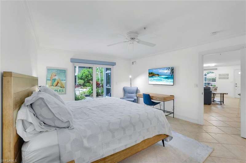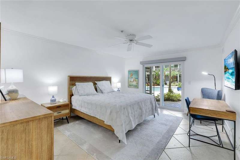 Discover the best of Olde Naples living in this beautifully decorated 2-bedroom, 2-bath condo, ideally located just one block from the bustling 5th Ave S. Enjoy easy access to an incredible array of top-rated restaurants, boutique shopping, vibrant nightlife, and charming art galleries all within walking distance. The pristine white sand beach is only three blocks away, perfect for sunbathing, swimming, or evening strolls along the shore. Step inside to a bright and open living area featuring elegant tile floors, crown molding, and plantation shutters. French doors open to a spacious screened lanai overlooking lush tropical landscaping, with direct access to the pool and BBQ area ideal for relaxing or entertaining guests. The kitchen is fully equipped with granite countertops, a built-in bar, and plenty of dining space. The serene main bedroom boasts sliding doors opening directly to the pool area, a walk-in closet, and an en-suite bathroom with dual vanities and a walk-in shower.