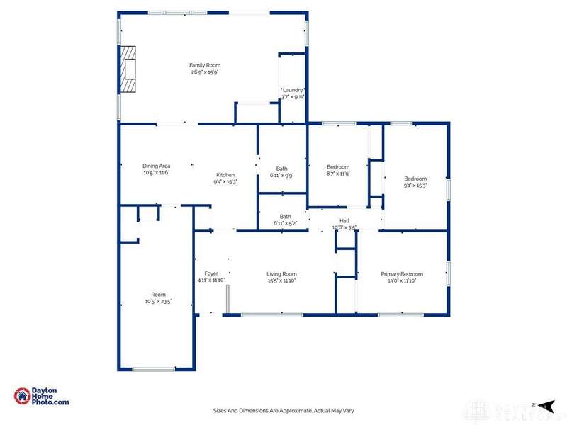 Talk about room! Beautiful 3-bedroom, 2 bath brick ranch with large private backyard. Pull in and take note of the new oversized driveway, custom covered porch, dimensional shingle roof and newer replacement windows. Step inside and begin your tour. Large living room with loads of natural light. The right end of the home features 3 nice-sized bedrooms and an updated full bath with walk in shower. Kitchen features include a large, dedicated dining area, access to an additional rec room, and access to the second full bath. Rear of the home is where you will find a gorgeous family room addition, offering more storage space and its own laundry room. One more stop. Head out to the large, fully fenced private backyard. Check out the oversized 2 car garage and storage shed while you are there. Seller prefers to make no repairs and has priced the home accordingly. Roof: 2010. Furnace: 2024. Schedule a showing today!