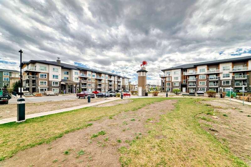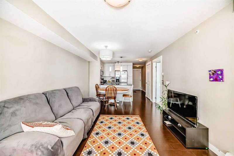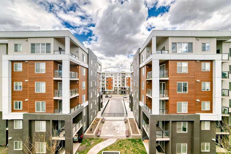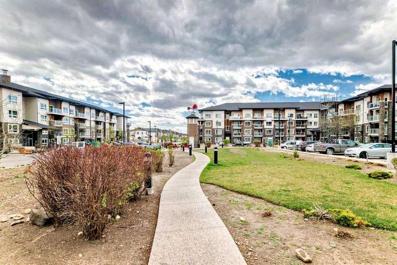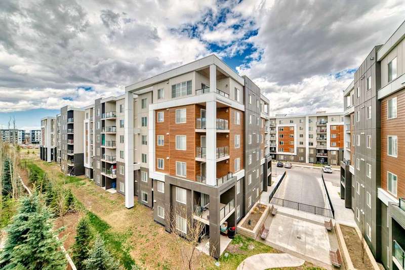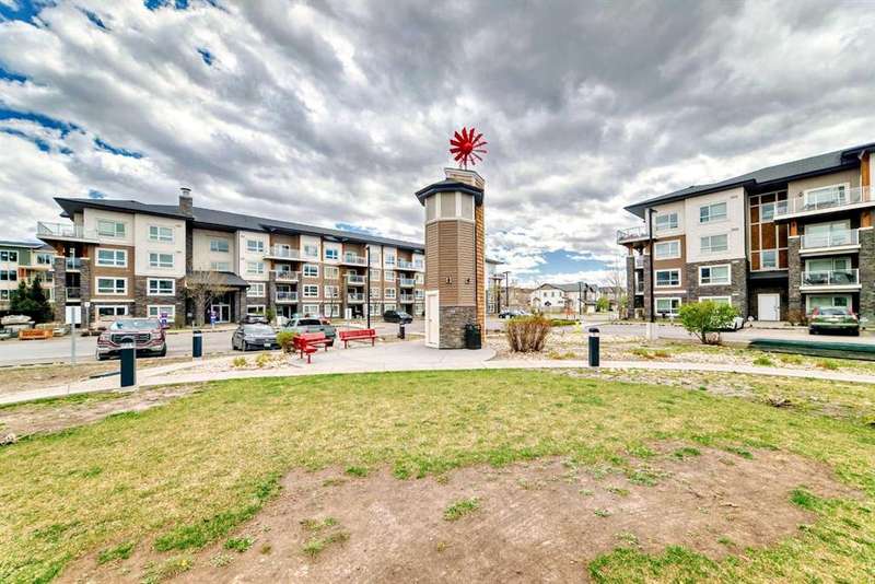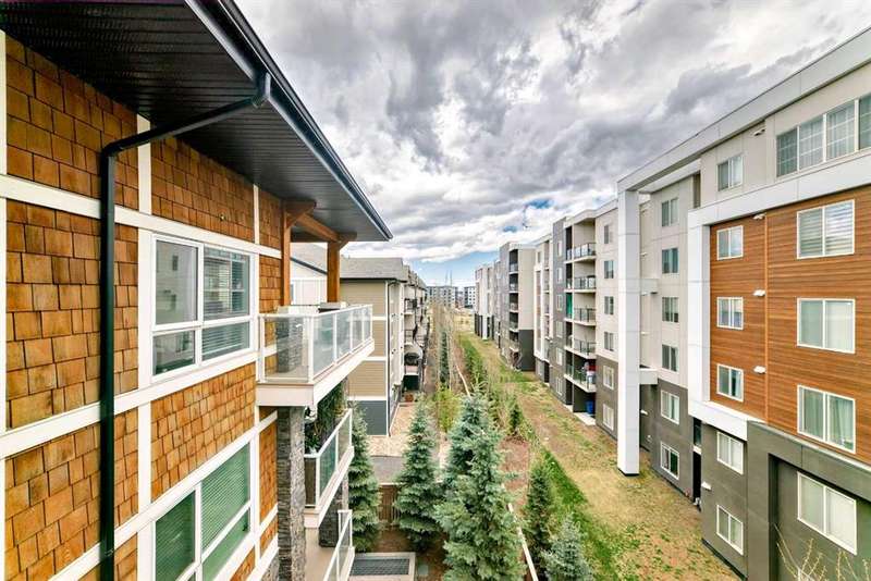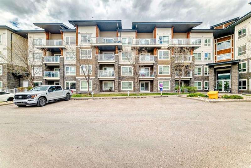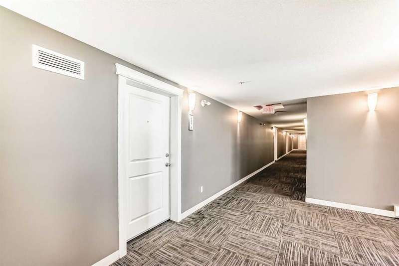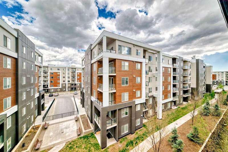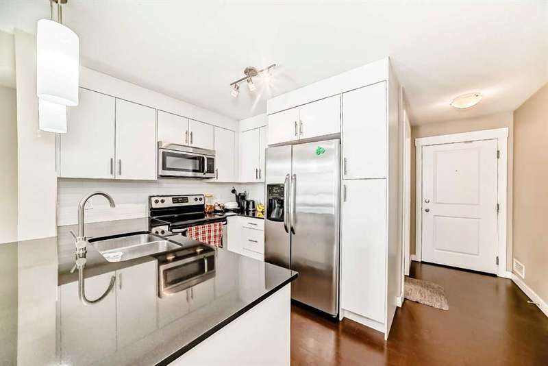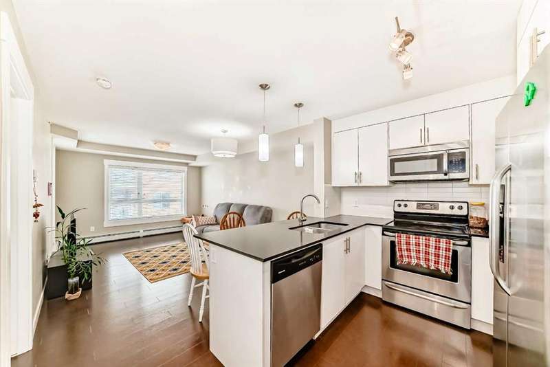 Welcome to this beautifully maintained 2-bedroom, 1-bathroom unit located on the top floor, offering peace, privacy, and plenty of natural light. Step into the stylish kitchen featuring ceiling-height white cabinetry (no dusting required!), sleek black quartz countertops, stainless steel appliances, and ample cupboard space. The extended counter provides a convenient spot for additional seating—perfect for entertaining or casual dining. The main living area boasts sound-dampening cork flooring, combining comfort with style. The bright and open living room flows seamlessly onto a spacious balcony complete with a gas hookup for your BBQ—an ideal setting to relax and enjoy warm summer evenings. This unit includes a titled underground parking stall and an assigned storage unit for added convenience. Located in the vibrant and family-friendly community of Skyview, the building is just steps from Prairie Sky School (K-9), parks, playgrounds, restaurants, and local businesses. With easy access to Metis Trail and Stoney Trail, commuting is a breeze. Don’t miss out on this top-floor treasure in a prime location!