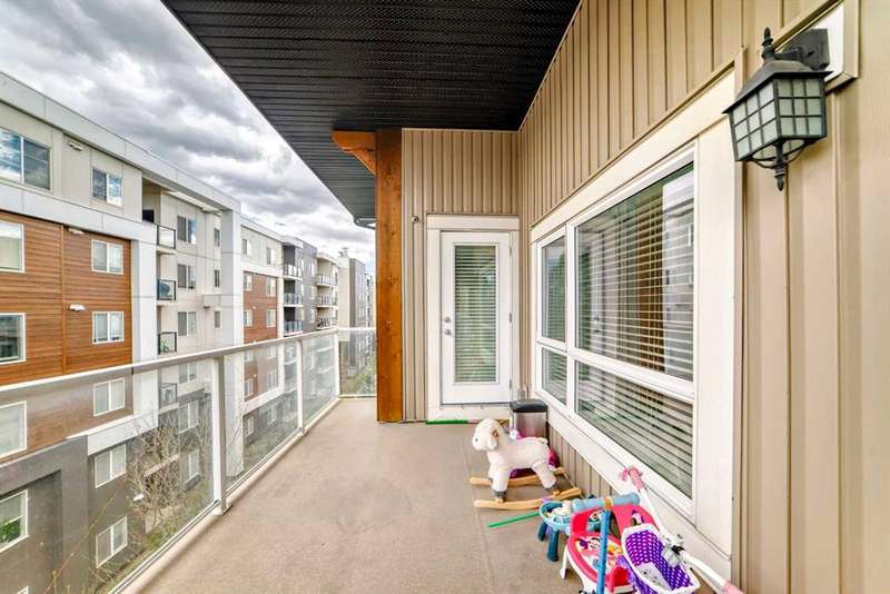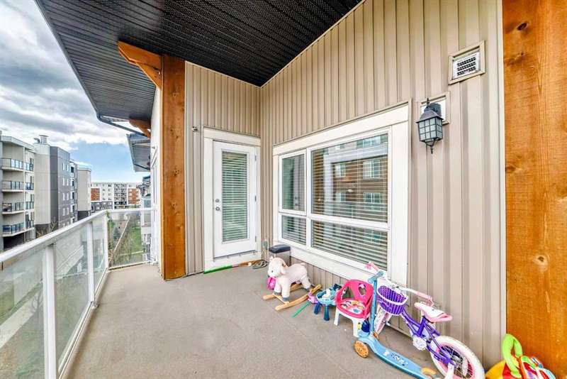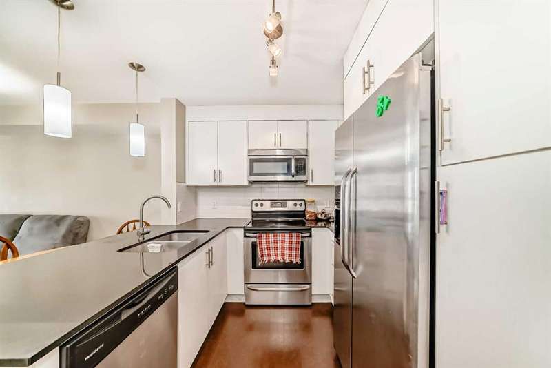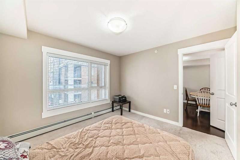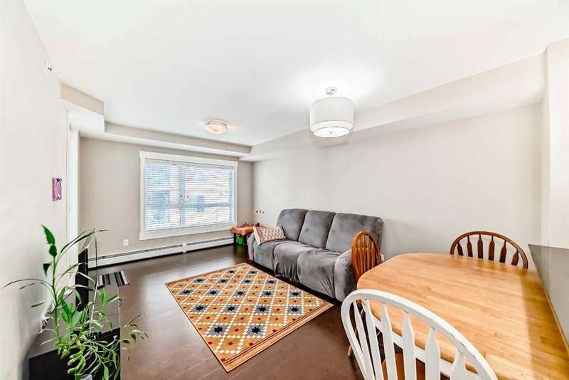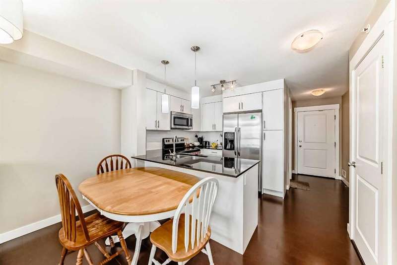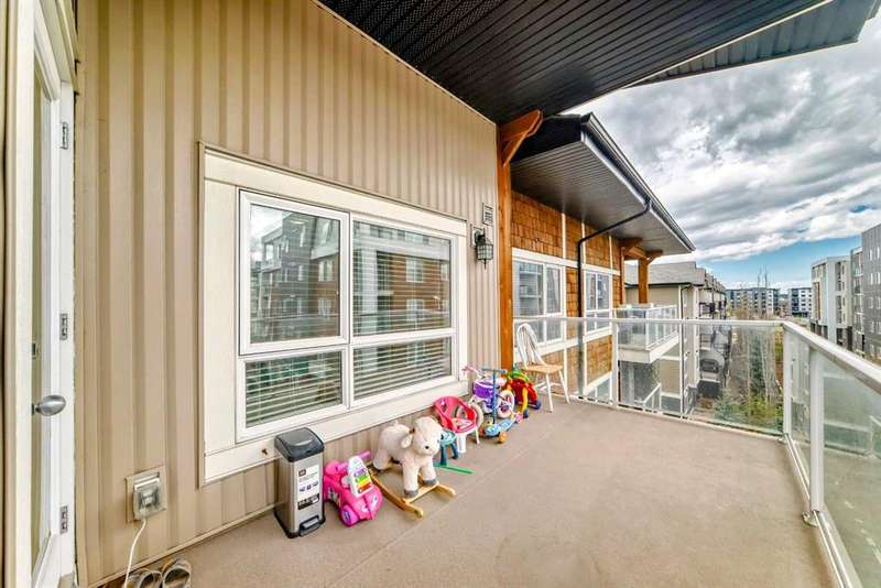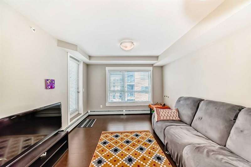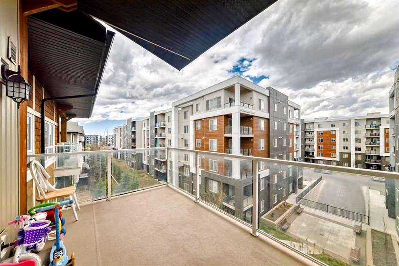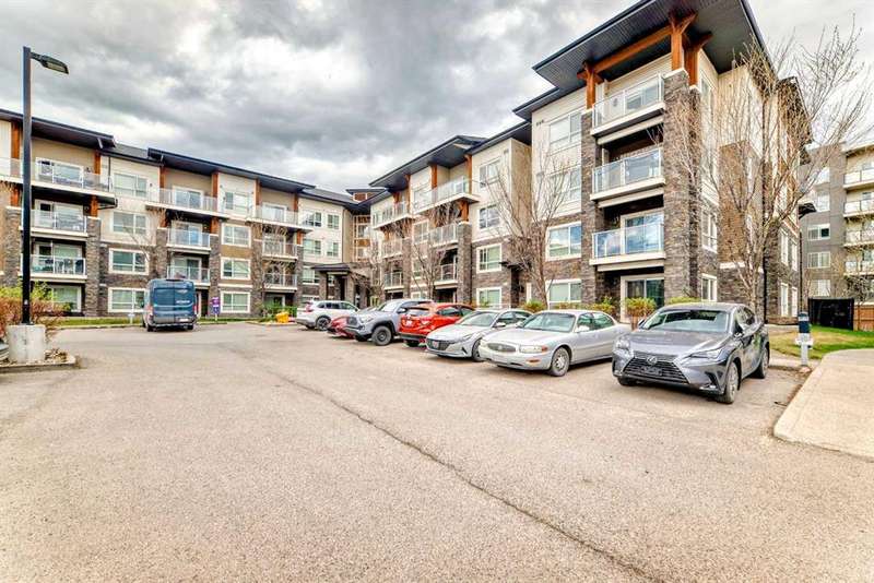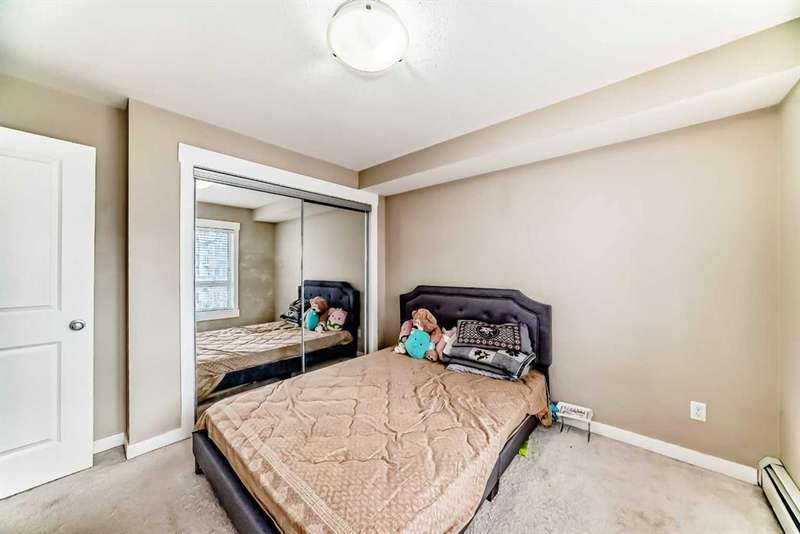 Welcome to this beautifully maintained 2-bedroom, 1-bathroom unit located on the top floor, offering peace, privacy, and plenty of natural light. Step into the stylish kitchen featuring ceiling-height white cabinetry (no dusting required!), sleek black quartz countertops, stainless steel appliances, and ample cupboard space. The extended counter provides a convenient spot for additional seating—perfect for entertaining or casual dining. The main living area boasts sound-dampening cork flooring, combining comfort with style. The bright and open living room flows seamlessly onto a spacious balcony complete with a gas hookup for your BBQ—an ideal setting to relax and enjoy warm summer evenings. This unit includes a titled underground parking stall and an assigned storage unit for added convenience. Located in the vibrant and family-friendly community of Skyview, the building is just steps from Prairie Sky School (K-9), parks, playgrounds, restaurants, and local businesses. With easy access to Metis Trail and Stoney Trail, commuting is a breeze. Don’t miss out on this top-floor treasure in a prime location!