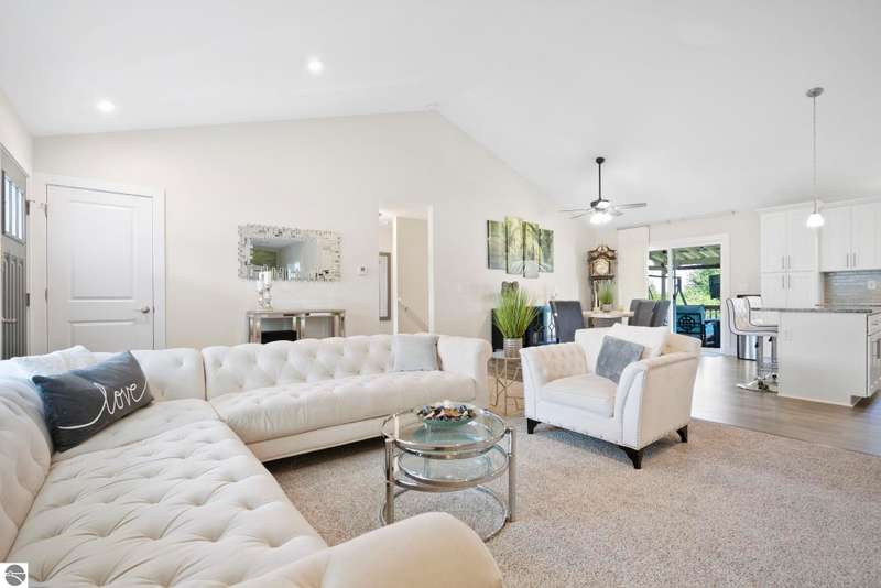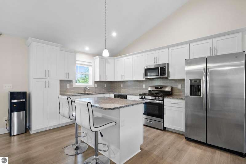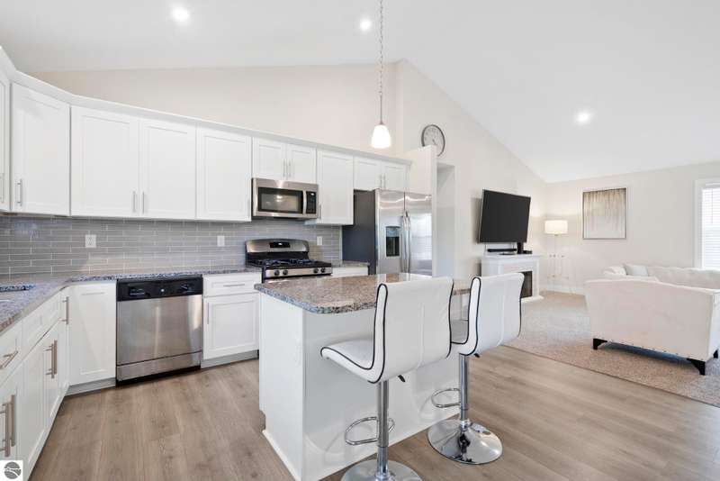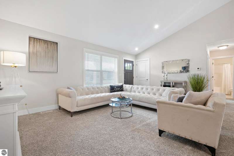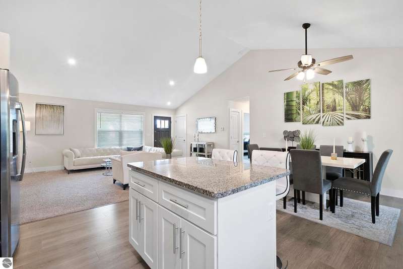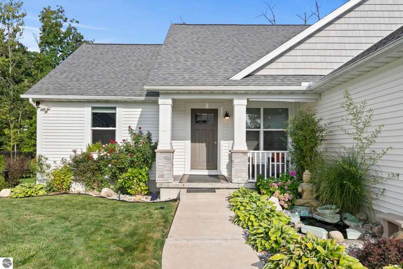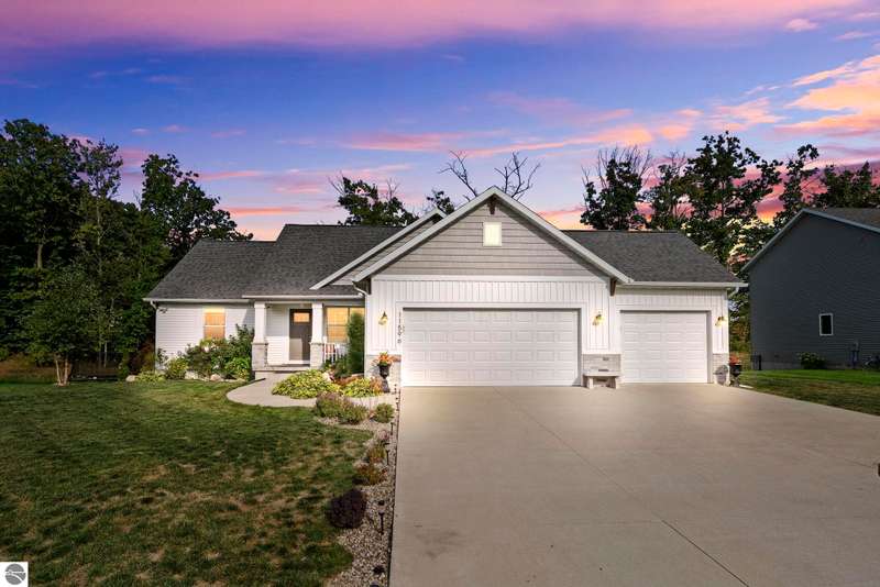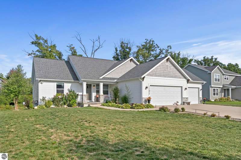 Nestled within the desirable Sessions Woods community, this charming ranch-style residence blends modern design with timeless comfort. Built in 2019 by Maplewood Homes, the property showcases high-quality craftsmanship, thoughtful details, and energy-efficient features, including 2' x 6' walls, spray foam insulation, and a superior foundation. Offering three bedrooms and two full baths across 1,437 square feet of single-level living space, the home presents a layout that feels both open and inviting. The great room, anchored by soaring vaulted ceilings, flows seamlessly into the kitchen and dining areas, creating an ideal setting for gatherings or relaxed daily living. A calming palette of whites, grays, and neutrals sets the tone for the interior, enhanced by laminate flooring and abundant natural light from insulated low-emissivity windows. The kitchen is highlighted, with white maple shaker cabinets, gleaming granite countertops, a spacious center island, and GE stainless steel appliances, including a gas range. The thoughtful split-bedroom design places the master suite opposite the two additional bedrooms, affording privacy and comfort. In the master suite, you will find a walk-in closet and a private bath featuring a stand-up shower. Both secondary bedrooms are generously sized, making them well-suited for family, guests, or a home office. Beyond the interiors, the home offers excellent outdoor living with a large front porch, backyard deck, firepit, and a landscaped yard equipped with underground sprinklers. The three-car attached garage provides ample parking and storage, while the full daylight basement offers future finishing potential. Resting on a 0.42-acre cul-de-sac lot with a 90-foot frontage, the property balances neighborhood convenience with a sense of privacy. Exterior finishes of stone and vinyl siding, along with a composition roof, ensure lasting durability. There's even a Zen water feature that greets guests with a serene welcome.