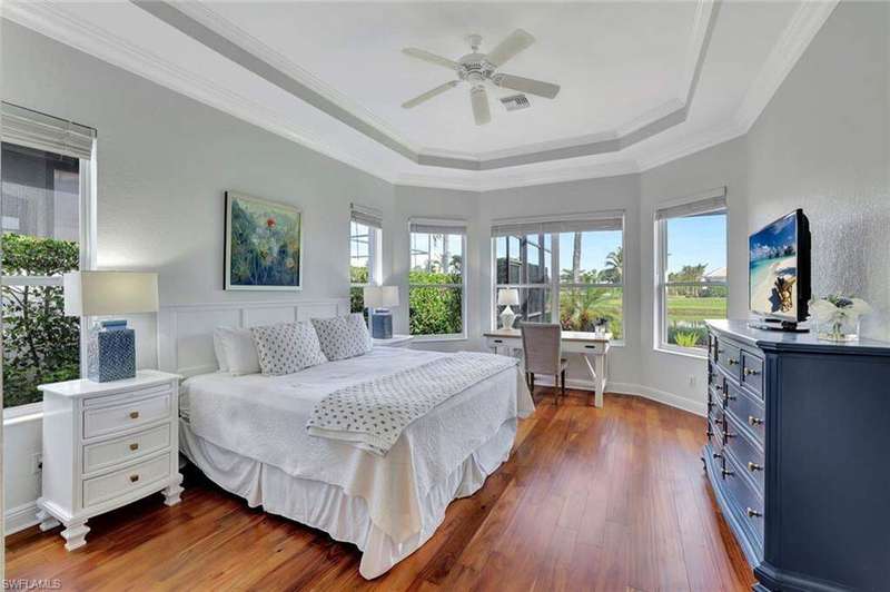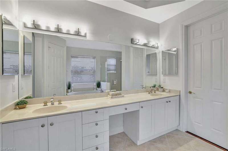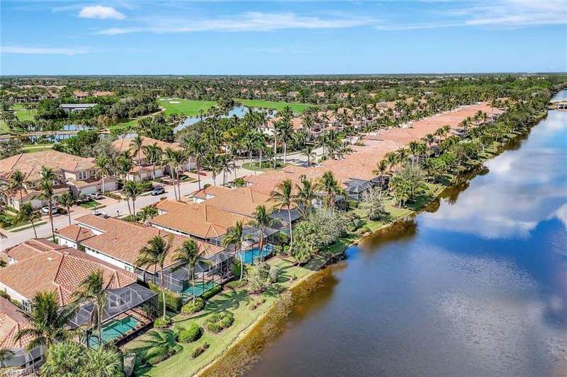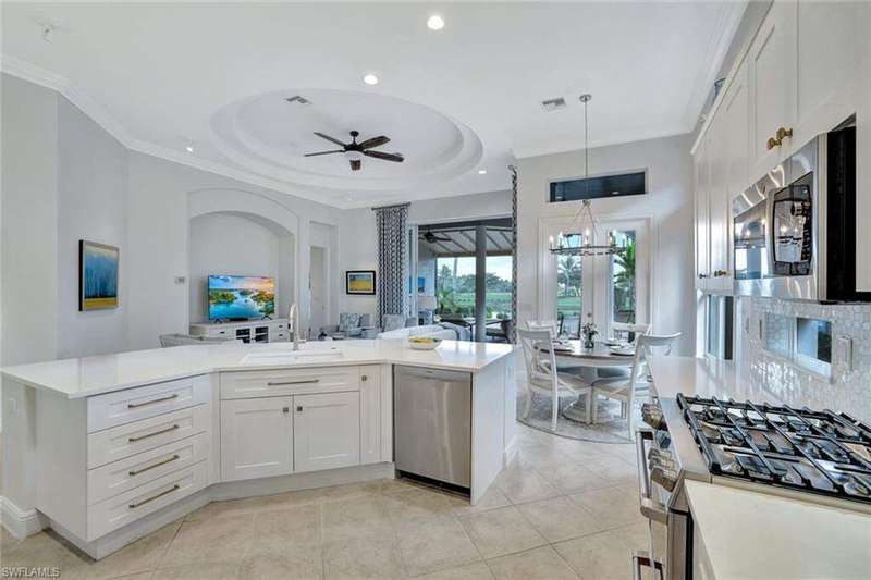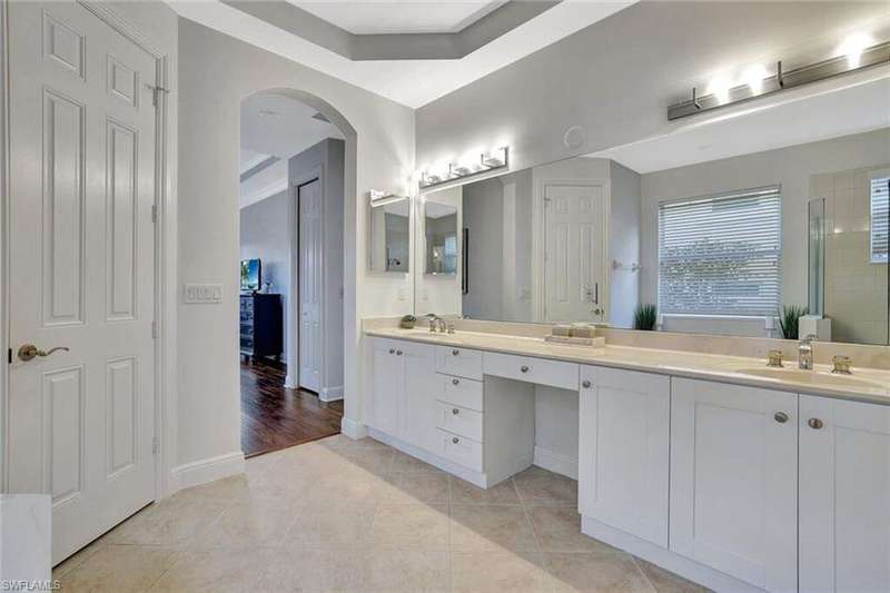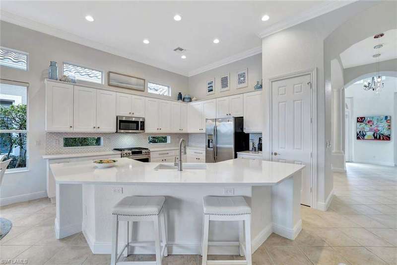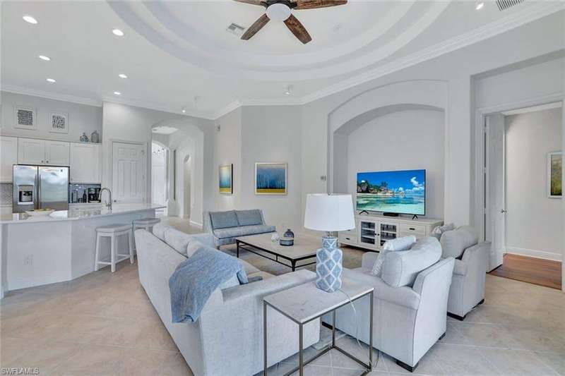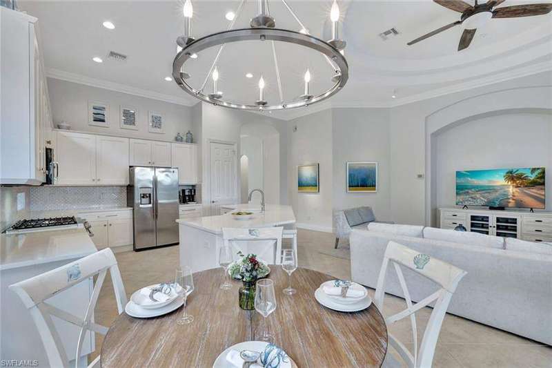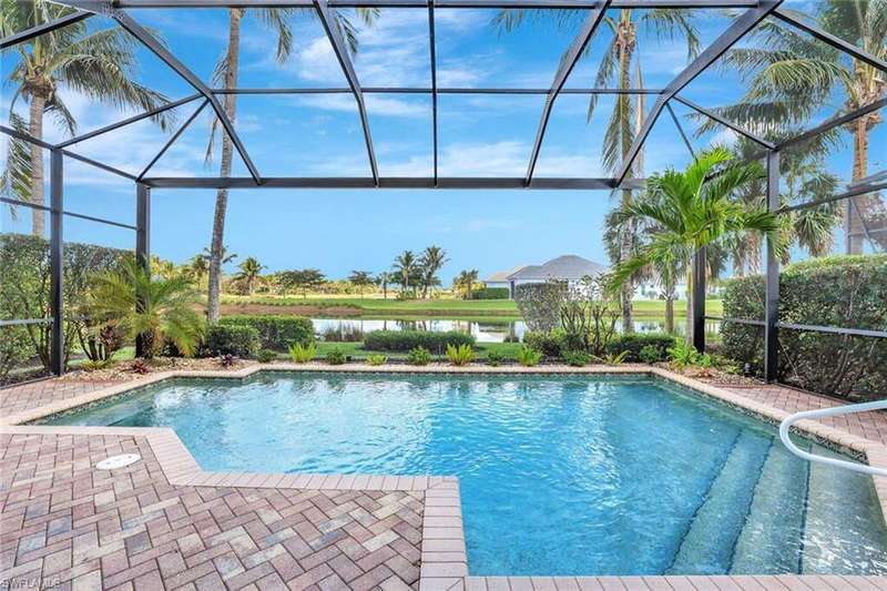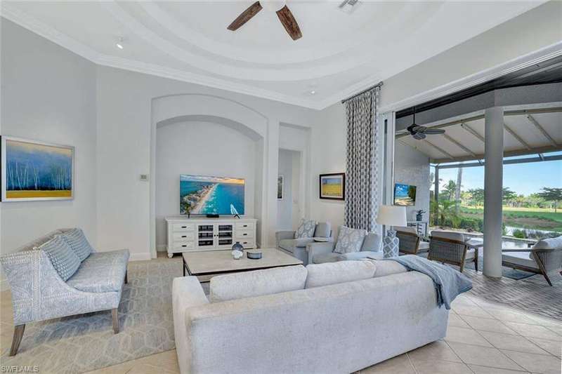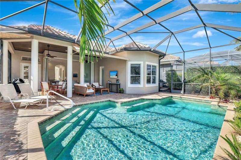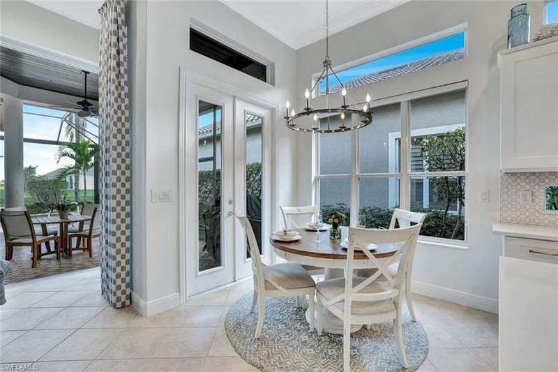 Welcome to this Gulf Bay-built, Primrose model featuring 3 bedrooms, 2 bathrooms, a formal dining/den space and plenty of room for entertaining. The front elevation of the property features elegant architectural elements including a stately wooden garage door, a quaint iron gate that leads into a charming courtyard, and a soaring turret. As you enter the foyer, you are greeted by generous amounts of natural light cast from the various accent windows and the formal dining room's French doors. Step into the great room featuring a stunning kitchen with white quartz counter tops, white cabinetry, and stainless steel appliances. The high ceiling, eat-in kitchen and expansive countertop-height island create an enticing atmosphere for your guests to mingle. The great room opens onto the lanai through zero degree sliders, creating a seamless transition between your indoor living space and the garden-esque tranquility of Fiddler's Creek. The Primary suite features walk-in closets, wood flooring and additional space for a reading nook or office. The home is further equipped with euro-glass shower doors, a Generac Generator, a tankless water heater, an epoxied garage floor, a cypress ceiling over the lanai, a panoramic lanai screen, a lanai awning and a large swimming pool. The award-winning, resort style community of Fiddler's Creek is enhanced by a club and spa, fitness center, swimming pools, two golf courses, tennis courts, pickleball courts, a bocce court, fine and casual dining, social activities, and miles of biking and walking paths. Optional beach club and marina memberships are available. Experience the epitome of luxury living, where every detail is thoughtfully curated to complement your lifestyle. Debt Service CDD PAID IN FULL