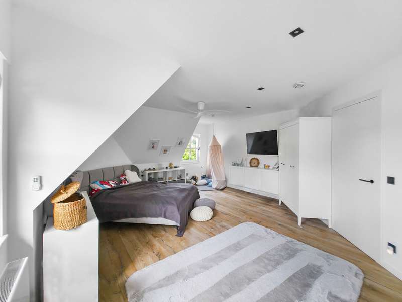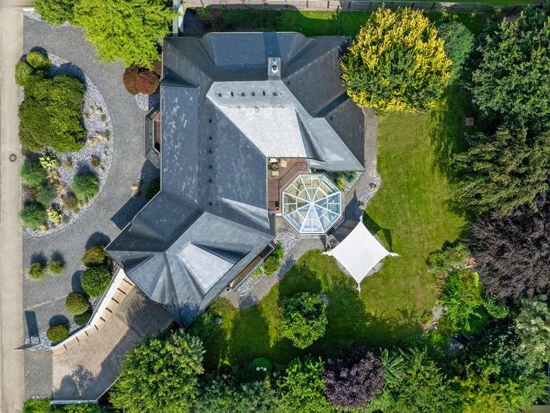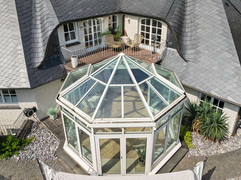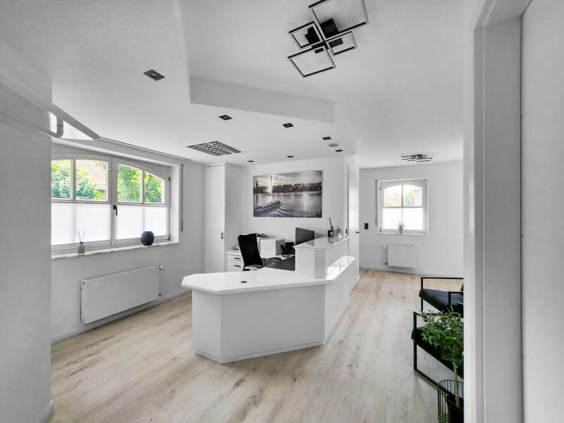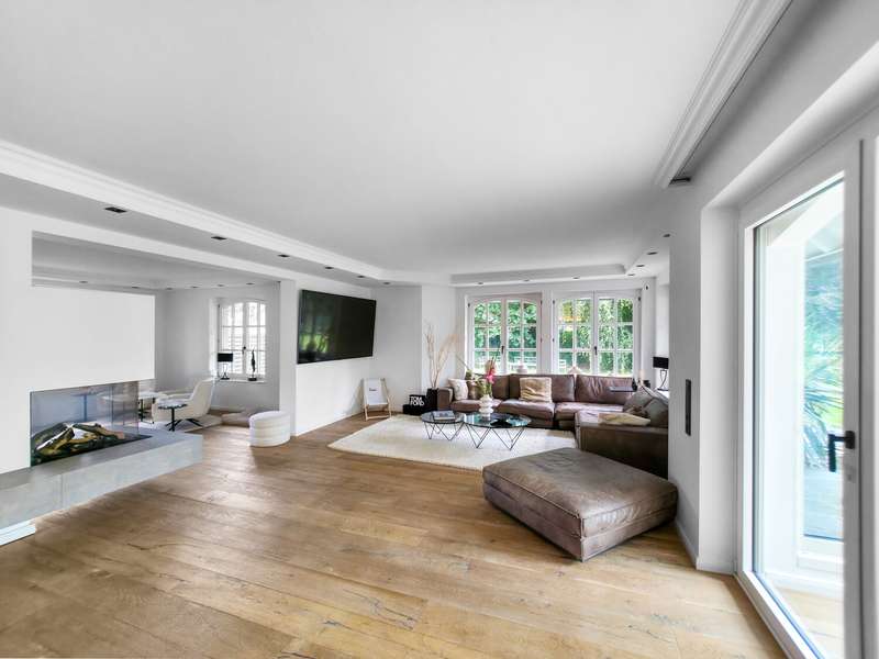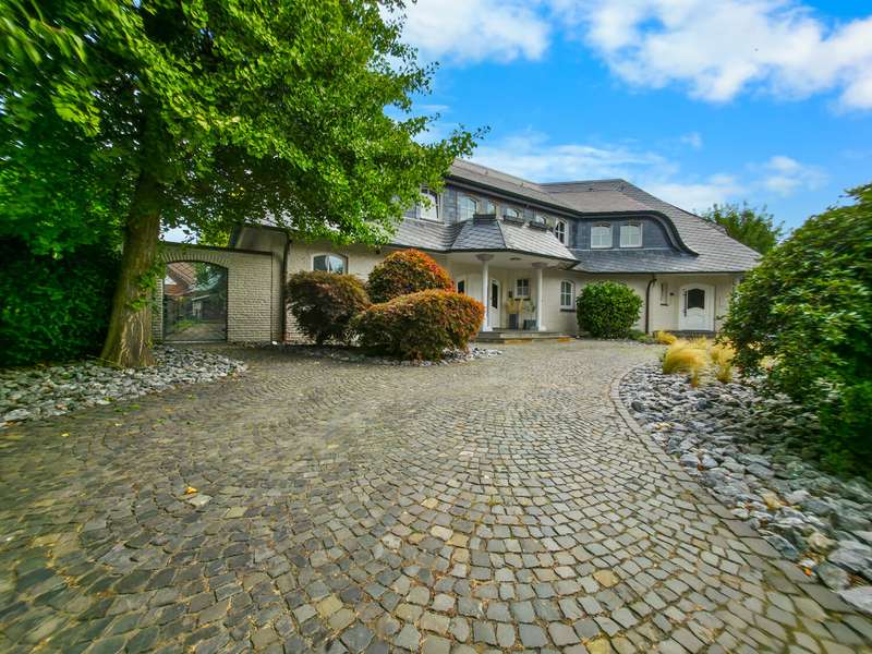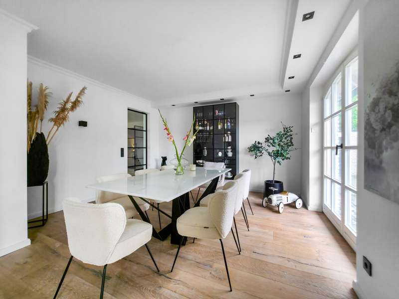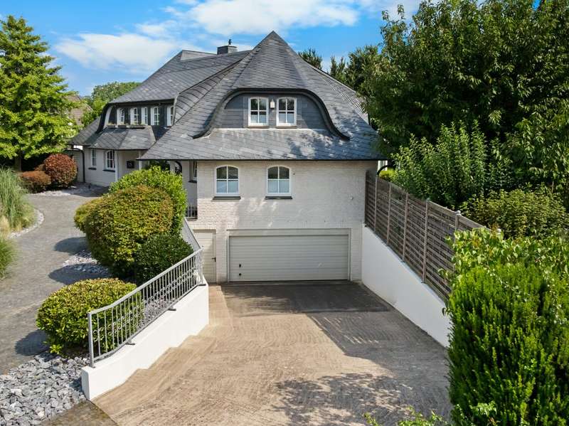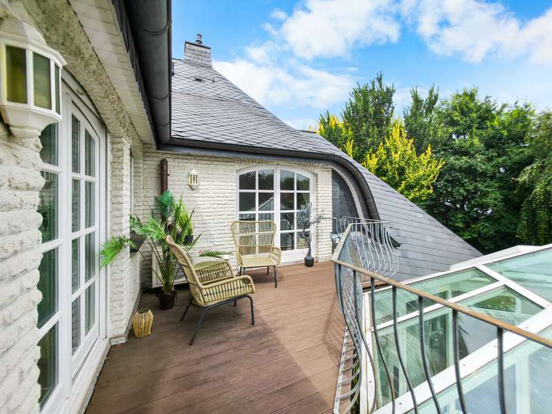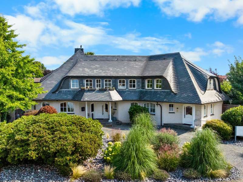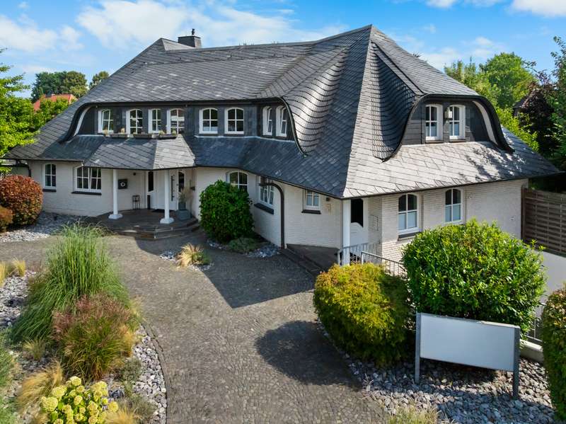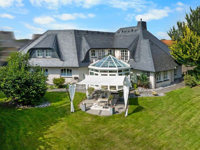 With a living space of approx. 416 m² and a plot of around 1,783 m², this spacious architect-designed villa in the French country house style offers an exceptional amount of space for sophisticated living. Built in 1989 and last extensively renovated and modernized in 2022/23, the house impresses with its high-quality furnishings and wide range of possible uses. The architectural concept sets special accents, for example with the characteristic natural slate roof with bat dormers, which gives the property its unmistakable charm. Even the entrance area underlines the prestigious effect of the property: an elaborately crafted wooden gallery staircase elegantly connects the floors. The 11 rooms are spread over two living levels. The room structure is flexible and opens up numerous usage options. For example, it is possible to create a separate granny apartment in the currently rented office and practice wing or to extend the residential building accordingly. The house is dominated by light-flooded living spaces, which are accentuated by doors in a modern loft design and custom-made, white solid wood doors. A central highlight is the spacious living and dining area with a radio-controlled gas fireplace and recessed LED spotlights in matt black, which provide atmospheric lighting. The space is extended by a heated conservatory with a starry sky that invites you to enjoy special moments. The Ballerina designer kitchen with adjoining utility room is both functional and visually impressive. High-quality floor coverings characterize the sense of space: during the renovation work, approx. 170 m² of real wood parquet, 90 m² of epoxy resin flooring and around 210 m² of easy-care vinyl were laid. The bedrooms - one of which has a marbled en-suite bathroom including a starry sky and dressing room - are located on the top floor. A children's bathroom in mint condition, high-quality bathroom fittings and a separate WC with an impressive LED stretch ceiling underline the high standard of the sanitary facilities. In addition to the classic utility room, the basement has a fitness and wellness area with sauna and shower as well as additional space for hobbies and leisure activities. A double underground garage provides convenient parking. The technical features include an impressive smart home system, video surveillance and a modern entrance control system. The new gas condensing heating system from 2024 completes the overall energy concept. The property is surrounded by an exclusively designed garden landscape, which can be used in a variety of ways and includes a garden shed. Stylish wooden lattice windows with segmental arches, some with soundproof glazing, contribute to the special atmosphere, as do the two balconies. With a total living and usable area of approx. 663 m², this villa presents itself as an outstanding property with impressive architecture, modern technology and an individual feel-good factor. Come and see for yourself - we look forward to hearing from you to clarify any queries, particularly with regard to the rented office and practice space, or to arrange a viewing appointment.