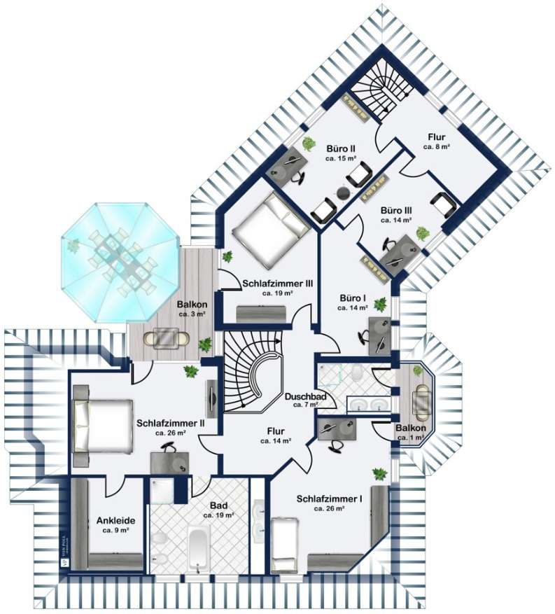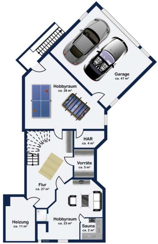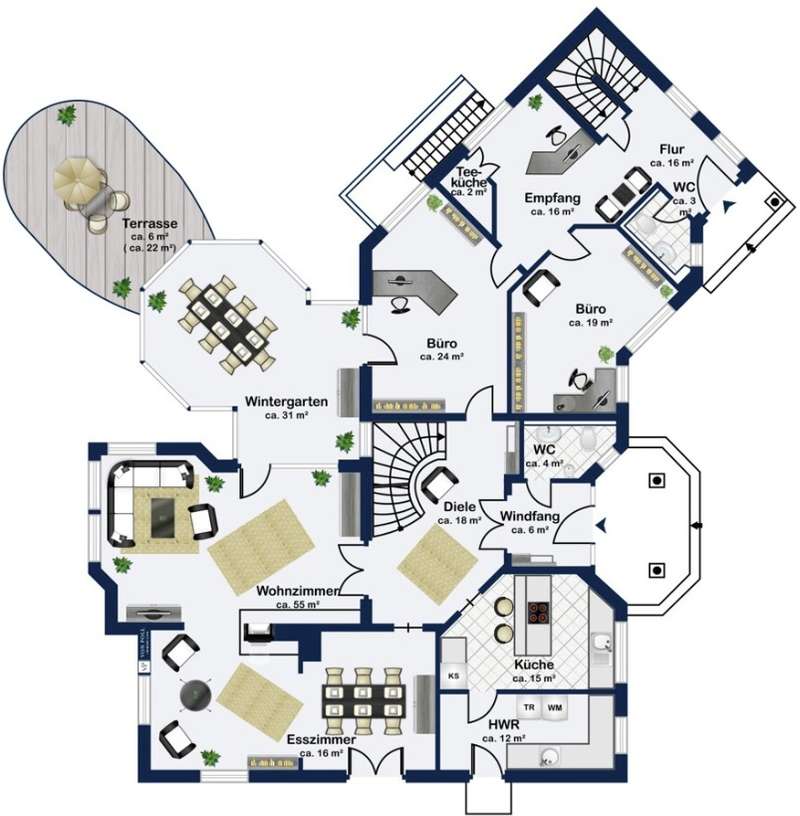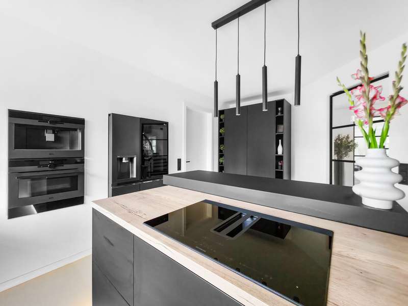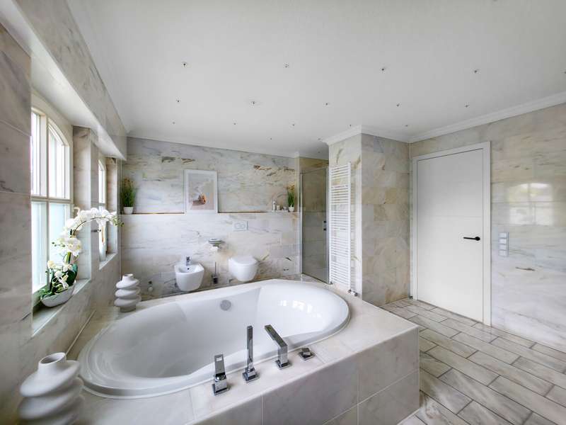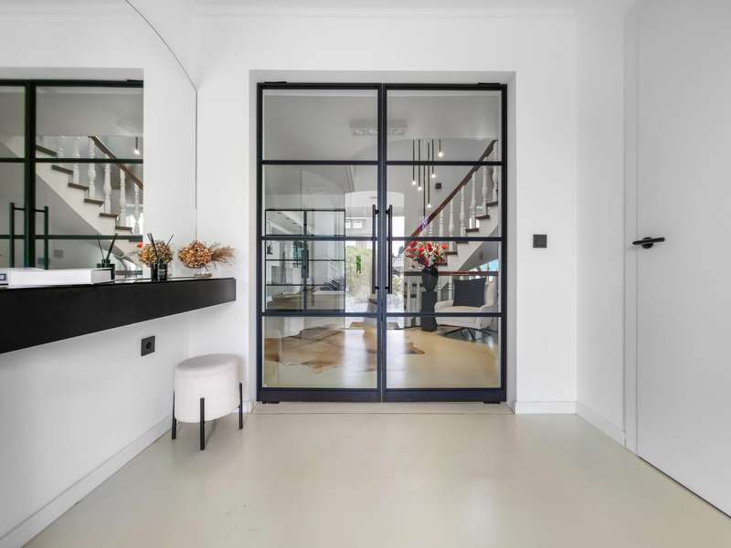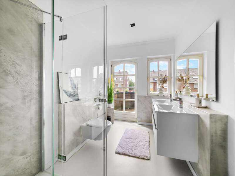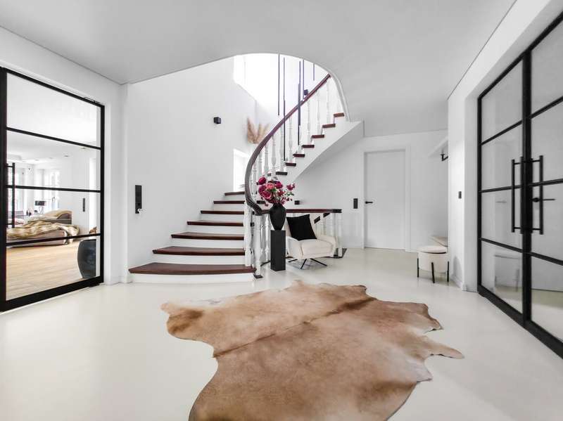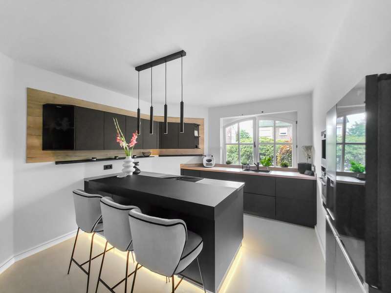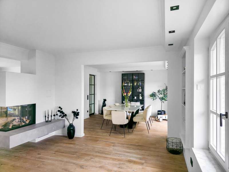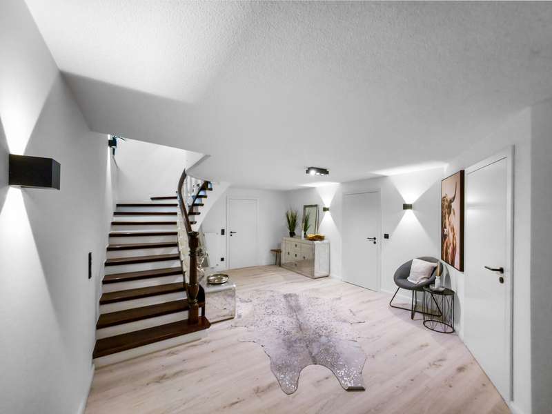 With a living space of approx. 416 m² and a plot of around 1,783 m², this spacious architect-designed villa in the French country house style offers an exceptional amount of space for sophisticated living. Built in 1989 and last extensively renovated and modernized in 2022/23, the house impresses with its high-quality furnishings and wide range of possible uses. The architectural concept sets special accents, for example with the characteristic natural slate roof with bat dormers, which gives the property its unmistakable charm. Even the entrance area underlines the prestigious effect of the property: an elaborately crafted wooden gallery staircase elegantly connects the floors. The 11 rooms are spread over two living levels. The room structure is flexible and opens up numerous usage options. For example, it is possible to create a separate granny apartment in the currently rented office and practice wing or to extend the residential building accordingly. The house is dominated by light-flooded living spaces, which are accentuated by doors in a modern loft design and custom-made, white solid wood doors. A central highlight is the spacious living and dining area with a radio-controlled gas fireplace and recessed LED spotlights in matt black, which provide atmospheric lighting. The space is extended by a heated conservatory with a starry sky that invites you to enjoy special moments. The Ballerina designer kitchen with adjoining utility room is both functional and visually impressive. High-quality floor coverings characterize the sense of space: during the renovation work, approx. 170 m² of real wood parquet, 90 m² of epoxy resin flooring and around 210 m² of easy-care vinyl were laid. The bedrooms - one of which has a marbled en-suite bathroom including a starry sky and dressing room - are located on the top floor. A children's bathroom in mint condition, high-quality bathroom fittings and a separate WC with an impressive LED stretch ceiling underline the high standard of the sanitary facilities. In addition to the classic utility room, the basement has a fitness and wellness area with sauna and shower as well as additional space for hobbies and leisure activities. A double underground garage provides convenient parking. The technical features include an impressive smart home system, video surveillance and a modern entrance control system. The new gas condensing heating system from 2024 completes the overall energy concept. The property is surrounded by an exclusively designed garden landscape, which can be used in a variety of ways and includes a garden shed. Stylish wooden lattice windows with segmental arches, some with soundproof glazing, contribute to the special atmosphere, as do the two balconies. With a total living and usable area of approx. 663 m², this villa presents itself as an outstanding property with impressive architecture, modern technology and an individual feel-good factor. Come and see for yourself - we look forward to hearing from you to clarify any queries, particularly with regard to the rented office and practice space, or to arrange a viewing appointment.