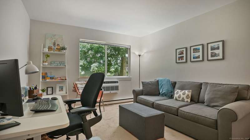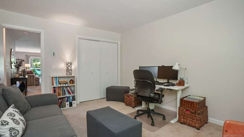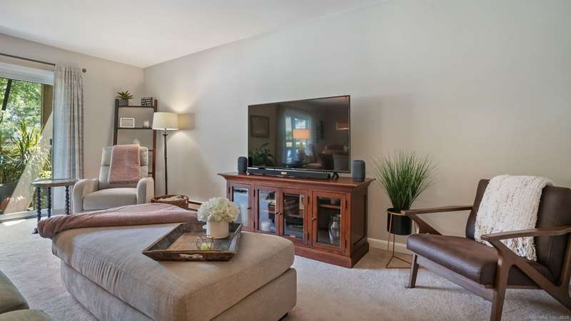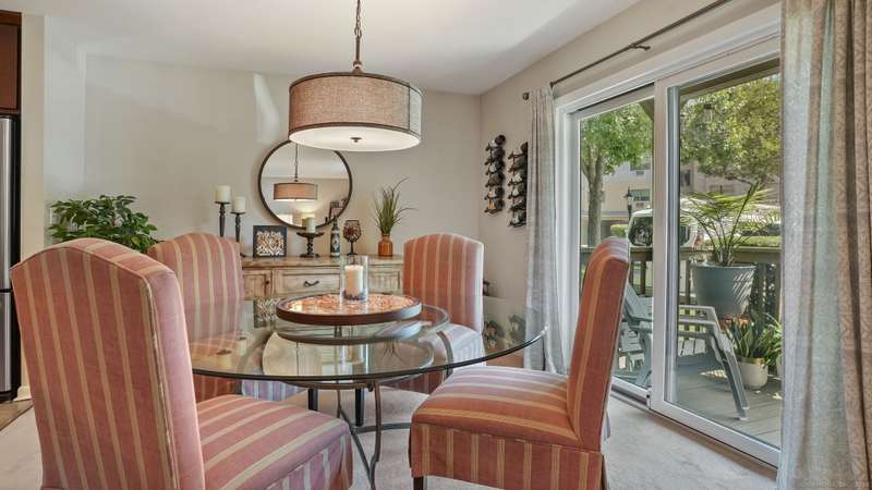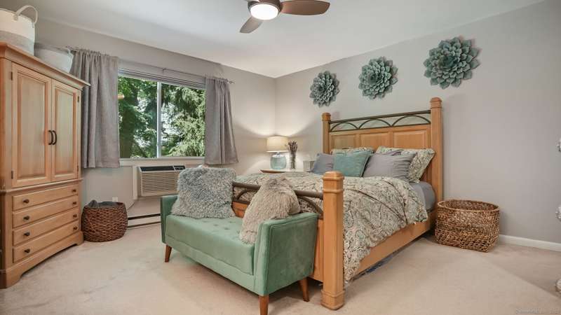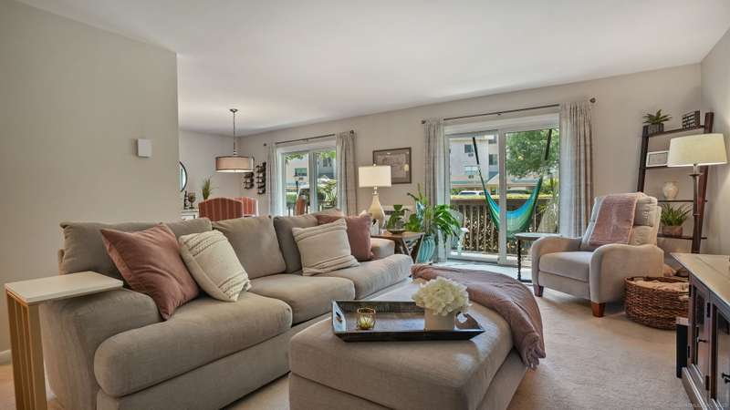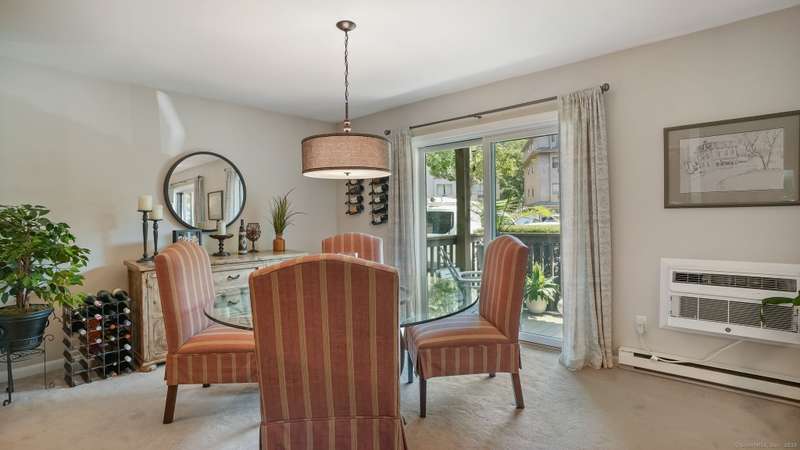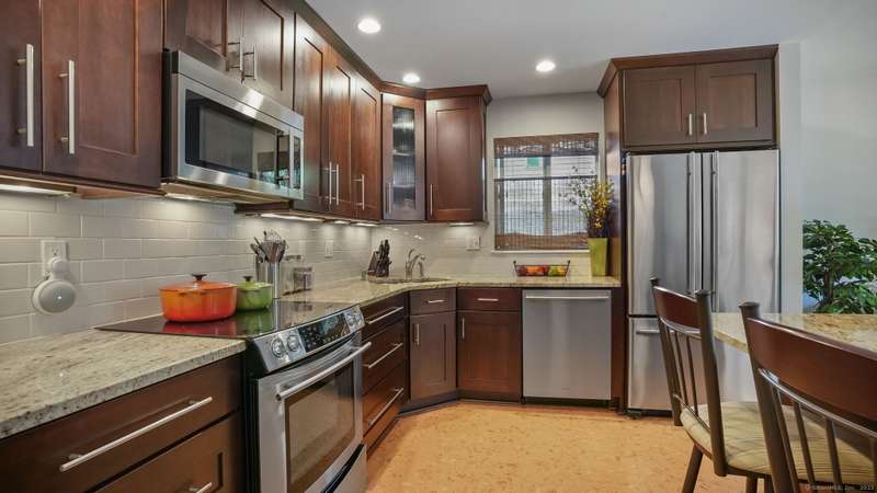 Welcome to Mallard's Landing, where peaceful, park-like surroundings meet everyday convenience. This spacious 2 bedroom, 2 full bath first-floor condo offers 1,196 sq ft of single-level living with no stairs, an open layout, in-unit laundry, and thoughtful touches throughout. The remodeled kitchen, with solid cherry wood cabinetry, granite countertops and Jenn-Air appliances, features a breakfast bar and opens effortlessly to the dining area, complete with a built-in beverage cooler, ideal for entertaining. Two sliding glass doors fill the living space with natural light and lead to a large deck, extending your living outdoors. The primary bedroom features a remodeled bathroom including radiant floor heating, and an Elfa closet system in the large primary closet. Tucked into a quiet community yet minutes from everything, you'll enjoy easy access to I-95, the Merritt Parkway, and a list of local amenities, including the newly opened Target and Wegmans, plus Costco, Home Depot, and more.