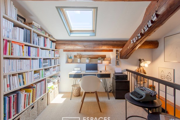The sleeping area, composed of four bedrooms, a bathroom with shower and an office space, offers beautiful volumes and very good light.