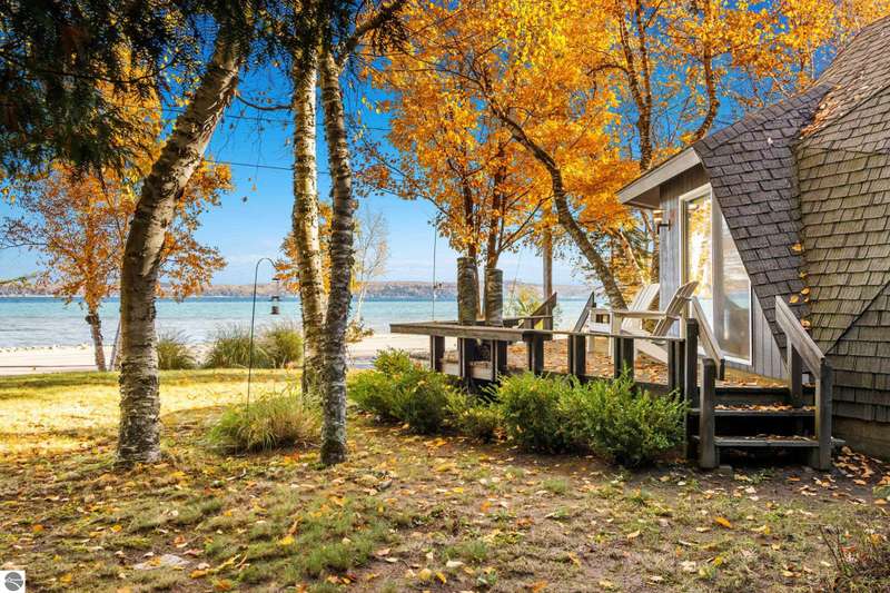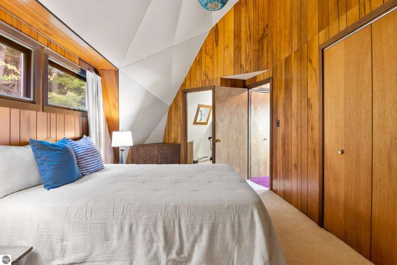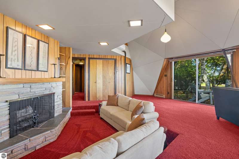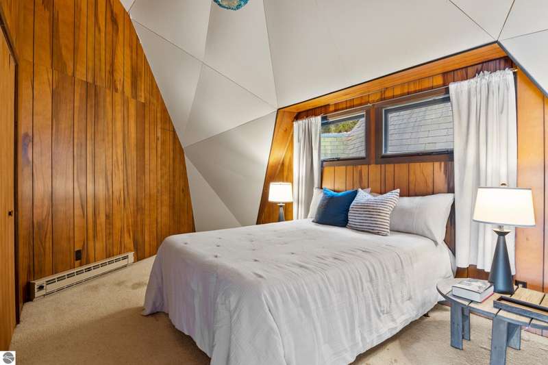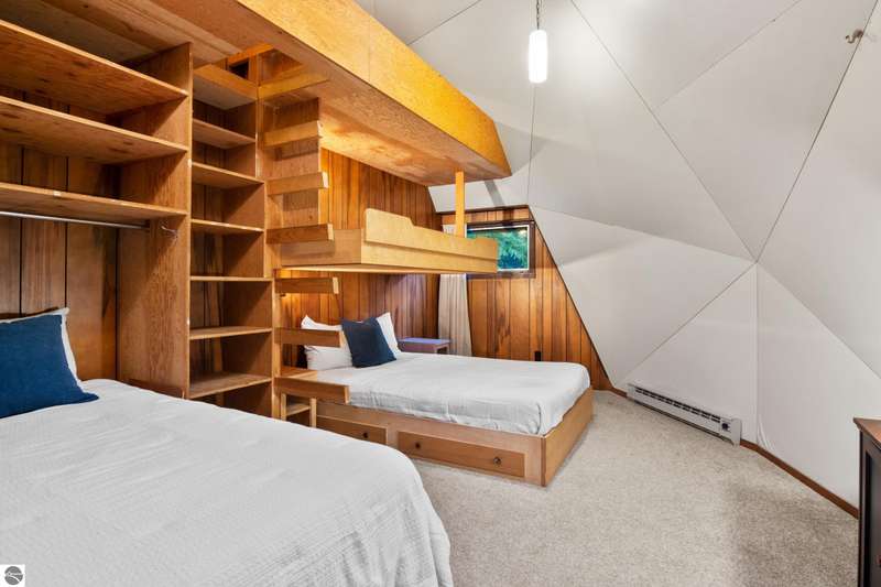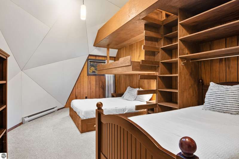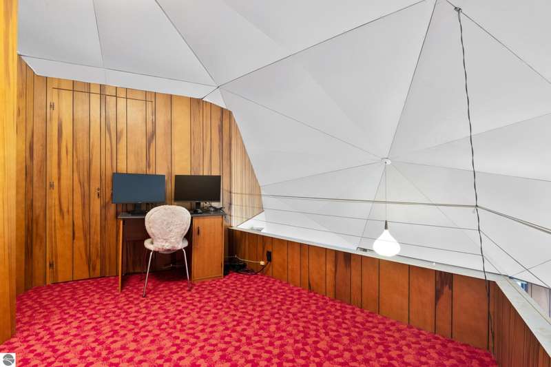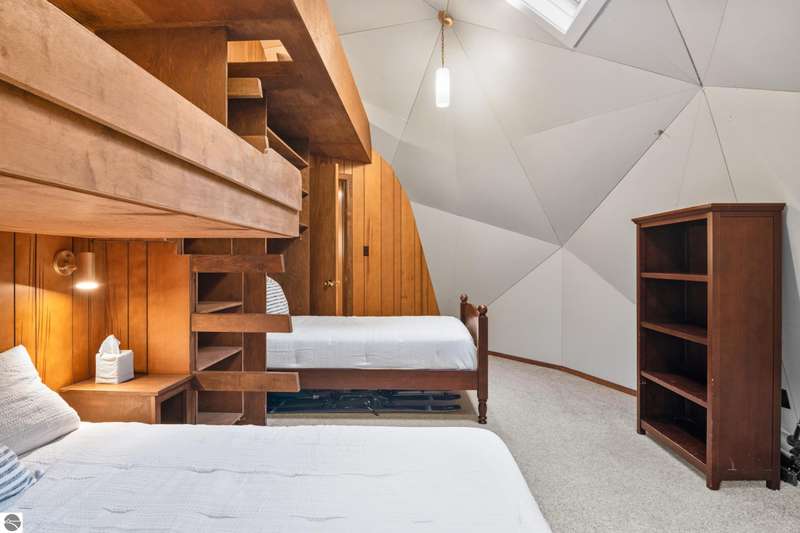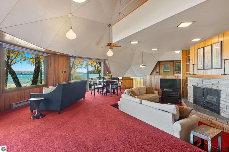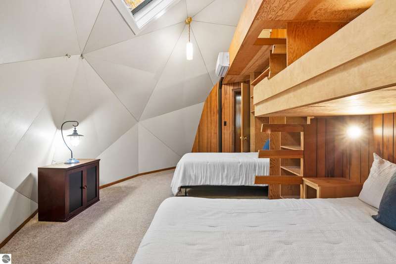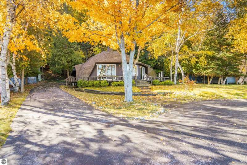 Enjoy private frontage along the south shore of Crystal Lake in this contemporary, geodesic dome home. The open kitchen & dining area flow into a cozy sunken living space with a fireplace, perfect for entertaining or peaceful mornings by the fire. Main floor primary en-suite & two bunk-style bedrooms offering great space for family or guests. The upper-level open loft provides flexibility for a guest room, office, or studio. Step outside to a spacious deck ideal for tranquil mornings, sunset dinners, views of rainbows & the Northern Lights. Detached dome garage offers ample storage for lake gear, boat, or vehicles.