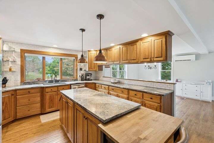 Overlooking downtown Hallowell and the Kennebec River, this carefully crafted 4-bedroom home offers a rare blend of comfort, character, and convenience. Thoughtfully designed and beautifully maintained, every detail of this home reflects quality craftsmanship. The gourmet kitchen features custom black walnut cabinetry, stylish stone countertops, and an open layout to the dining area—perfect for cooking and entertaining in a shared space. A spacious family room with custom built-ins opens to a private den, while the sunlit sitting or music room, lined with south-facing windows, invites relaxation throughout the day. Through glass French doors, discover a versatile four-season room with ceramic tile flooring and a plumbed sink—ideal for use as a gardener's haven, artist studio, yoga space, or home gym. The first floor includes its own private wing with two bedrooms and a shared full bath. Upstairs, the light-filled primary suite features walk-in closets and a tastefully updated bath. You'll also find a guest bedroom, laundry area, and a second full bath on this level. Gorgeous wood floors and efficient heat pumps for both heating and cooling extend throughout the home. An oversized two-car attached garage provides direct entry and leads to a lower level with three large storage rooms. Outside, enjoy a large deck with a retractable awning, overlooking your private back yard with apple trees, blueberry and raspberry bushes. Minutes' walk to Downtown Hallowell and the Kennebec River Trail. Outdoor enthusiasts will enjoy Vaughan Woods, Jamie's Pond, Hutchinson's Pond, and Cobboseecontee Lake. All set on a level lot with a double driveway for easy entry—this home perfectly captures the essence of Hallowell living, where meeting a neighbor quickly becomes making a friend.