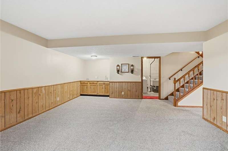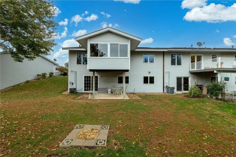 Welcome to this clean 3 bed / 2 bath one-story townhome tucked on a quiet no-outlet street with a private backyard offering great sunset views. Enjoy an open concept main level with vaulted ceilings, lots of windows, a spacious living room and kitchen with SS appliances & center island, a large primary bedroom with walk-in closet, PLUS a relaxing 3-season porch that overlooks the valley. The finished basement includes a cozy family room with wet bar, two additional bedrooms, a 3/4 bath, and a walkout patio door for easy access to the backyard and the covered concrete patio below the 3-season porch. Conveniently park inside the 24 ft deep attached two-car garage this winter. Outside you will find a lush lawn with ample space for gardening or play, beautiful landscaping, and a well-maintained driveway. Recent updates include a new roof, new 3-season porch windows and basement patio door, 1-year-old dishwasher, water heater, and washer. This is a great place to start a new chapter and enjoy peaceful small-town living. No monthly HOA fees. Owners split the cost of hazard insurance. Schedule a private tour today.
