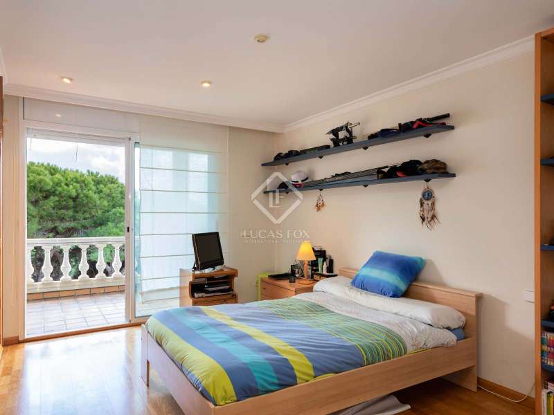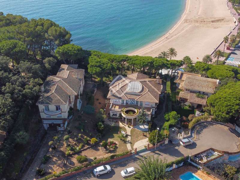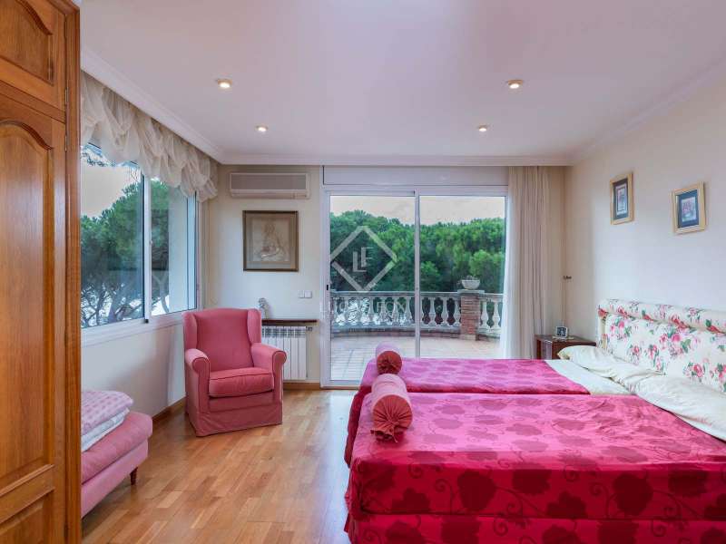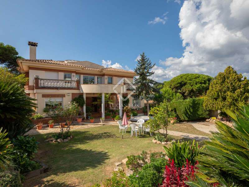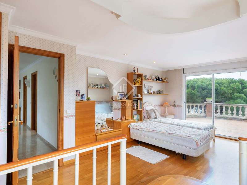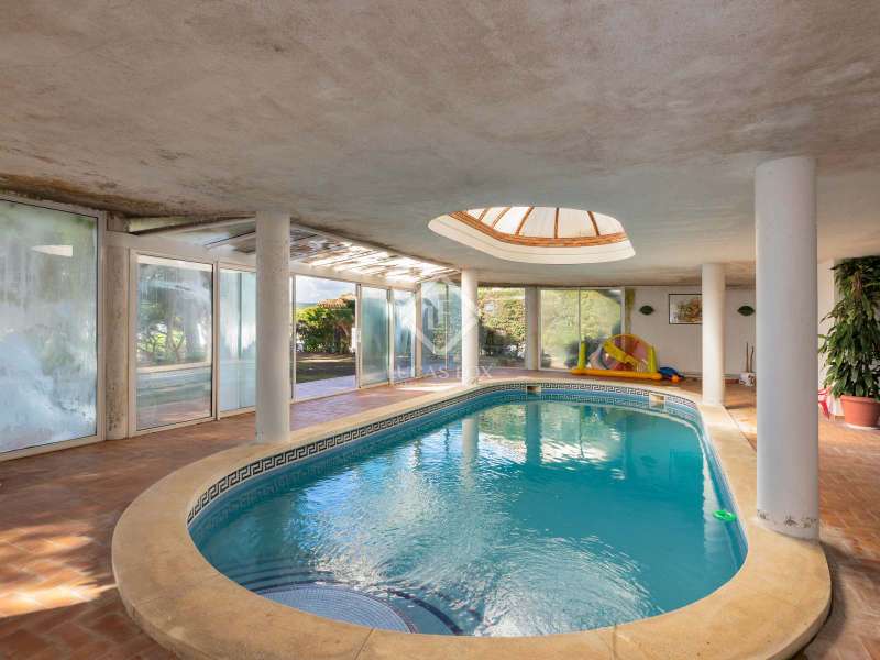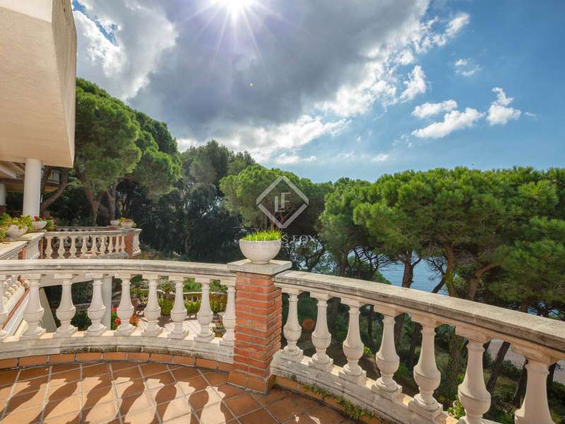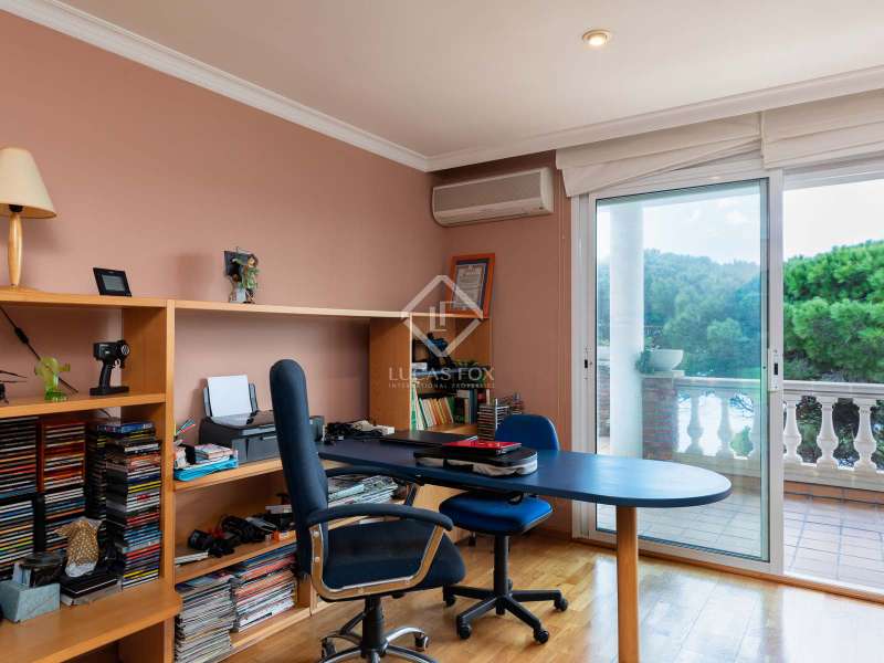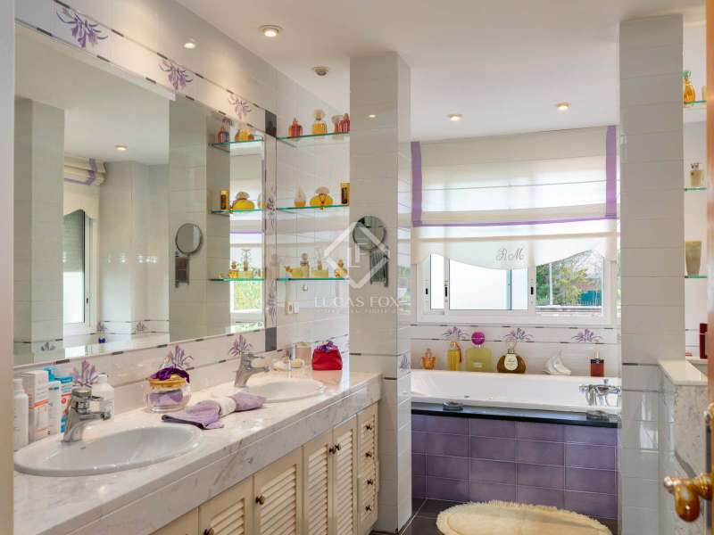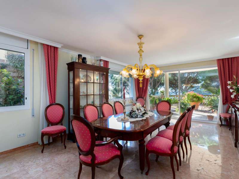 The villa enjoys beautiful views of the Mediterranean and the horizon and boasts a sheltered garden with pine trees that act as a natural awning and provide shade in the afternoon. The property covers a built area of 1,100 m² and is located on a plot of 2,300 m². It offers an extensive garden both in the front and in the back. In the morning, the sun illuminates the front, while in the afternoon, it illuminates the area facing the sea. We enter the house through a well-kept garden with flowers, plants and natural grass. Once inside the house, a majestic entrance leads us to a spacious and bright double-height hall. On the ground floor we find the large living room with two rooms, with a fireplace and large windows that lead to a terrace with sea views. The dining room is separated from the living room by a door. It is very spacious, with plenty of space to accommodate diners and guests. Both the living room and the dining room have direct access to the large terrace and the garden with lawn and pine trees. Just behind the dining room is the kitchen, which in turn communicates with the lower part of the house. The main floor also houses a guest bedroom, a complete bathroom and an office. To go up to the second floor we have a majestic double staircase located on both sides of the hall. This level enjoys plenty of natural light thanks to a huge skylight and large windows that connect to the front terrace. Of the three bedrooms located on this floor, two of them have their own bathroom. The bedroom in the middle includes a semi-separate office and uses the bathroom that is located on the same floor, but not inside the bedroom. All bedrooms have direct access to the terrace, with views of the sea and the sunset. The lower part of the house is composed of a large covered pool, garage, technical installations, pantry and laundry room. We can access the lower ground floor both from the inside (in the kitchen there is a direct staircase) and from the outside, specifically through the terrace on the ground floor or through the garden.