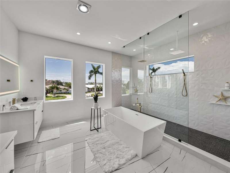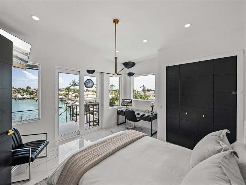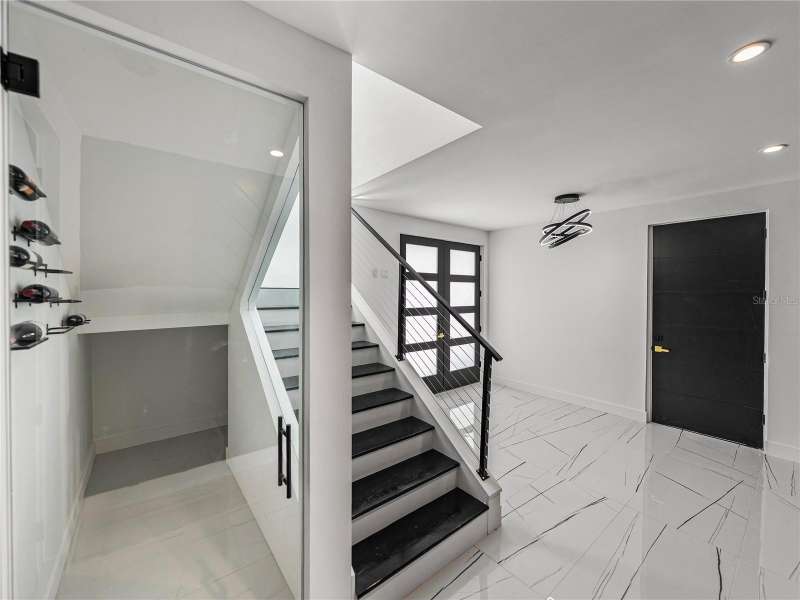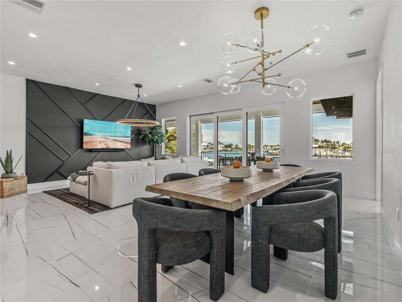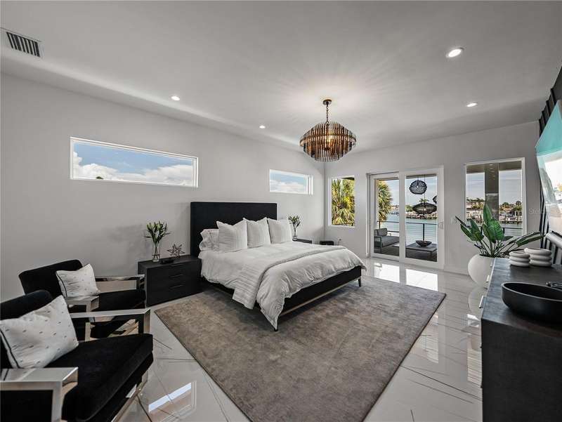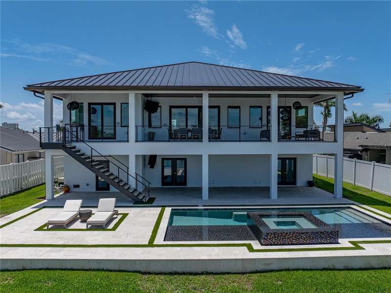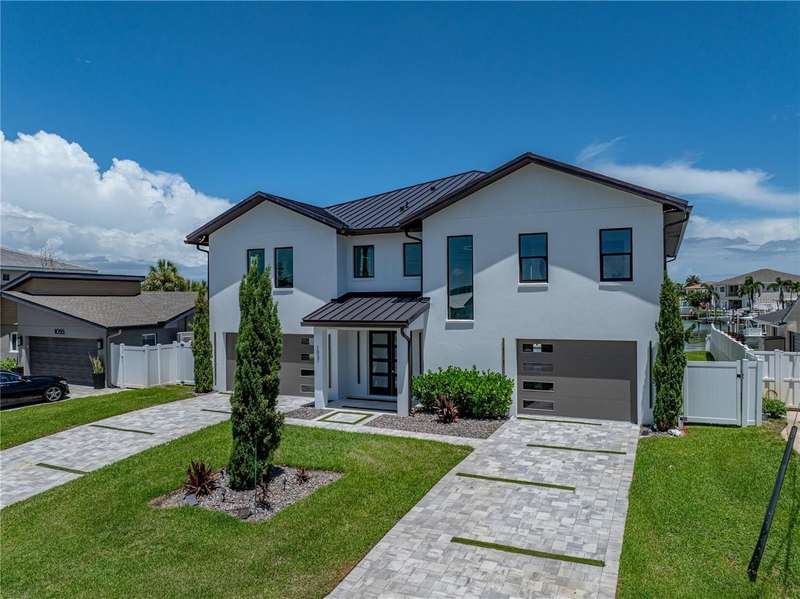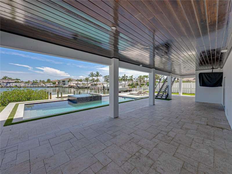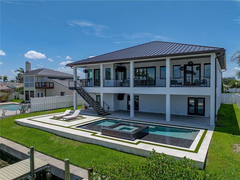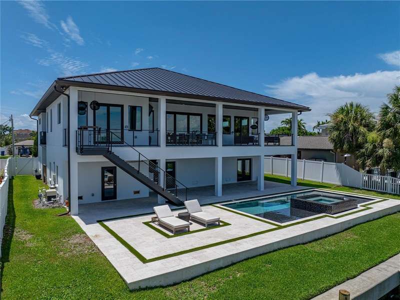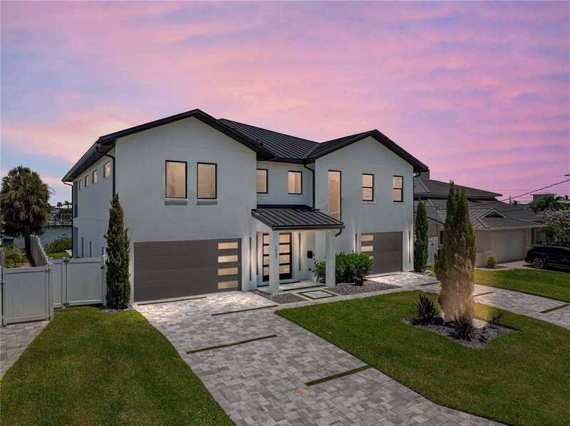 Timeless clean line architecture meets luxury waterfront contemporary Italian design with this 2022 custom built home in the charming community of Yacht Club Estates. The foyer welcomes you with modern elegance, leading past a striking accent wall and a glass-enclosed wine display room toward the staircase to the main living area. The main floor offers fabulous water views with its open concept and access to the upper lanai. You’ll notice top line finishes throughout with light-filled living spaces including a chef’s kitchen outfitted with Miele gas range/oven convection combination with upgraded range hood, Miele refrigerator, microwave drawer and undercounter beverage refrigerator. The solid wood custom cabinets pair perfectly with the expansive center island which is ideal for casual gatherings and entertaining guests. As you move through the living and dining areas the inviting lanai awaits with solid wood tongue and groove ceilings, designer lighting fixtures and views of the heated saltwater infinity edge pool/spa with over 2000 sf of exotic travertine and turf landscaping design. Steps away, the composite oversized dock boast electricity, solar uplighting and running water. The primary bedroom is a calming oasis with lovely water views, access to the lanai and large custom closet. The stunning bath area showcases a free-standing tub and enhanced double walk-in shower all elegantly designed as a spa environment. Three additional bedrooms include custom closets and designer lighting. Downstairs highlights a car collector’s dream garage with parking for up to 10 prized cars or an incredible flex activity area with French doors leading to the lower lanai with the resort style pool. The home also includes Restoration Hardware designer chandeliers and recessed lighting on dimmers throughout, separate laundry room, tankless water heaters, Sonos system w/all existing Smart TVs, battery powered BLINK camera system, irrigation system and outdoor corner motion detector security lighting. The location couldn't be better with world famous pristine beaches nearby and the vibrant downtown St Petersburg, just a 20 minute drive away, offers enticing dining, museums, entertainment experiences and professional baseball and soccer teams. This tranquil residence with its exquisite sunset views offers the ideal blend of elegance, and waterfront living for the lifestyle you desire.