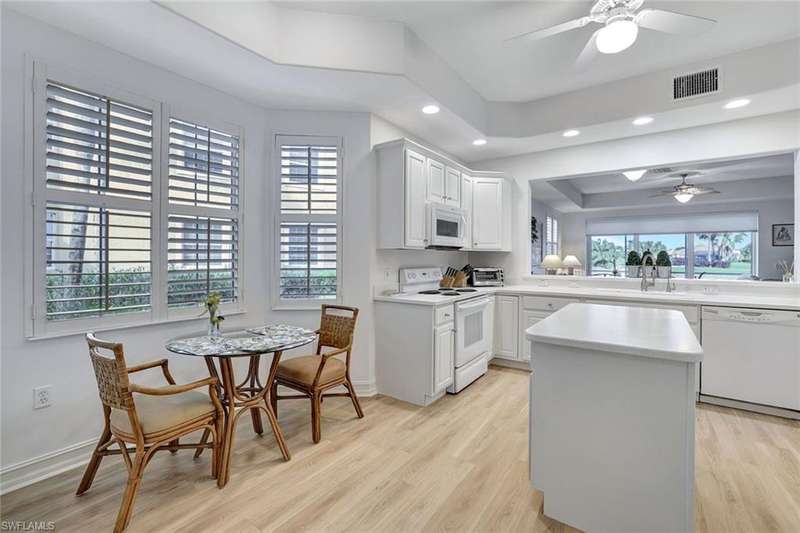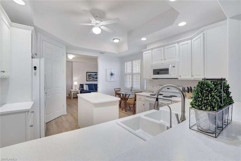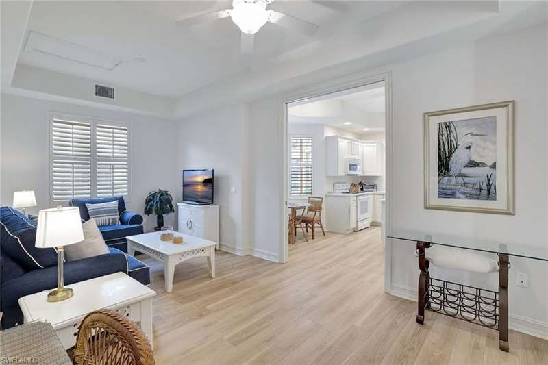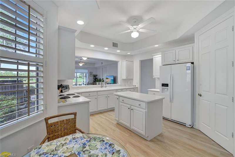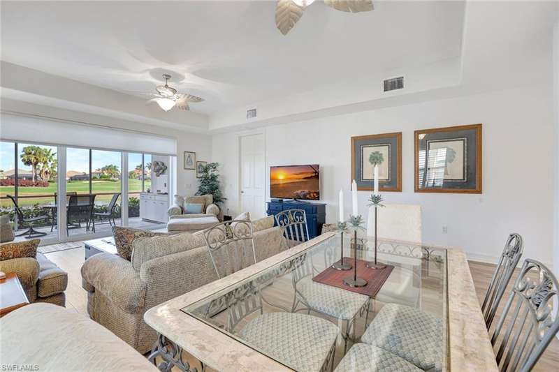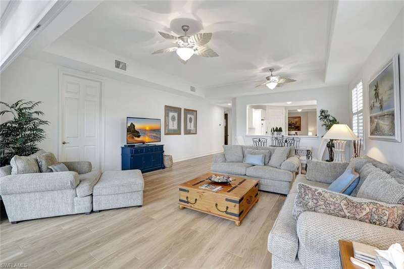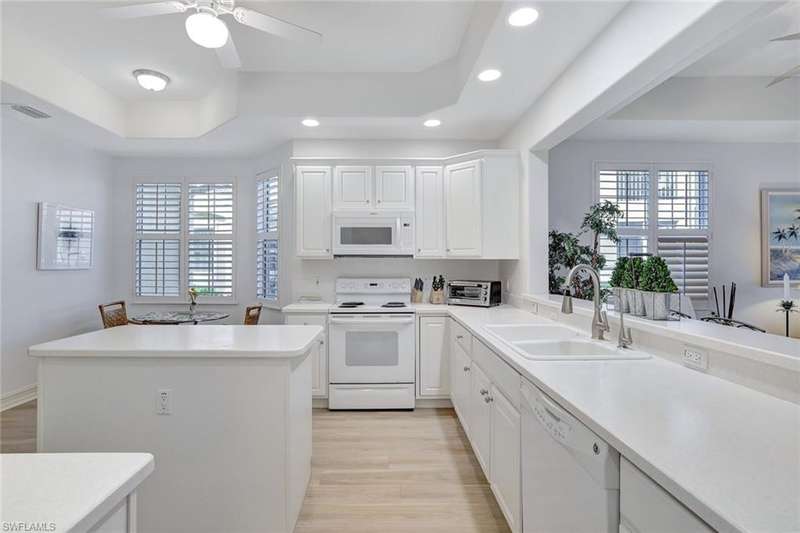 Immaculate 1st floor coach home with beautiful landscaping and peaceful lake and golf course views. Upgrades include plantation shutters, over sized tile in main living area, spotless carpeting in bedrooms, & tray ceilings. Large open kitchen features a breakfast nook, hard surface counters, walk-in pantry, & over sized pass-through into dining room. The office/den features pocket doors for added privacy. Built-in JennAir grill on the lanai creating the ideal setting for gathering guests outdoors. The master Suite includes spacious seating area, bay window hers walk-in closet, generous his closet with double mirrored doors, double vanities with sit down counter for her, soaking tub, separate pocket entry door. Family & friends can also indulge in a perfectly appointed guest suite with twin beds, large vanity and sparkling tub. Enjoy the exclusive amenities The Strand has to offer -- a heated pool and full service clubhouse with formal and casual dining, media center, pro-shop, basketba