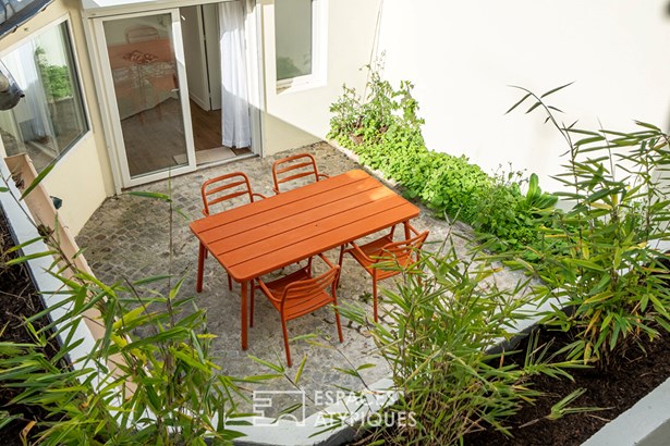 The ground floor is a welcoming living space of over 40 m2, illuminated from all sides by bay windows, with a beautifully paved courtyard at its center.