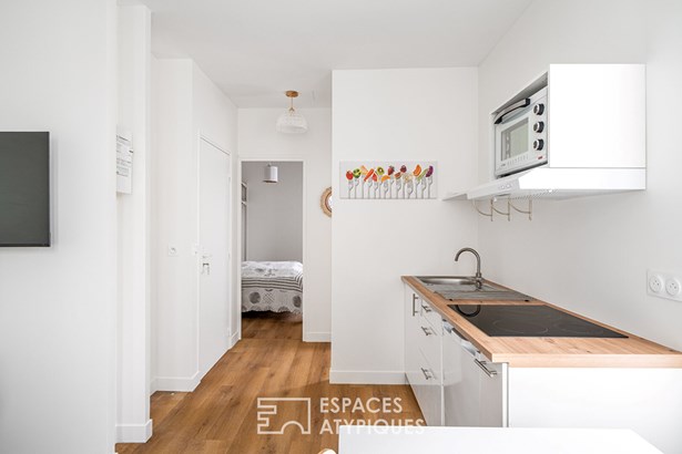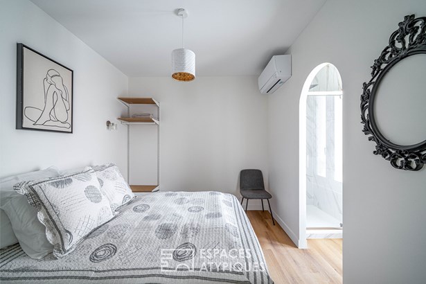 The top floor houses a separate apartment, consisting of a living room with a kitchenette, a bedroom, and a bathroom. This floor offers the freedom to imagine a reception area, an office, a workshop, or an additional bedroom.
