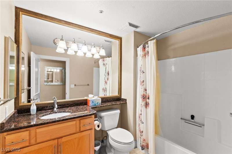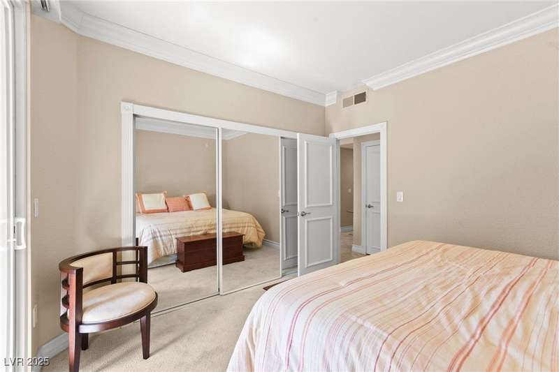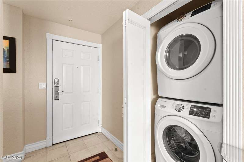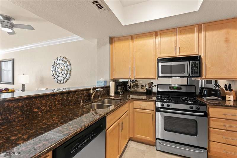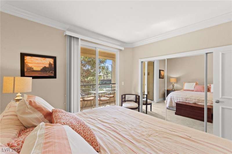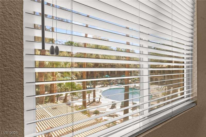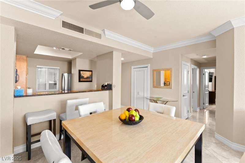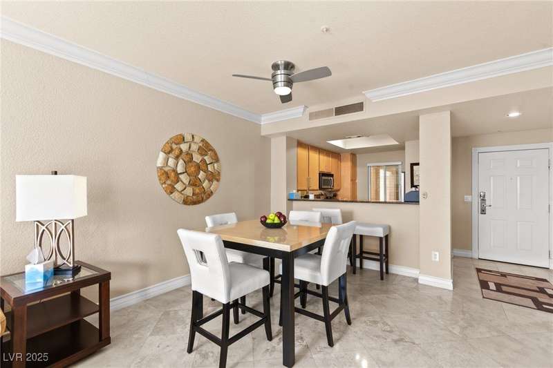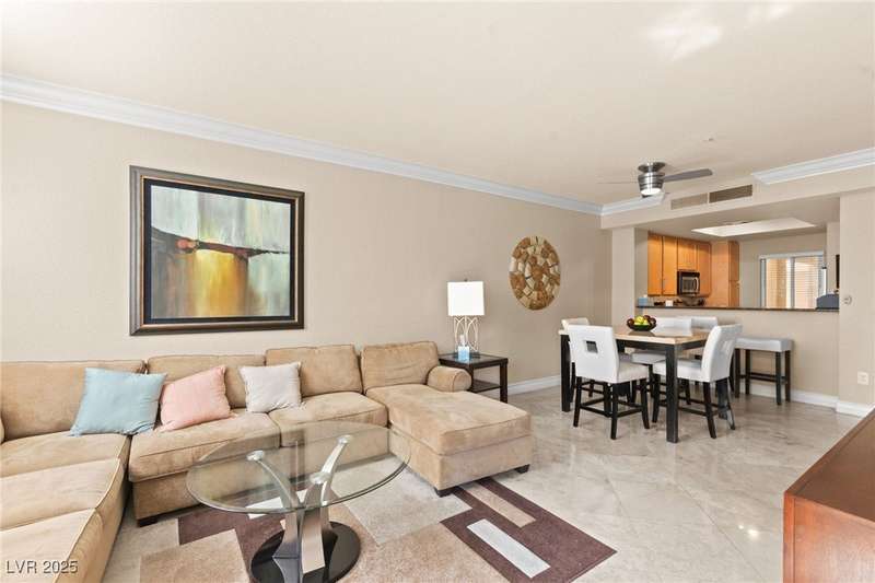 Experience resort-style living in this beautifully maintained 2 bedroom, 2 bathroom condo just minutes from the Las Vegas Strip. This inviting corner unit offers an open-concept layout with crown molding, modern ceiling fans, and polished tile flooring throughout the main areas. The kitchen features granite countertops, stainless steel appliances, and ample cabinet space—perfect for entertaining. The spacious living room opens to a private balcony with tranquil views of the mature landscaping and resort-style pool. The primary suite includes plush carpeting, a large window for natural light, and an ensuite bath with granite counters and a walk-in shower. The secondary bedroom is equally comfortable, with easy a separate full bathroom. Additional highlights include in-unit laundry, furnishings, custom lighting, and a gated entry with secured access. Ideal as a vacation home, investment property, or full-time residence—this condo offers luxury, comfort, and convenience in one.