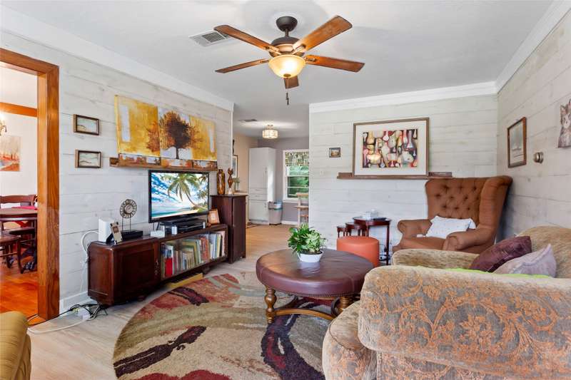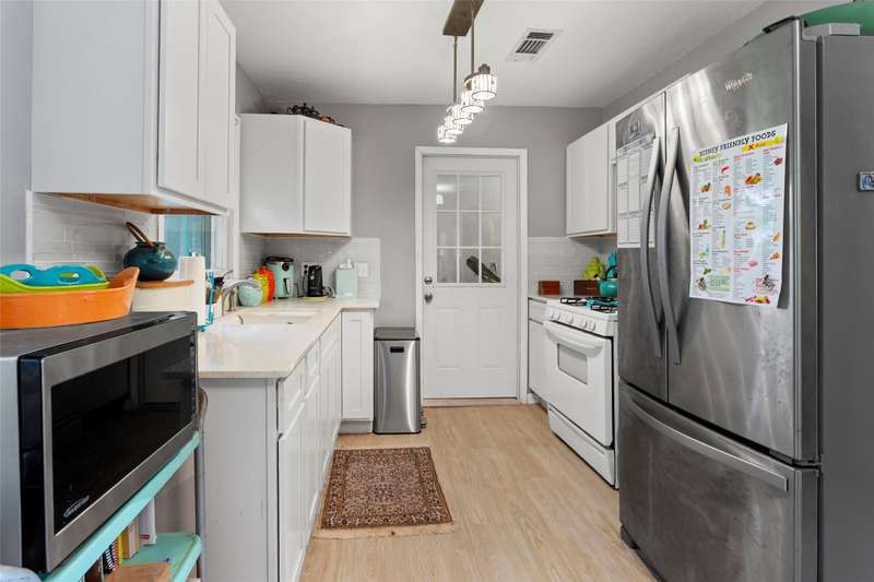 Charming 2 bed, 1 bath starter home in the heart of Dickinson. Updated kitchen with soft close cabinets drawers, glass backsplash, quartz counters, custom lighting, and luxury vinyl plank floors. Some original hardwood floors, crown molding, and shiplap walls add character. Enjoy a huge fenced backyard with shade trees. Located in a quiet neighborhood with easy access to all the great restaurants in San Leon, Kemah, and Dickinson's own Marais. Garage got a little water in Harvey so French drain was installed.
