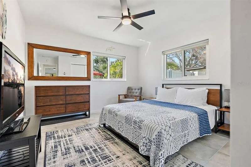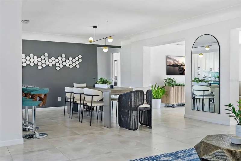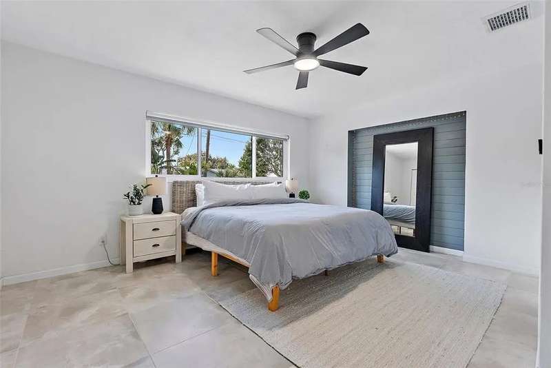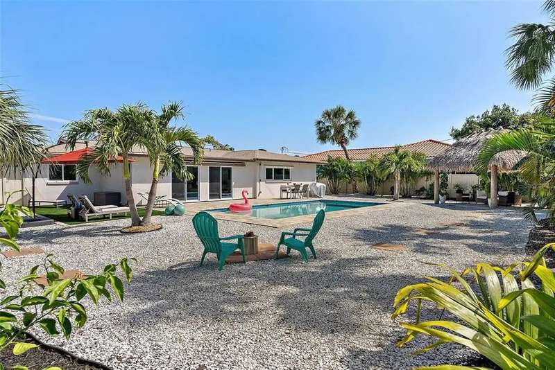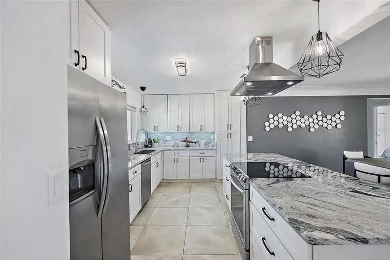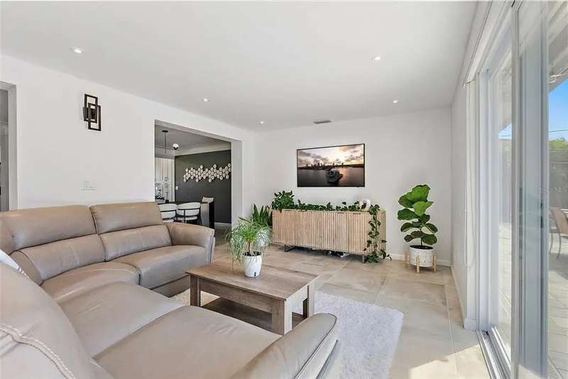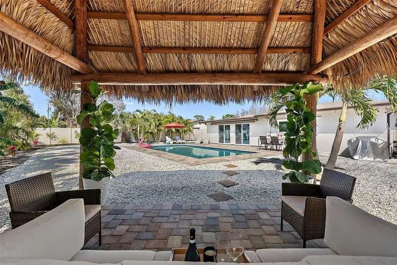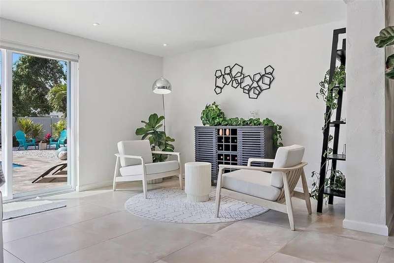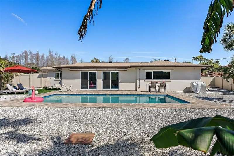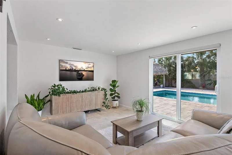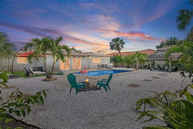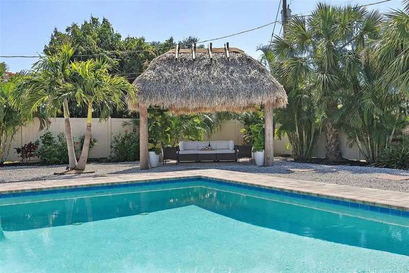 Nestled in the beautiful Broadwater neighborhood of St. Petersburg, this stunning 3-bedroom, 2-bathroom pool home offers the ultimate Florida lifestyle. Located just 10 minutes from world-class beaches and the vibrant energy of downtown St. Pete, this property is a true gem. This home has been thoughtfully renovated to blend modern comforts with effortless, low-maintenance living. Step inside to an open-concept floor plan with beautiful, large-profile tile flooring throughout. The gourmet kitchen is a chef's delight, featuring real wood, soft-close cabinets, stainless steel appliances, a fully-ventilated range hood, and granite countertops. The inviting primary bedroom is a serene retreat with a lovely en-suite bathroom, dual sinks, and a beautifully tiled oversized shower. It also boasts two custom closets, one designed for the shoe lover in all of us. The two additional bedrooms are spacious and versatile, perfect for guests, a home office, or a playroom. The bright and stylish second bathroom offers a modern and clean aesthetic with a generous-sized vanity and a bath tub. Custom window coverings throughout the home provide both privacy and a touch of modern elegance. Step outside to your private backyard tropical paradise, a perfect setting for entertaining or relaxation. The expansive yard features a wifi-controlled heated saltwater pool, a charming Tiki Hut, fruit trees, a paver patio, and a new artificial turf lounge area. Dual SunSetter outdoor shades offer the flexibility to create a shaded outdoor space or reduce sun exposure inside the home. The yard is designed for minimal upkeep with wifi-controlled irrigation, heavy-duty weed barrier, and white shell landscaping. The entire backyard is fenced with a double gate on one side to allow you to easily store your boat or RV in the side yard. This home is packed with recent updates for energy efficiency and peace of mind: solar-powered attic fans and blown-in insulation (2024); an electrical panel upgrade with a generator transfer switch connection (2023), new roof with hurricane straps (2021); brand-new HVAC system with ductwork, a new water heater, and high-end PGT hurricane impact windows and sliders (2019). With its prime location, modern upgrades, and inviting outdoor spaces, this is the perfect place to call home. No flooding, water intrusion, or storm-related damage occurred during the historic and active 2024 hurricane season. For VA-qualified buyers, there's an option for a VA loan assumption at an attractive 5.5% interest rate.