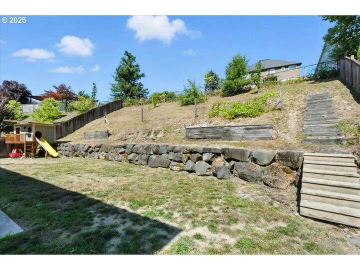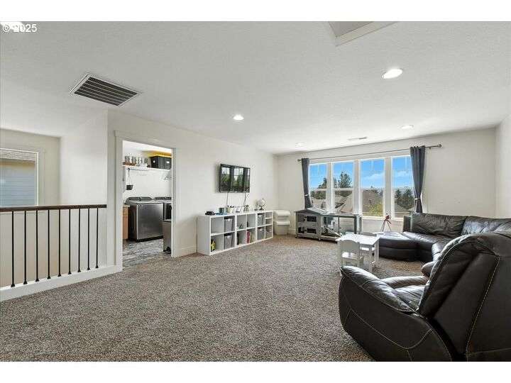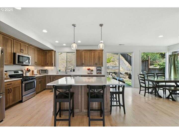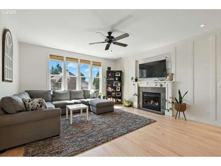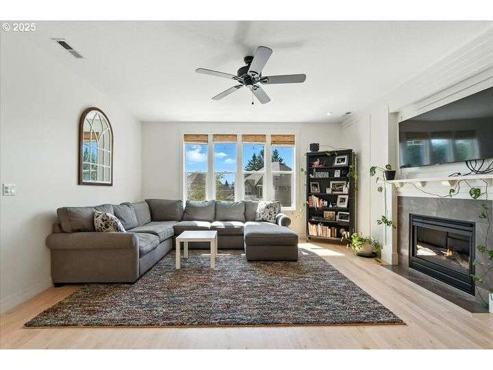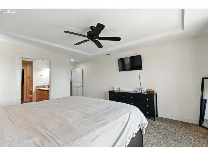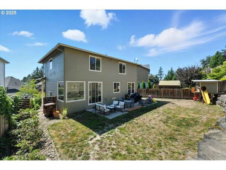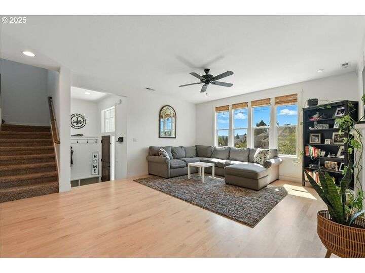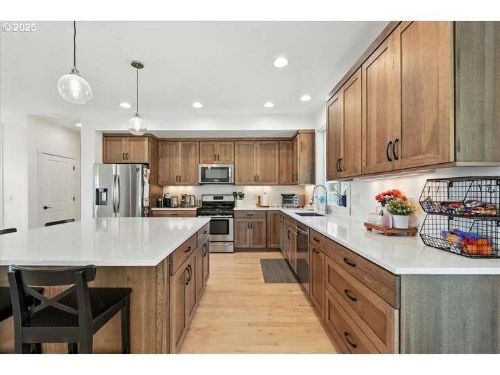 This stunning 5-bedroom, 3-bathroom home offers both comfort and style, complete with an oversized 4-car garage. Maple hardwood floors flow throughout the great room, where a cozy gas fireplace frames sweeping territorial views. The kitchen shines with quartz countertops, hickory cabinetry, and a spacious island, opening to a bright and airy dining area. Two main-floor bedrooms and a full, main-floor bathroom provide convenience and flexibility. Upstairs, a generous loft/bonus room showcases panoramic views, while the primary suite offers a private retreat with a soaking tub, dual sinks, and a walk-in closet. Two good sized bedrooms, a full bathroom and a convenient laundry room complete the upstairs. Oversized 4-car garage with storage area and utility sink. Large fenced backyard with a patio perfect for relaxing. To top it all off, don't miss the clubhouse featuring an indoor pool, sauna, fitness center, and party room, or the neighborhood trails and play areas.