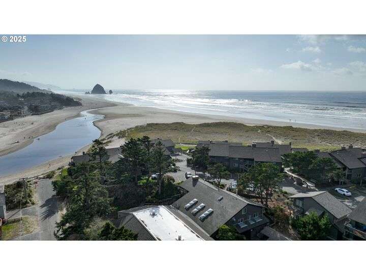 Experience refined coastal living in this exceptional 2-bed, 2-bath condo showcasing panoramic ocean, creek, and Haystack Rock views. The light-filled living area with a wall of windows, spacious bedrooms, and updated baths blend comfort and sophistication. Enjoy an oversized deck perfect for entertaining or quiet reflection. With minimal stairs and exclusive amenities—indoor pool, dry sauna, underground tennis courts, and elegant clubhouse—this residence offers a rare combination of ease, elegance, and breathtaking scenery in the heart of Cannon Beach.