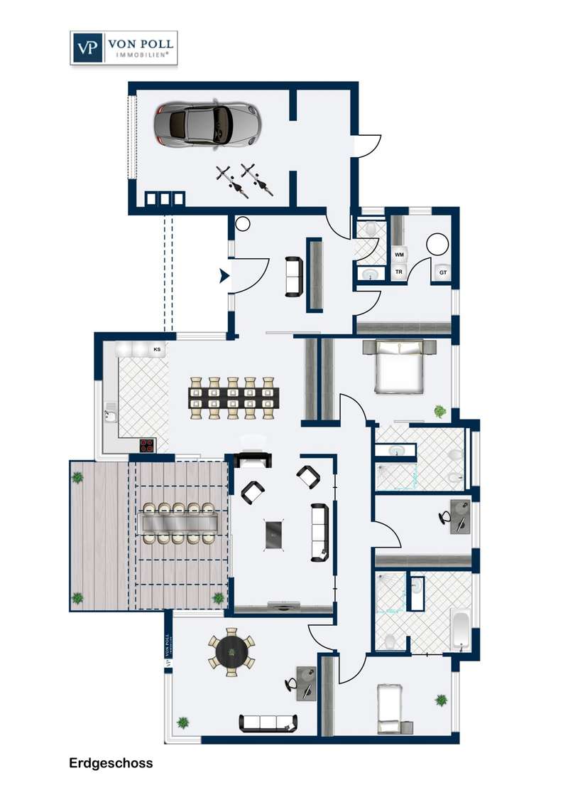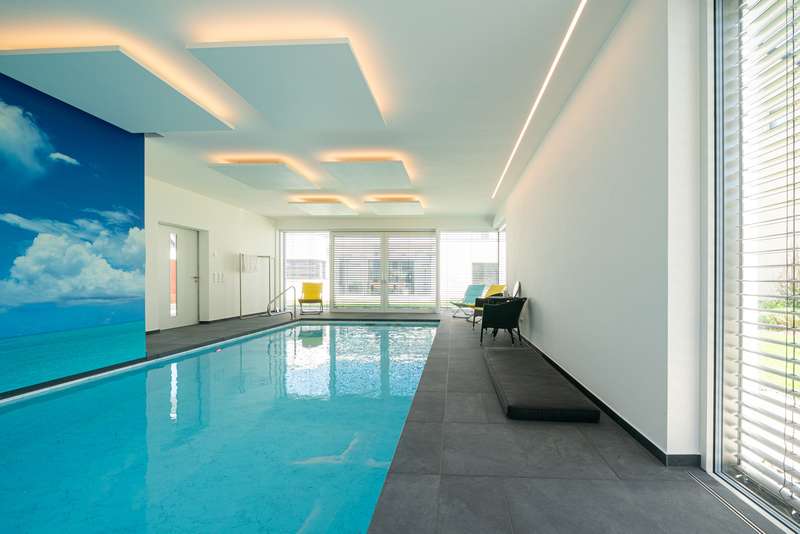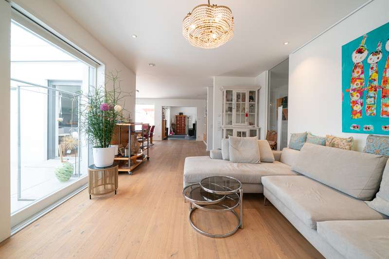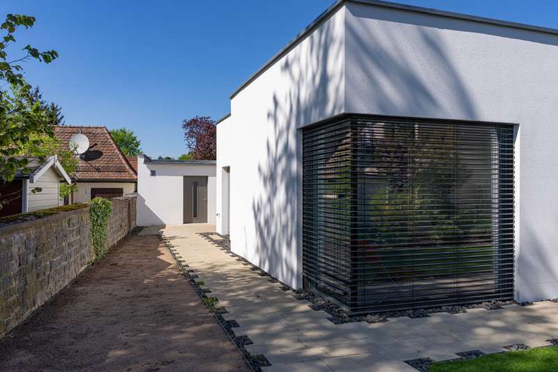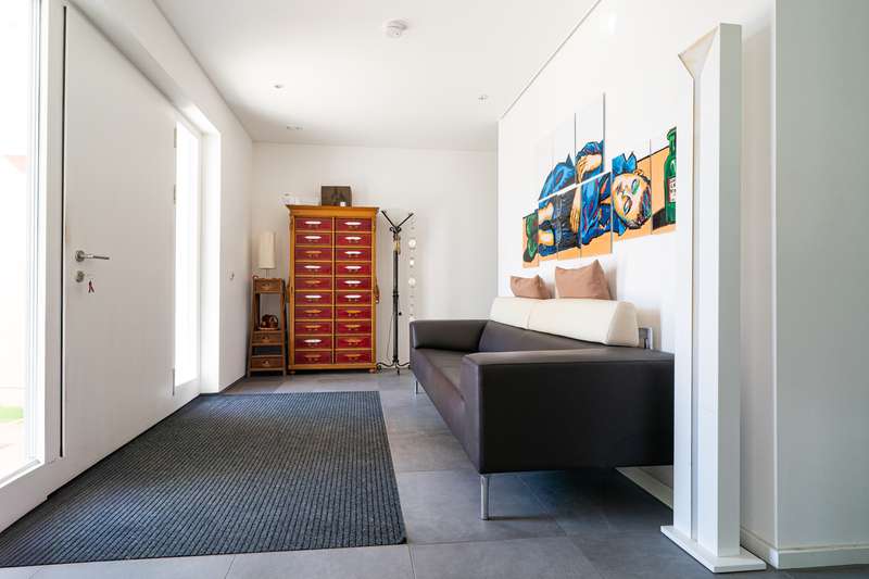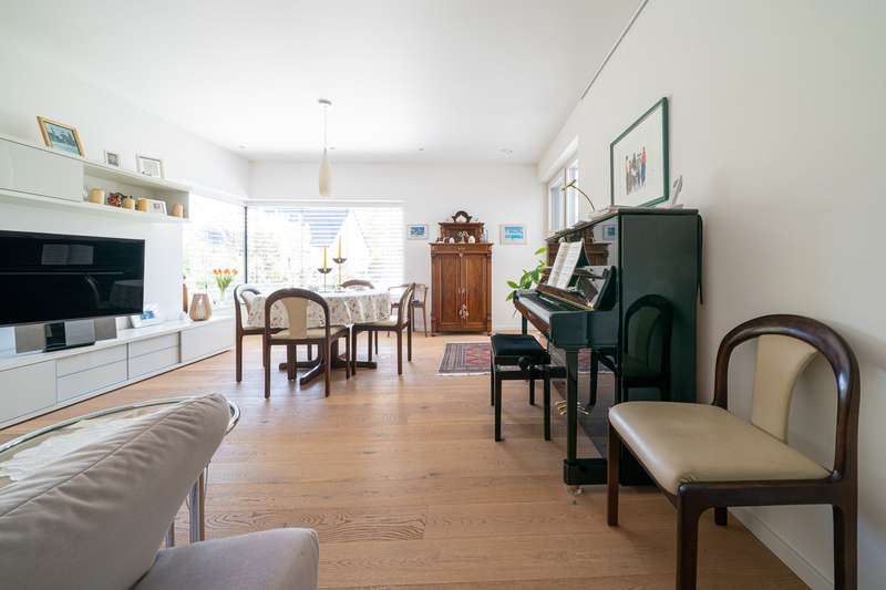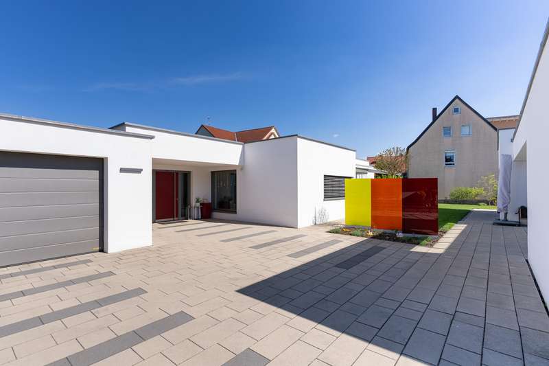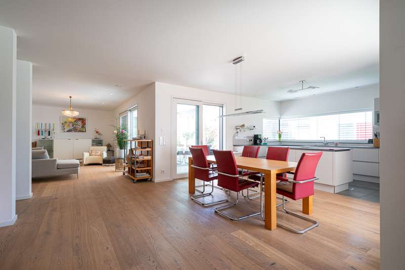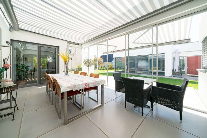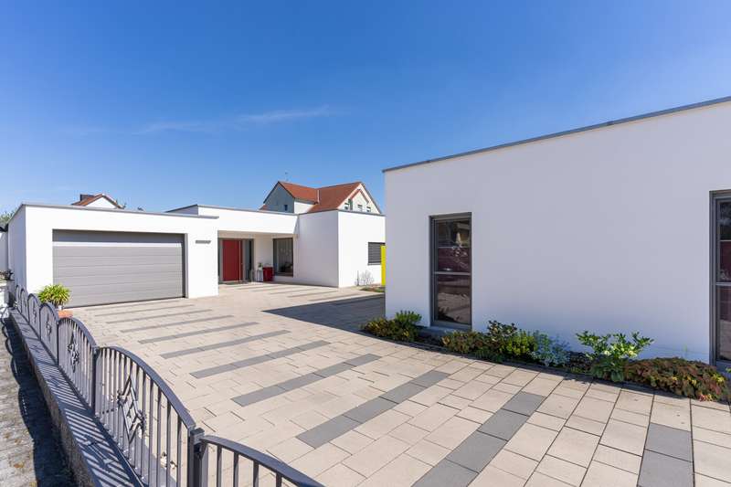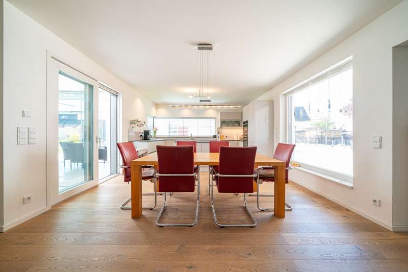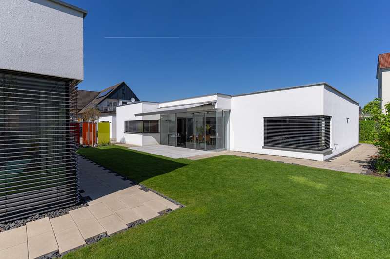 This exceptional property ensemble consisting of two detached bungalows on a spacious plot of approx. 1,154 m² is situated in a quiet location shielded from the street. Built in 2017/2020, the houses combine maximum living comfort with modern architecture, energy-efficient building technology and high-quality fittings on a total living space of around 326 m². The first bungalow offers an extremely spacious and well thought-out room concept with approx. 207 m² of living space. Two elegant living rooms, two bedrooms - each with its own bathroom, one of which has a bathtub - and an open-plan, high-quality kitchen create a stylish living ambience. The light-flooded conservatory with glass front opens harmoniously onto the well-tended garden. This unit also has a large garage with an electric door and a further outdoor parking space. The second bungalow comprises approx. 119 m² of living space and is ideal as a granny apartment, guest area or for separate use. It has a living room and a bedroom, a fully equipped kitchen and a high-quality bathroom. The highlight of this unit is the exclusive pool house with glass façades, all-glass corner windows, wood-aluminum lift-and-slide doors and indoor air conditioning. The heatable, illuminated and coverable pool (8.5 x 3.7 x 1.5 meters) is equipped with modern filter technology and water treatment. A separate bathing and changing room ideally complements the luxurious wellness area. Both bungalows impress with their extensive and well thought-out furnishings. The rooms are equipped with underfloor heating (except for the technical rooms), all windows and French doors are made of fine spruce wood. Aluminum venetian blind elements in plastered wall boxes provide effective sun protection. The controlled living space ventilation with heat recovery via a cross-flow heat exchanger ensures a pleasant indoor climate. The energy supply is provided by a heat pump and a gas boiler in combination with a solar thermal system (both built in 2017). All walls were painted with high-quality, diffusion-open silicate paint. The covered entrance areas offer additional protection and comfort. This property is truly unique - ideal for families, multi-generational living or as a combination of a stylish home and a rental unit. A perfect symbiosis of privacy, design and modern technology at the highest level.