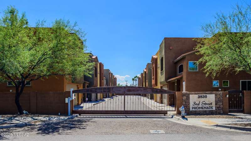 Stunning Central Gated Community, 3BR, 2.5 Baths Lg 2 Car Garage and Over 1500 sqft. (only 14 condo's) Contemporary 2 Story floorplan, has Granite Counters, 18'' tile floorso on first floor, Pantry, Center Island, Open & Light. Most furniture stays. Good investment opportunity, Washer & Dryer included. On third street bicycle path, great central location close to UofA, downtown, shopping medical, etc. Spacious 2 Car Garage. Open views with palm trees and mountain tops. Good lot location and one side is not attached. Guest parking at rear end of street. Low E Dual Pane Windows. A Great place to call Home!