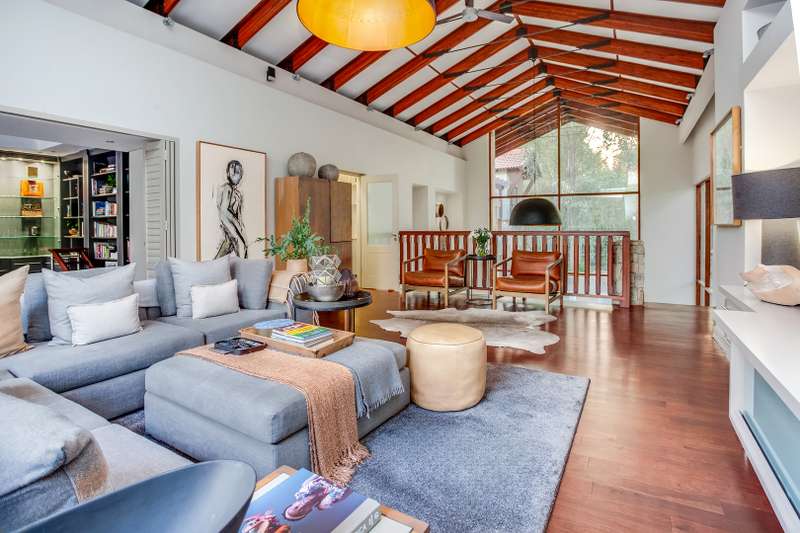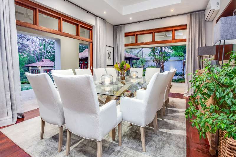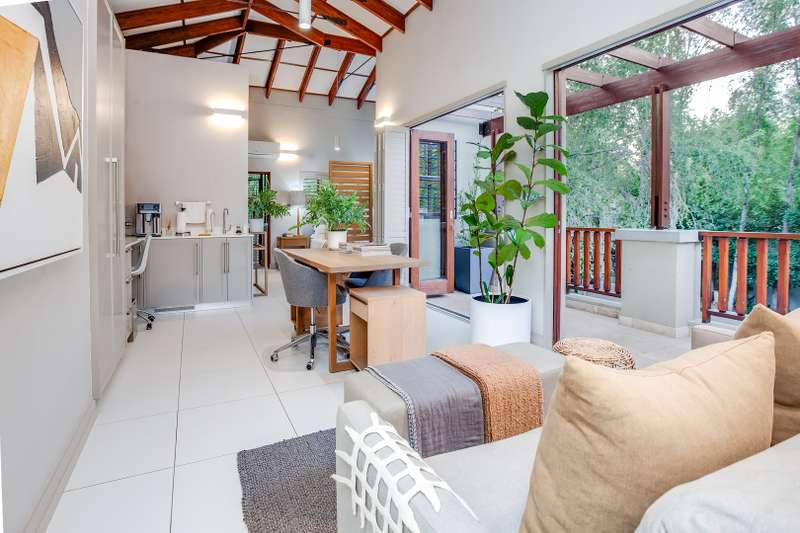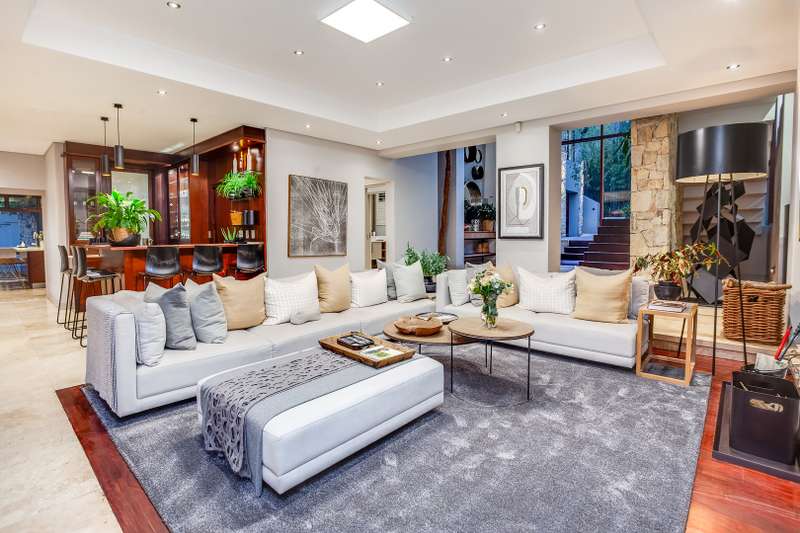 Exquisite Luxury Residence in Tranquil Surrounds Nestled along the serene banks of the Sandspruit River in the heart of Sandton, this architectural masterpiece offers unparalleled luxury, privacy, and modern country living. Key Features: • Riverfront Access: Private entrance to the Sandspruit River, complete with riparian rights. • Garden Oasis: A lush garden seamlessly extends to the river, perfect for peaceful strolls or relaxing in nature. • Art Studio: An all-glass art studio provides abundant natural light and stunning views of the river and forest of old trees. • Chef’s Kitchen: A state-of-the-art, eat-in kitchen with separate walk-in pantry, butler’s pantry and scullery designed for culinary enthusiasts. • Eco-Friendly: Equipped with a large inverter and battery storage connected to solar panels, promoting off-grid functionality. • Dining Spaces: A royal dining room with stacking doors opens to a terrace featuring tranquil ponds, complemented by an indoor/outdoor dining gazebo for summer gatherings. • Guest Suite: A luxurious downstairs guest suite with private entrance, en-suite bathroom, and fitted study overlooking the garden. • Stunning Upper Level: Accessed via a wide teak staircase, the upper floor boasts a spacious TV area with a wood-burning fireplace, a library/reading room, and a fabulous main suite with expansive dressing rooms, a splendid bathroom, steam shower, sauna, and massage room. • Additional Guest Accommodations: A second guest suite with en-suite bathroom and a lounge/dining area/kitchenette offers privacy while remaining accessible to the main house. • Cottages: Versatile living options include a self-contained 2-bedroom, 2-bathroom cottage, and a 1-bedroom cottage with its own entrance. • Entertainment Facilities: A self-contained braai room with a built-in wood-burning braai, gas braai, and extraction hood, alongside a fully fitted gym, refreshment bar, bathroom, sauna, and steam room. • Triple Garage & Workshop: An automated triple garage includes a bespoke wood-panelled workshop, perfect for hobbyists, alongside a double carport and great staff suite. • Security: The property is equipped with excellent security features, including an electric fence, cameras, and alarms, located in a boomed, patrolled area. Interior Features: • Solid teak, travertine and wooden floors • Ample storage • Underfloor heating • Fireplaces • Air conditioning and ceiling fans for all-season comfort This unique home is a nature lover’s paradise in the heart of the city, where no expense has been spared in its design and construction. Perfect for discerning buyers seeking a blend of luxury and tranquility.