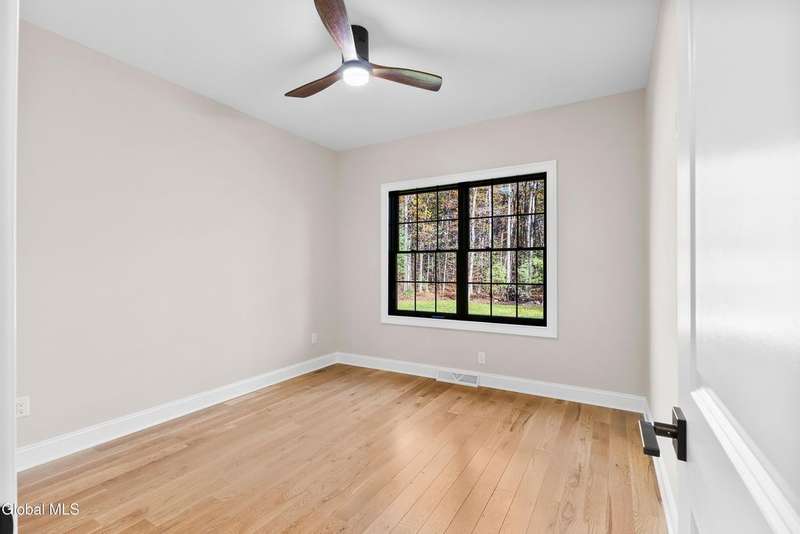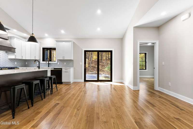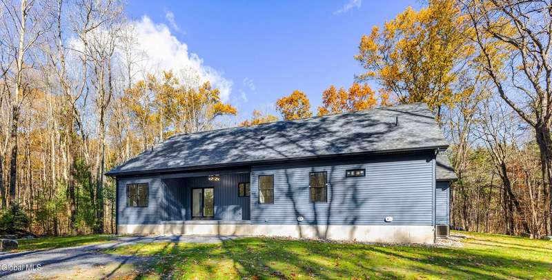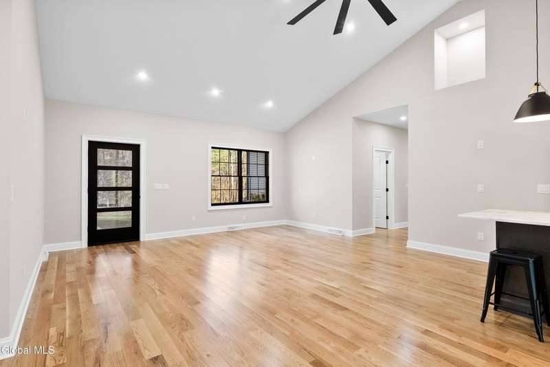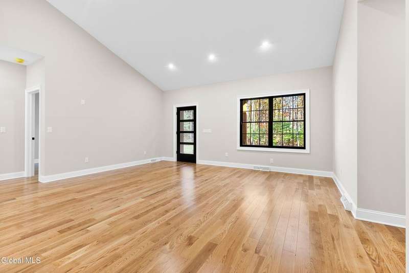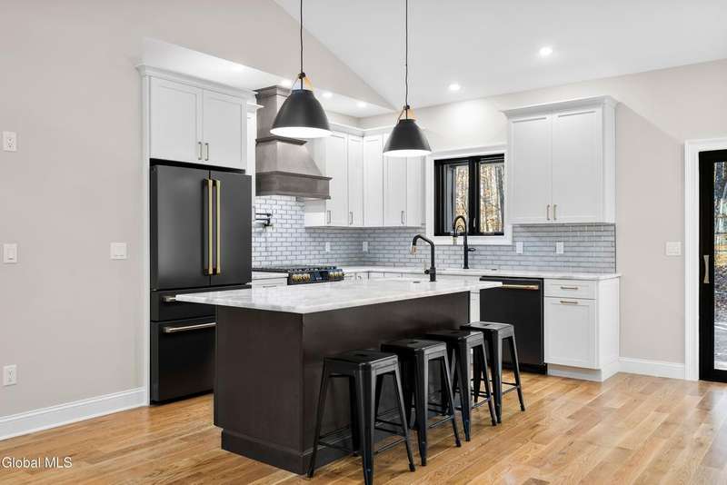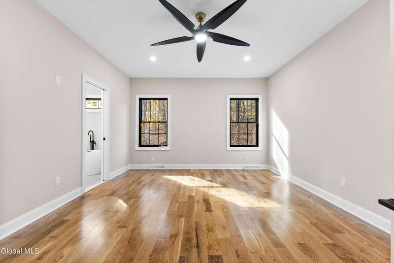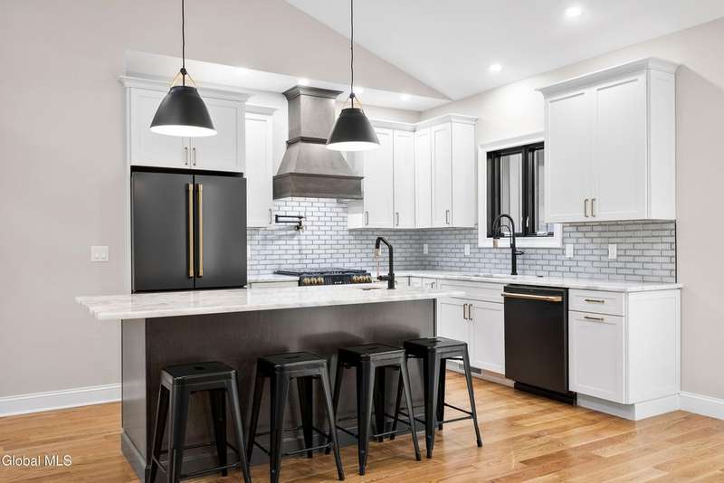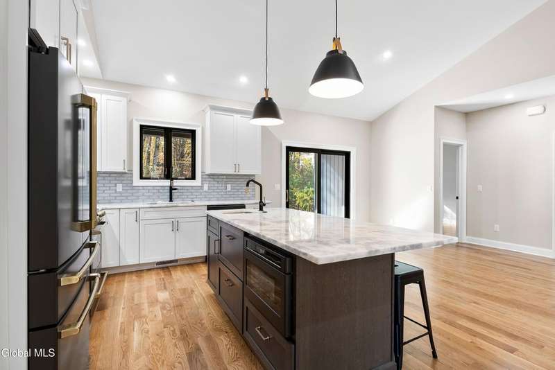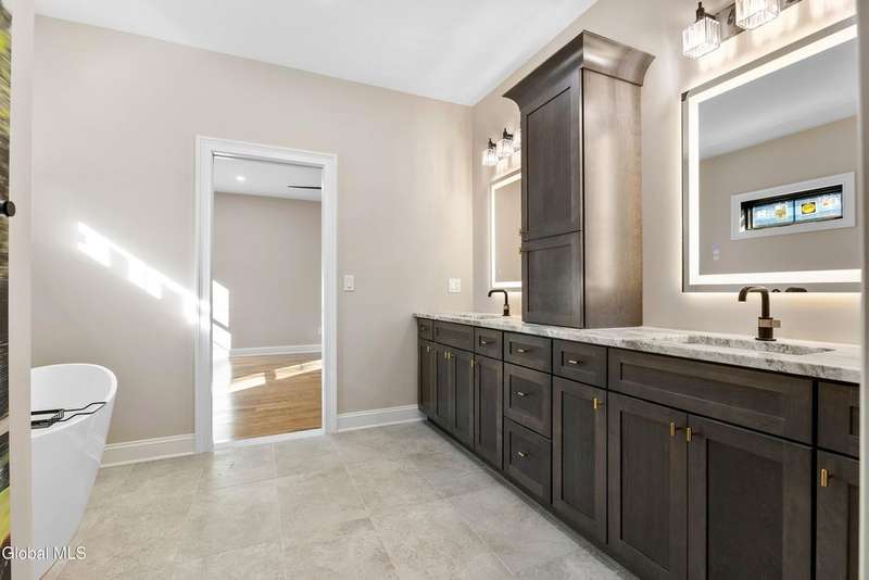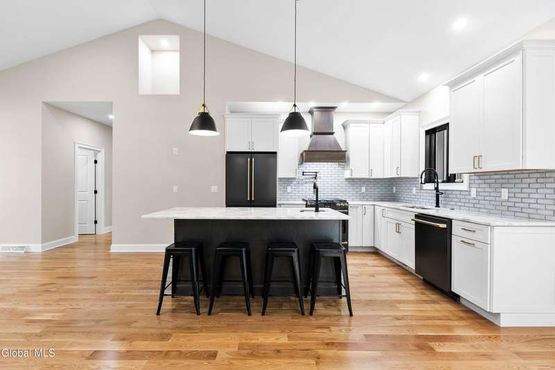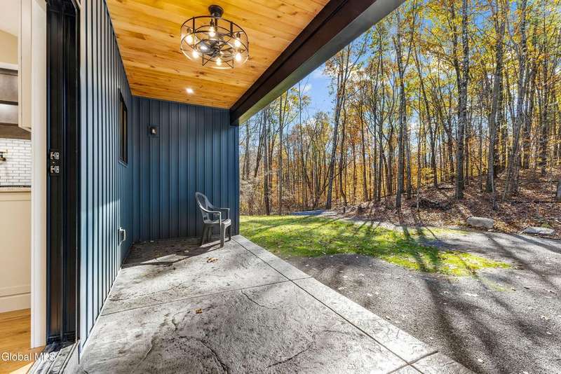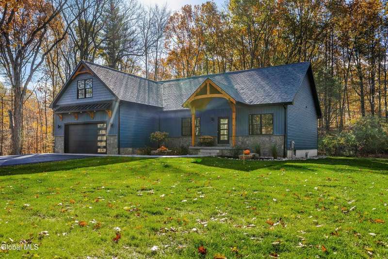 Sophisticated design and exceptional craftsmanship define this exquisite 3-bedroom, 2.5-bath home offering 2,140 square feet on a private 2.1-acre lot moments away from Saratoga Lake. A stunning entry welcomes you through a full-glass front door that fills the home with natural light. The open-concept layout showcases upgraded hardwood floors throughout, creating a seamless flow through living spaces. The designer kitchen is a true showpiece, featuring a beveled glass subway tile backsplash, GE Cafe appliances, two sinks, granite countertops, a pot filler, and a walk-in pantry with built-ins. The cathedral ceiling living room is highlighted by an oversized paddle fan and recessed lighting, offering a bright and airy gathering space. The luxurious primary suite evokes a spa-like retreat with its freestanding soaking tub, rainfall showerhead, frameless anti-fog LED mirrors, and Bluetooth exhaust fan. A first-floor laundry room adds convenience and style, featuring granite countertops and a built-in sink with carbon fiber faucet. Enjoy the finished bonus/office space with glass-panel half-wall. Additionally, the basement has in-law potential, offering a separate entrance, enhanced ceiling height, and plumbing roughed-in for a future kitchen and bath. Enjoy serene outdoor living with covered porches, stamped concrete patios, and lush landscaping?all just minutes from downtown Saratoga Springs.