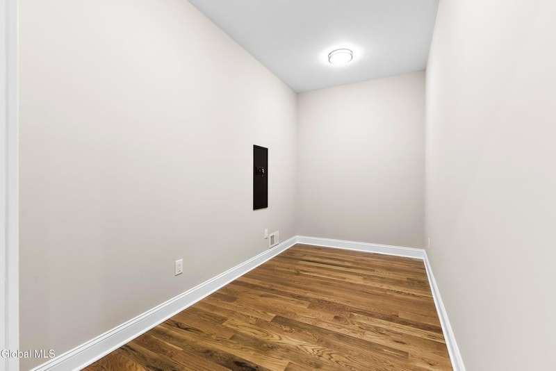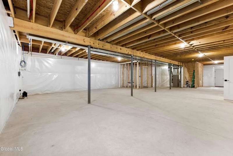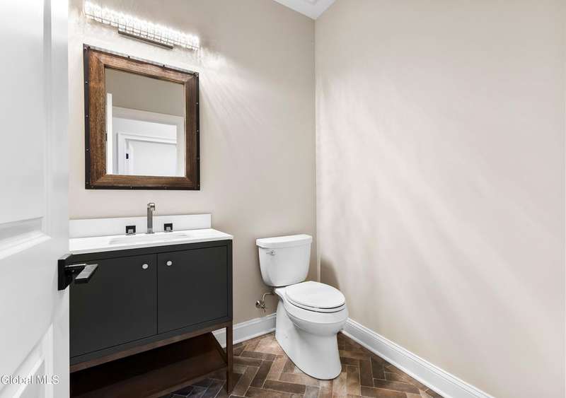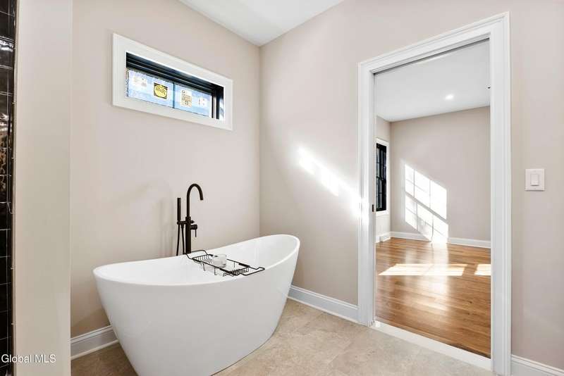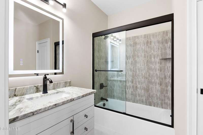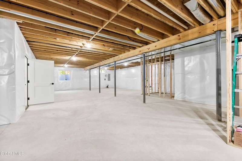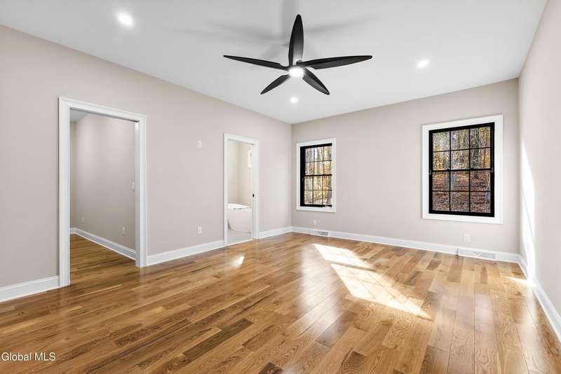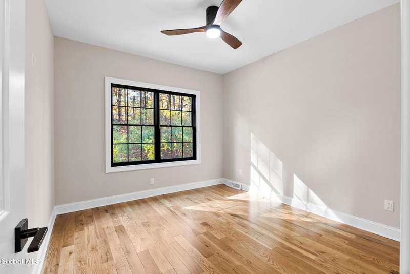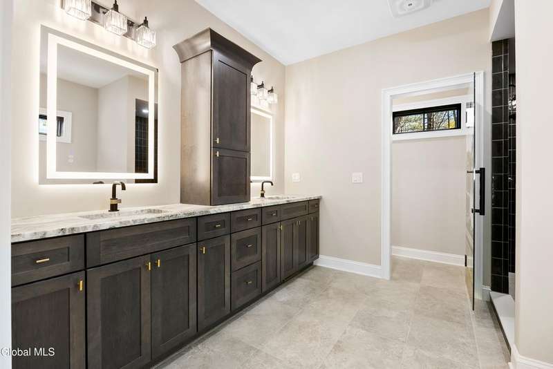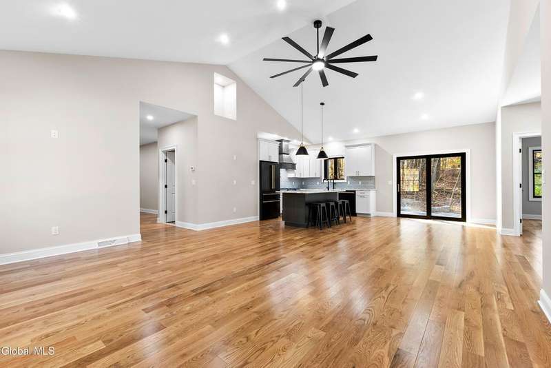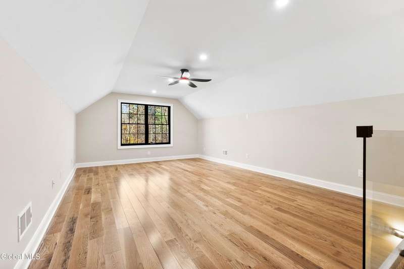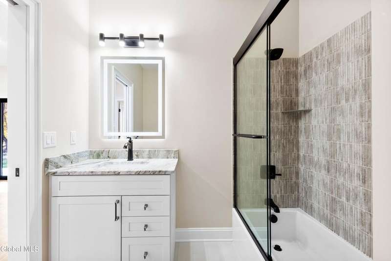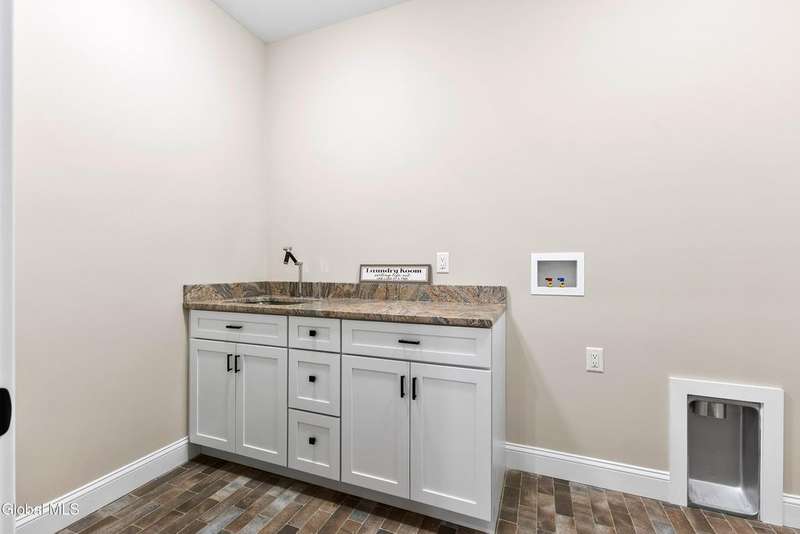 Sophisticated design and exceptional craftsmanship define this exquisite 3-bedroom, 2.5-bath home offering 2,140 square feet on a private 2.1-acre lot moments away from Saratoga Lake. A stunning entry welcomes you through a full-glass front door that fills the home with natural light. The open-concept layout showcases upgraded hardwood floors throughout, creating a seamless flow through living spaces. The designer kitchen is a true showpiece, featuring a beveled glass subway tile backsplash, GE Cafe appliances, two sinks, granite countertops, a pot filler, and a walk-in pantry with built-ins. The cathedral ceiling living room is highlighted by an oversized paddle fan and recessed lighting, offering a bright and airy gathering space. The luxurious primary suite evokes a spa-like retreat with its freestanding soaking tub, rainfall showerhead, frameless anti-fog LED mirrors, and Bluetooth exhaust fan. A first-floor laundry room adds convenience and style, featuring granite countertops and a built-in sink with carbon fiber faucet. Enjoy the finished bonus/office space with glass-panel half-wall. Additionally, the basement has in-law potential, offering a separate entrance, enhanced ceiling height, and plumbing roughed-in for a future kitchen and bath. Enjoy serene outdoor living with covered porches, stamped concrete patios, and lush landscaping?all just minutes from downtown Saratoga Springs.