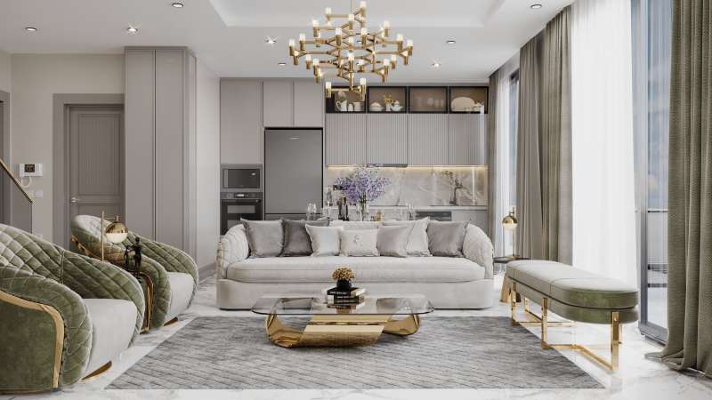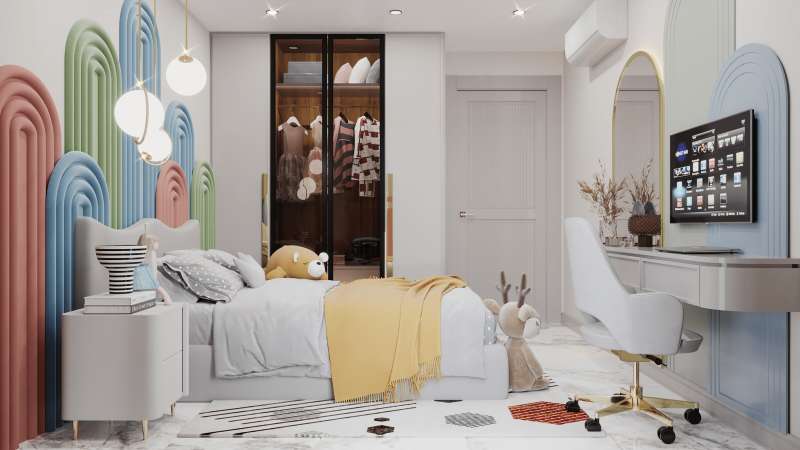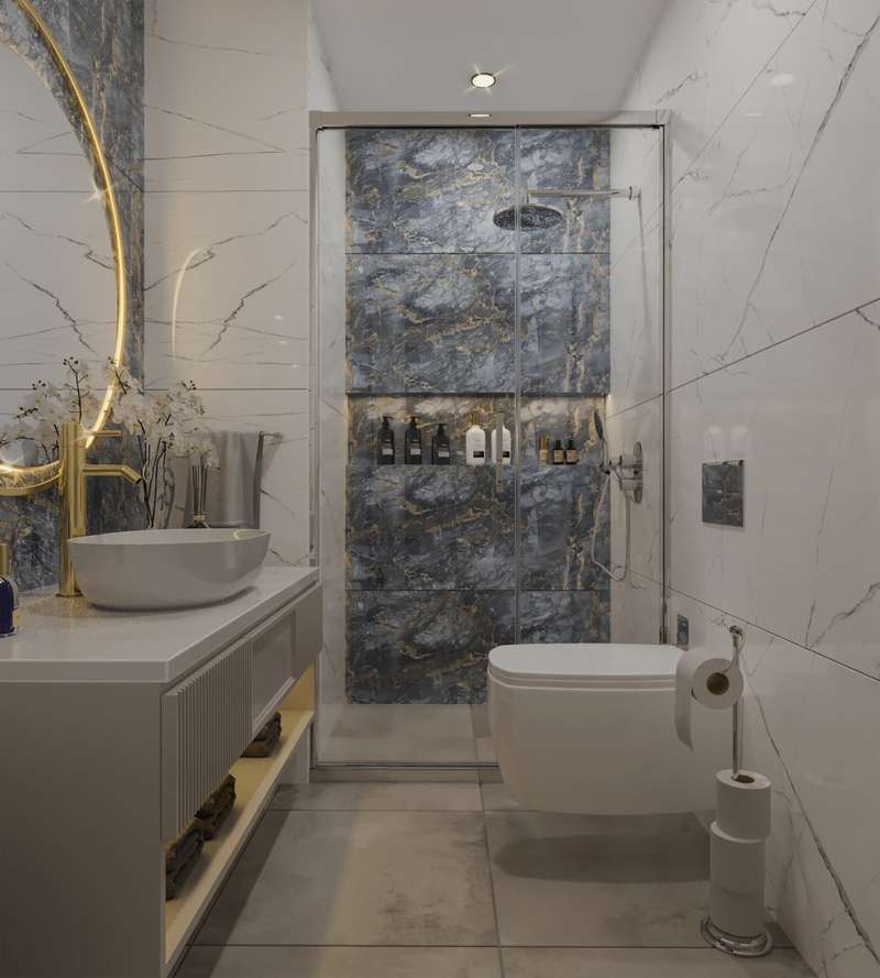 The apartments are equipped with first-class quality materials with steel doors, video intercom, kitchens and bathrooms with built-in furniture, entrance hall with built-in wardrobe, white goods package (refrigerator, dishwasher, electric stove, oven, hood, washing machine), air conditioning in every room, underfloor heating, bathroom, shower cabin, and electric water heater.