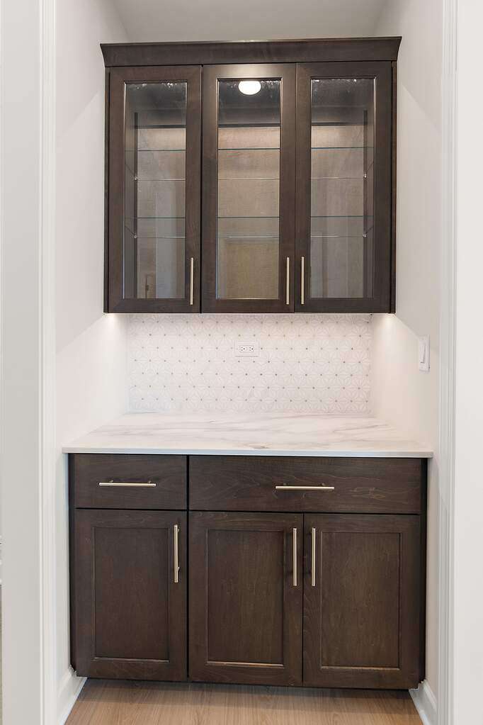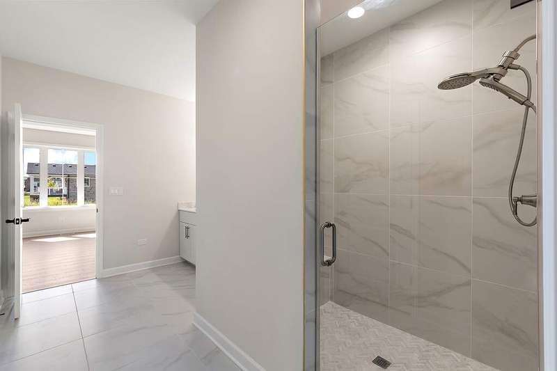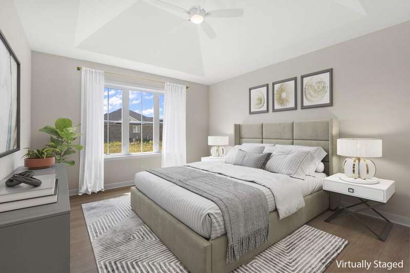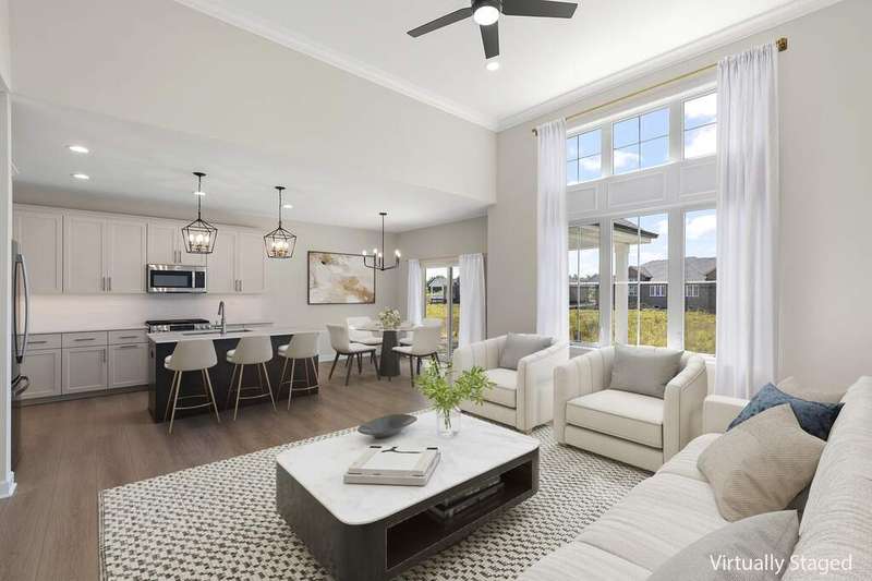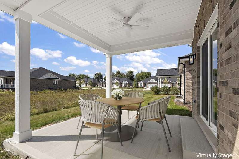 Welcome to your perfect retreat, an exquisite ranch villa nestled in a tranquil setting with picturesque views of a peaceful retention pond. This thoughtfully designed home features a sophisticated exterior, blending classic brick with durable LP SmartSide siding, premium Pella 250 series windows, and a spacious 12 x 12 covered patio ideal for outdoor relaxation. A beautifully designed interior will greet you as you enter through the grand 8' door with a secure 3-point locking system. The kitchen is a true masterpiece, featuring 42" off white cabinets, gleaming quartz countertops, a tiled backsplash, under-cabinet lighting, and a generous walk-in pantry for all your culinary needs. Adjacent to the kitchen, the family room welcomes you with soaring vaulted ceilings and refined crown molding. At the same time, the adaptable layout includes a charming dining room with crown molding and a butler pantry for those special gatherings. The luxurious primary suite is a personal retreat, offering a tray ceiling, comfort-height double vanity, a stunning 6' curbless seated shower, and a large walk-in closet with abundant storage space. Additional highlights include Hallmark vinyl-plank flooring in the main areas, 8' doors, crown molding, and wainscoting throughout the foyer for a grand touch, as well as an open basement staircase with rough-in plumbing ready for customization. Additional features include casing around windows, cased openings, and a laundry sink in the cabinet. Ideally located near shopping and major expressways, this villa offers both elegance and everyday convenience. Different floor plans and locations are available.