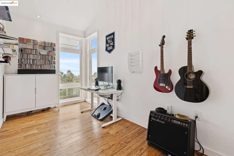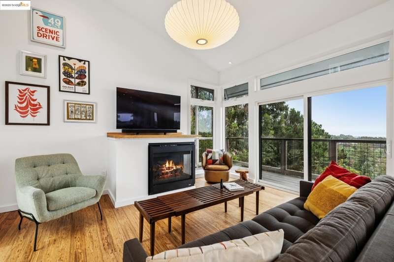 Perched in Oakland’s coveted Sequoyah Hills, this striking modern home feels like a luxe treehouse with panoramic water and skyline vistas. Soaring ceilings and views from every room! Completed in 2020, the home blends sleek design with refined comfort. A vaulted, skylit entry opens to a sun-drenched great room with floor-to-ceiling windows, gas fireplace, and seamless flow to a wraparound view deck and lower patio with built-in seating and firepit, perfect for relaxed entertaining. Downstairs, three airy bedrooms and an office boast high ceilings and enjoy bay views through 8' tall windows, alongside a spacious bonus room ideal for a media lounge, gym, or studio. Luxury finishes and modern systems elevate every detail: in-floor radiant heating, solar power with battery backup and EV charging, smart dim-to-warm lighting, solid-core pocket doors, chef’s kitchen with gas range and soft-close cabinetry, and WUI-rated exterior for wildfire safety. Nature lovers will relish the surroundings and nearby regional parks with hiking trails. Set on a private ¼-acre lot with two off-street parking spaces and bike storage, this home offers tranquility, technology, and timeless sophistication, all moments from Sequoyah Country Club and the Oakland Zoo. Open Oct. 25 & 26, 2:00-4:00PM.