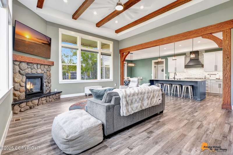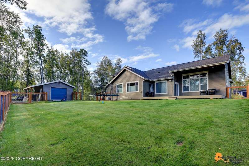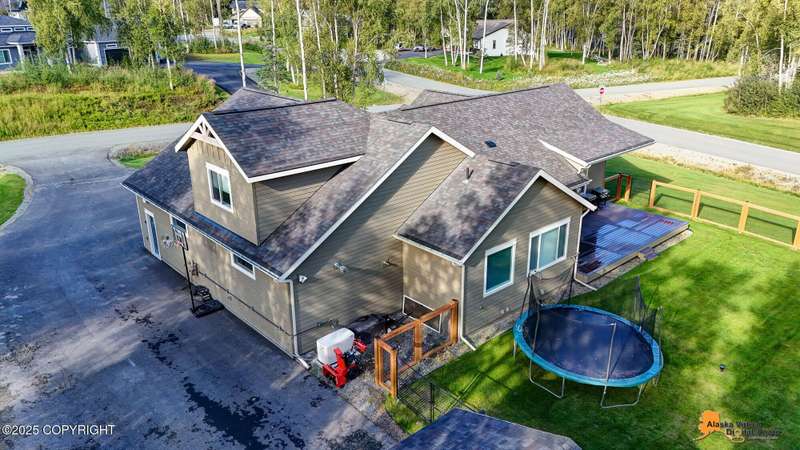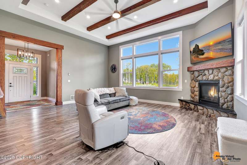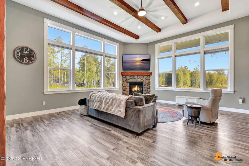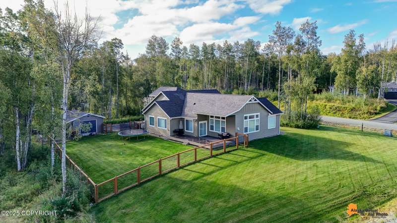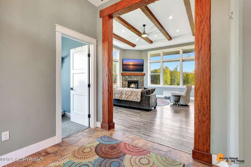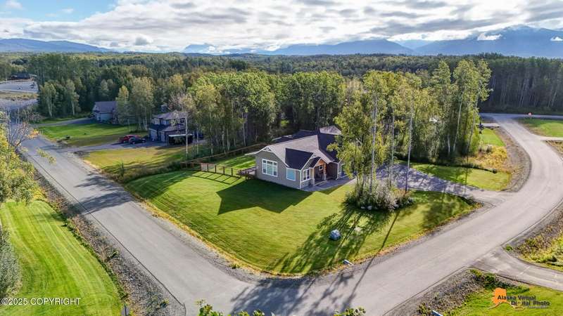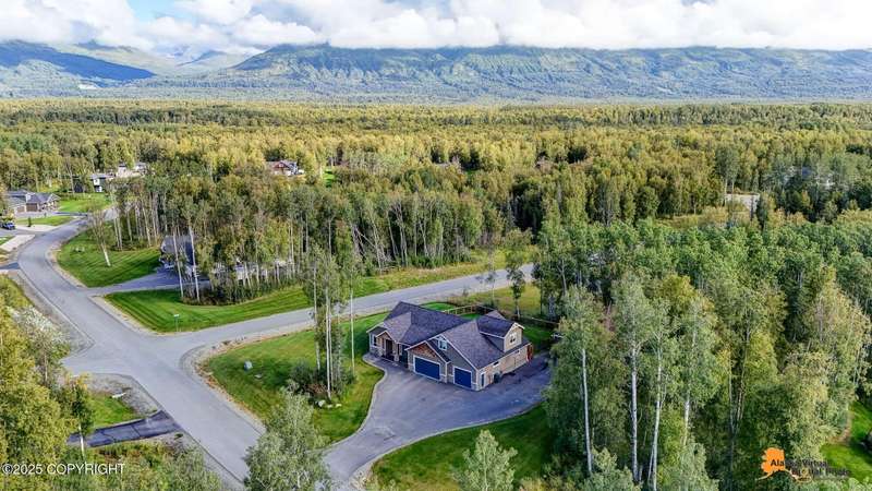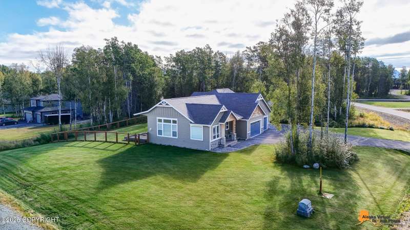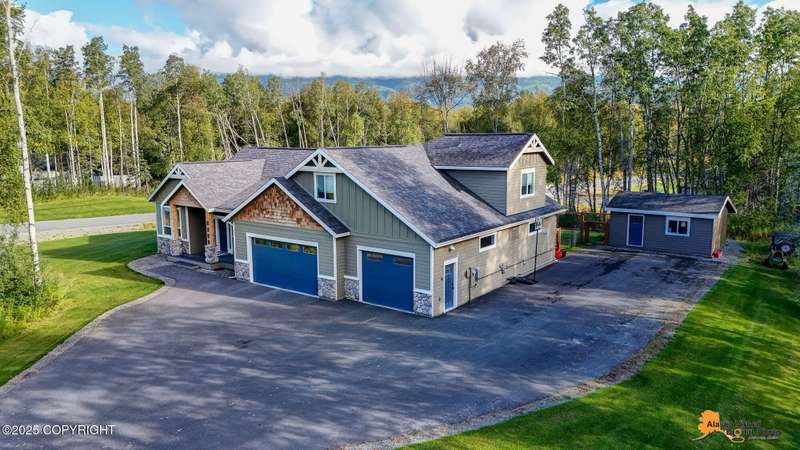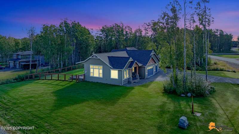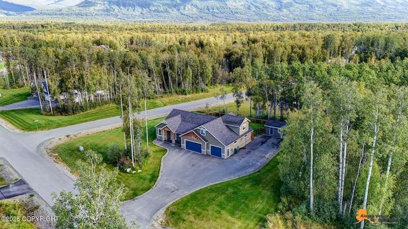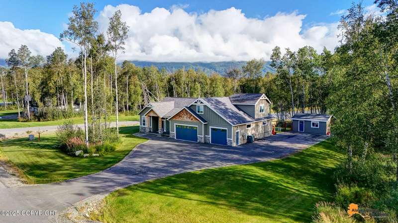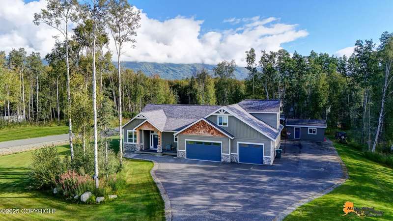 Welcome to this beautifully crafted 4 bedroom home located in one of the most prestigious neighborhoods in the Palmer Fishhook area. Built by award-winning JDL Design, this residence showcases exceptional craftsmanship and luxury finishes throughout. Step through the gorgeous timber-frame front entry into an open-concept living space featuring a cozy fireplace, spacious kitchen with walk-in pantry, and a 4th bedroom that could easily be used as a dedicated office or homeschool room. The luxurious main-floor primary suite offers a peaceful retreat, while large windows throughout the home capture beautiful mountain views. Upstairs, you'll find two oversized bedrooms, a full bath with copper accents, and a versatile bonus roomideal as a den, media room, or playroom. Outside, enjoy Alaska's beauty from your covered back deck, ideal for year-round enjoyment. The nicely landscaped and fully fenced backyard offers privacy and space to unwind. Additional features include extra RV parking, extensive paving, and an incredible 1,200 sq ft garage with a 42'' x 16' oversized third bayperfect for all your toys and storage needs. Don't miss this rare opportunity to own a truly exceptional home in one of Palmer's most sought-after neighborhoods.